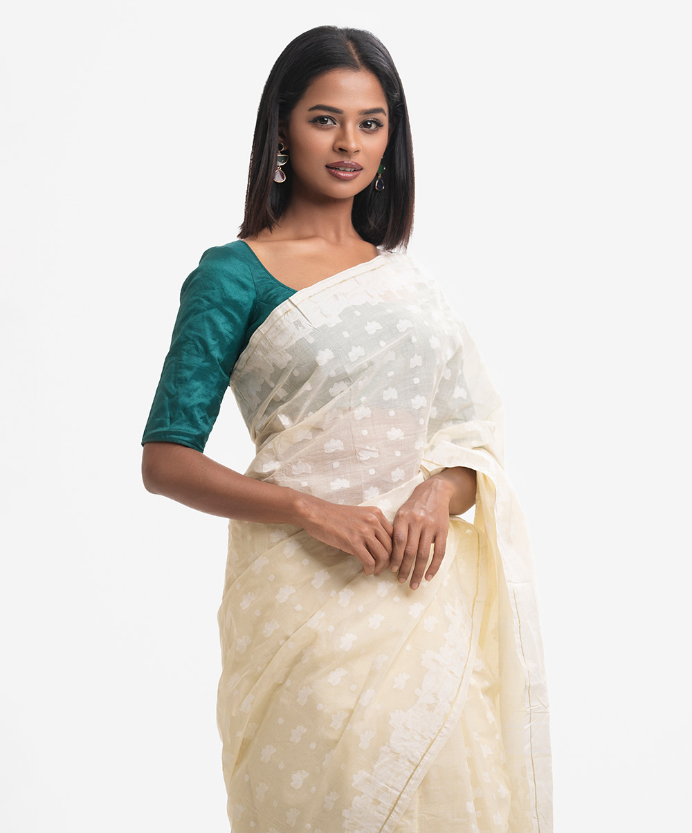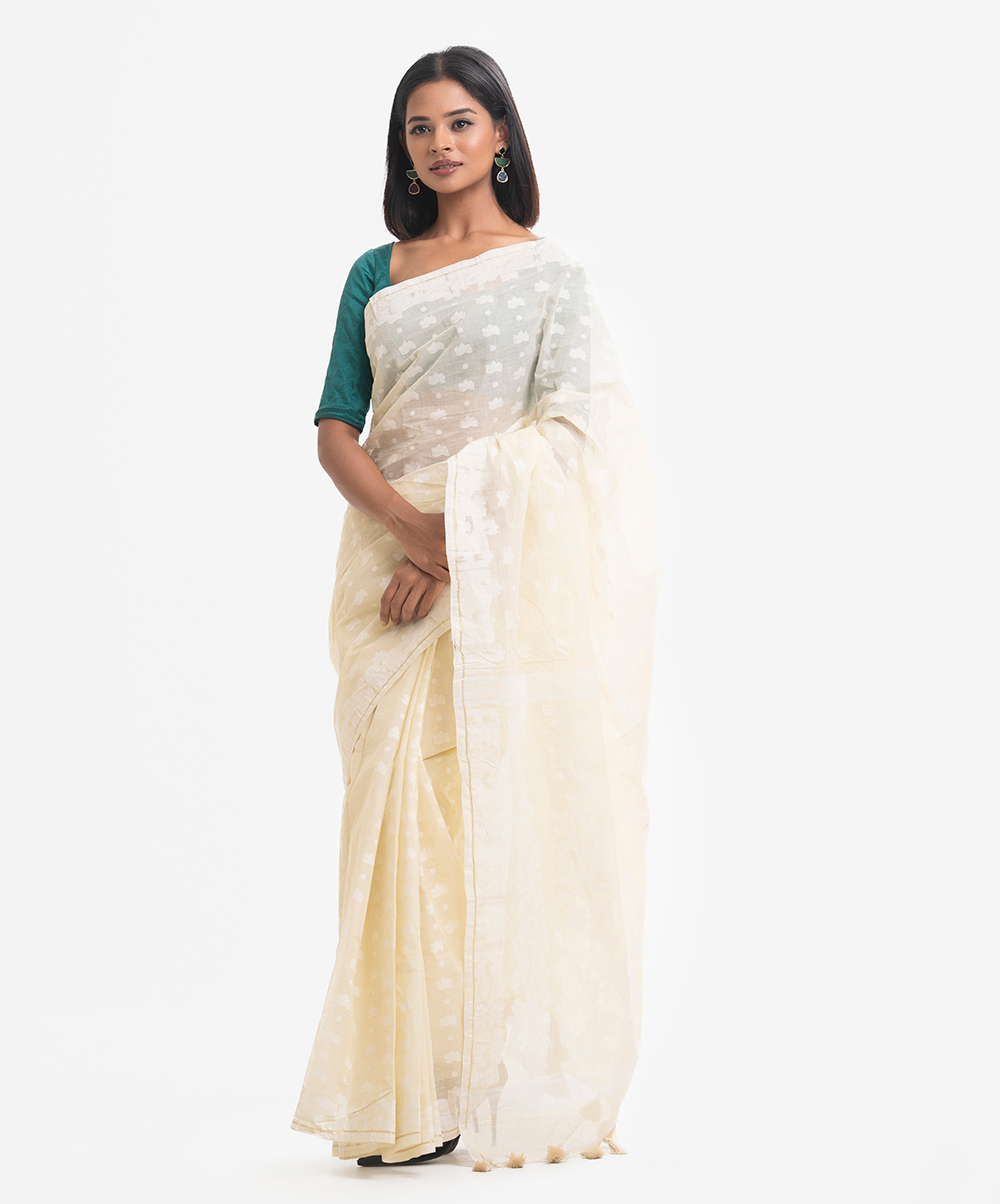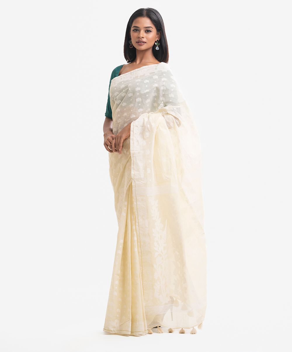 All-over weaving details saree in cotton fabric. Tassels at the Aanchal.