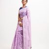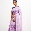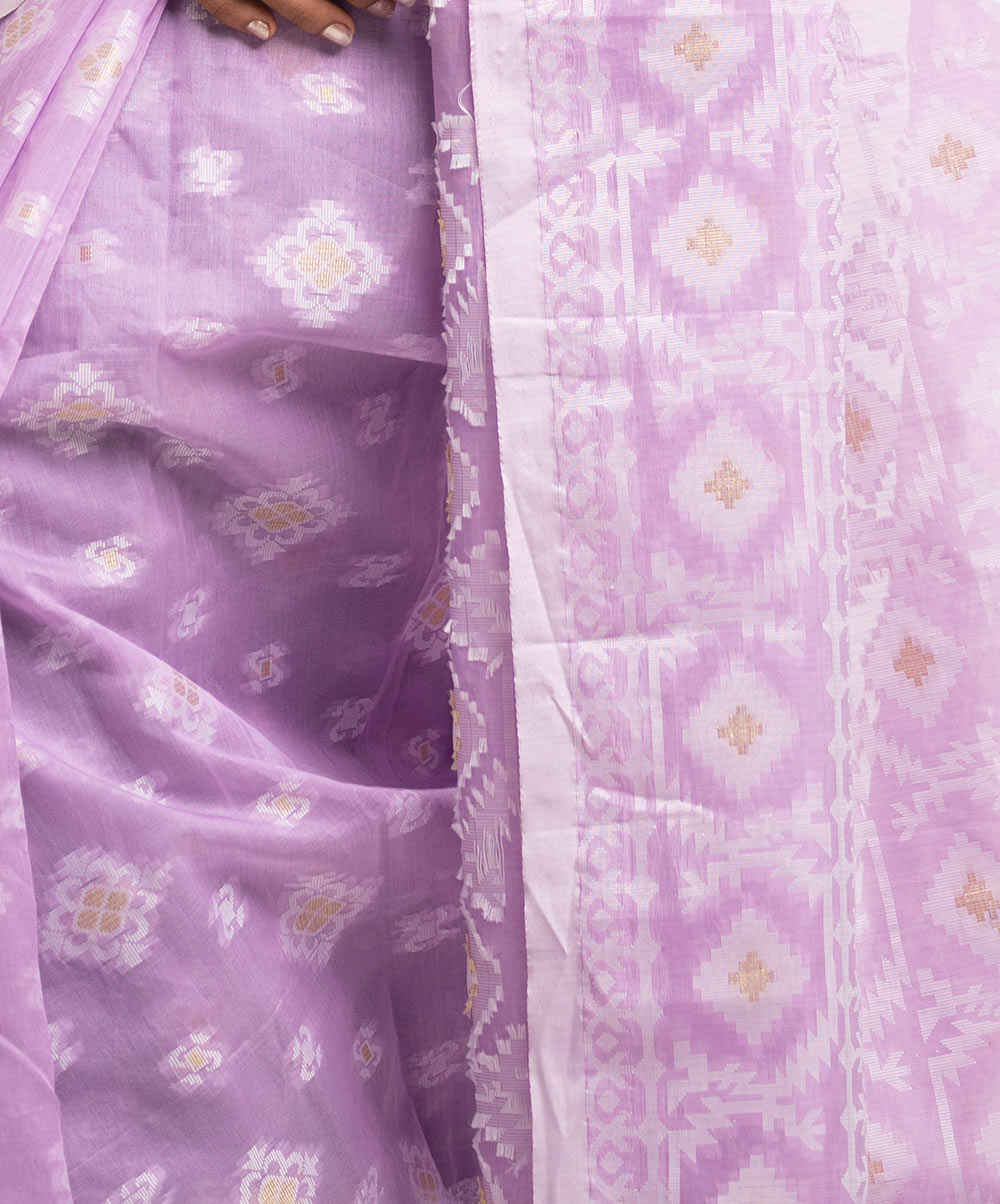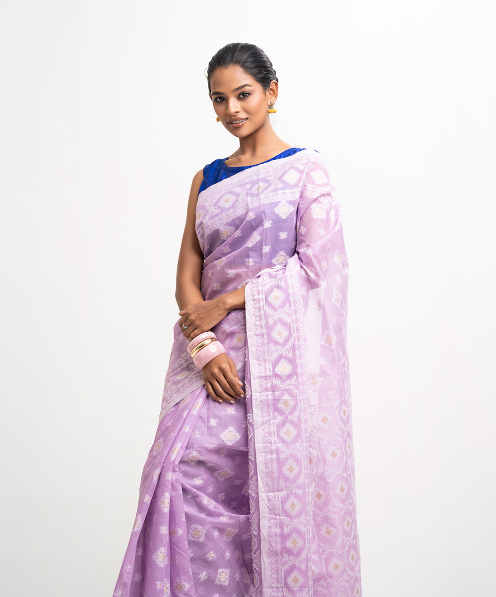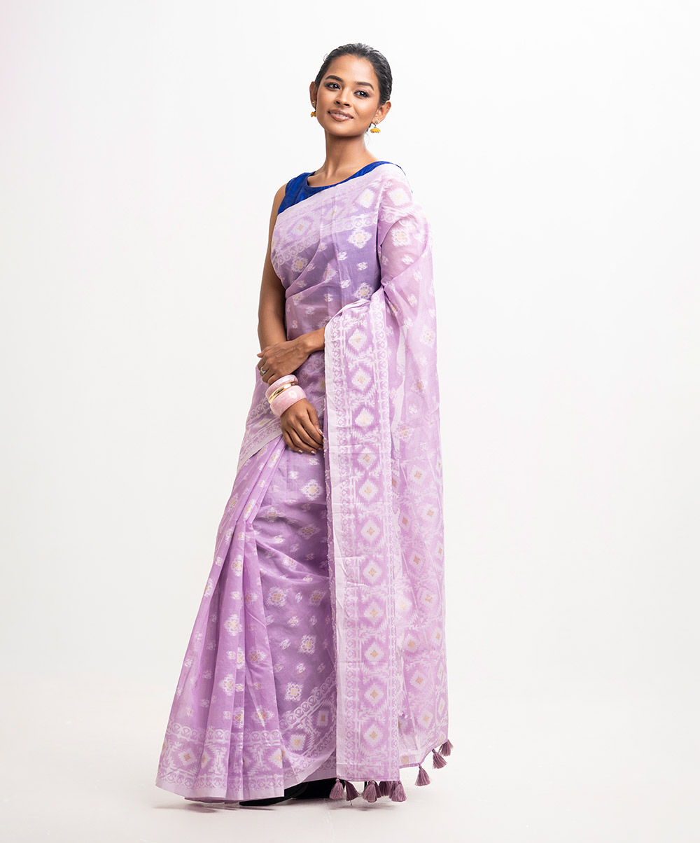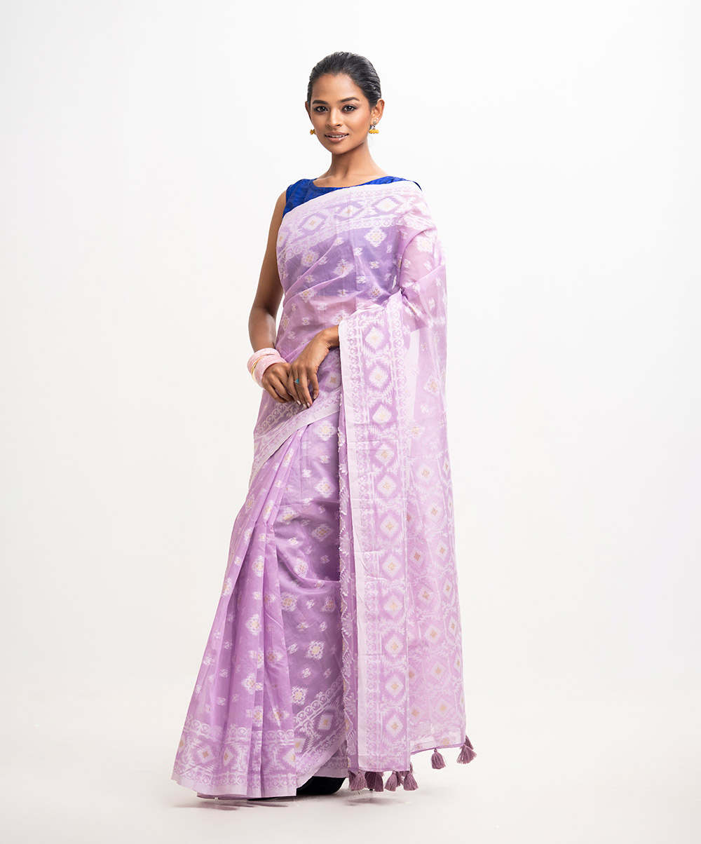 All-over jamdani pattern weaving details saree in half-silk fabric. Tassels at the Aanchal.