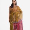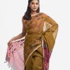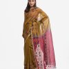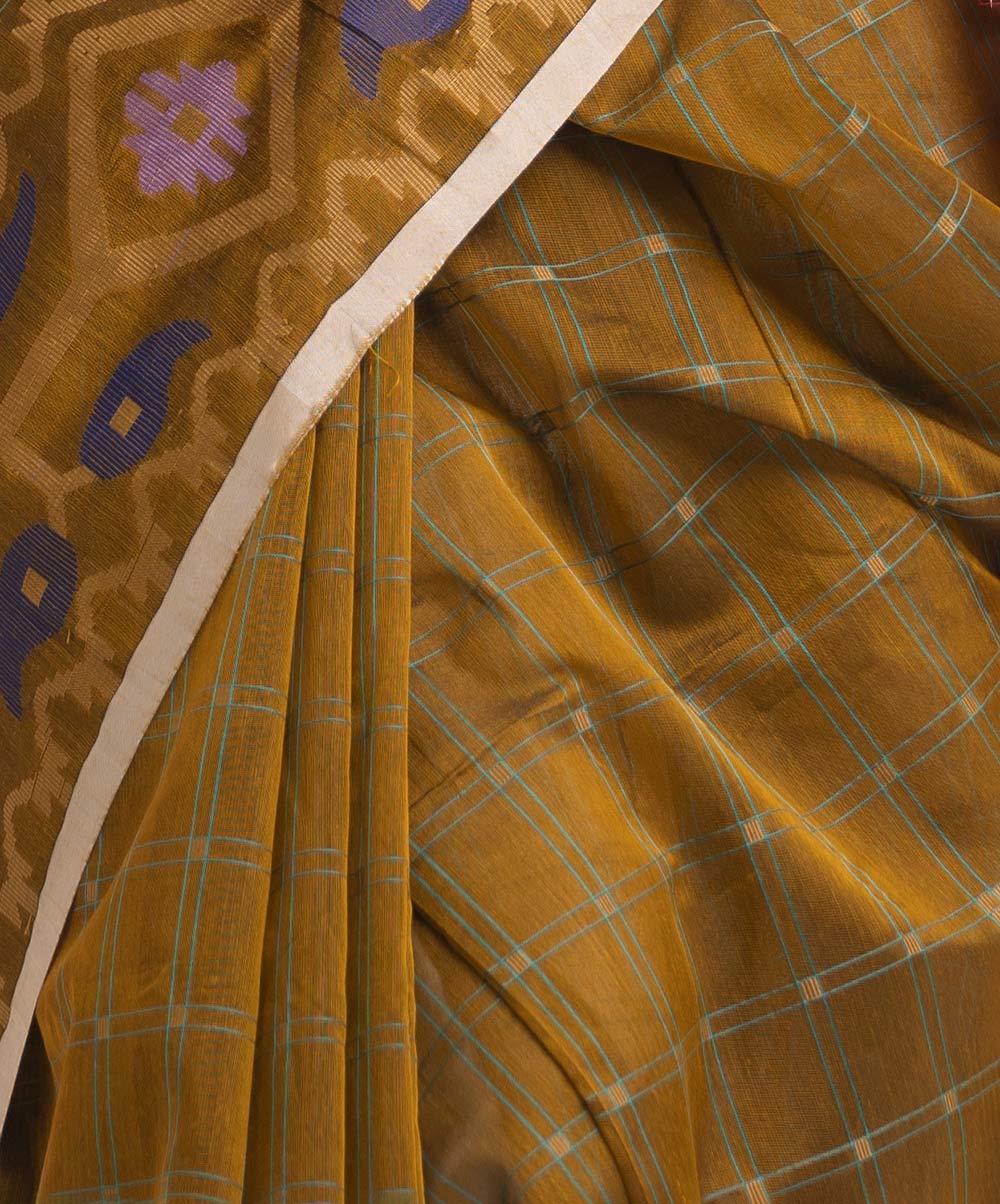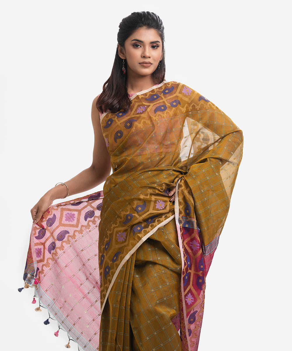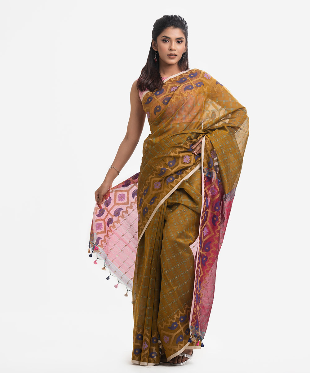 All-over weaving details saree in half-silk fabric. Golden thread detail and tassels at the Aanchal.