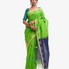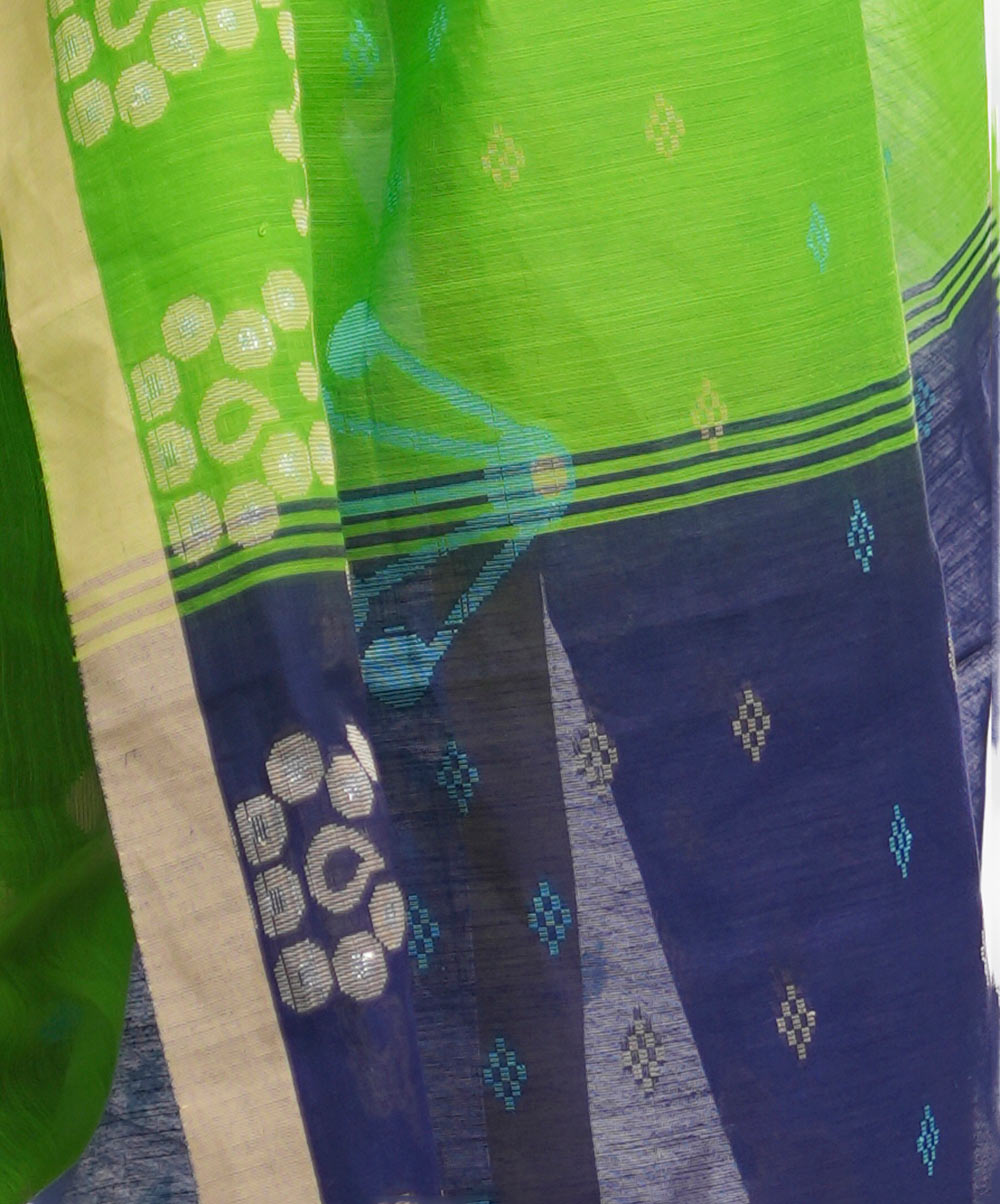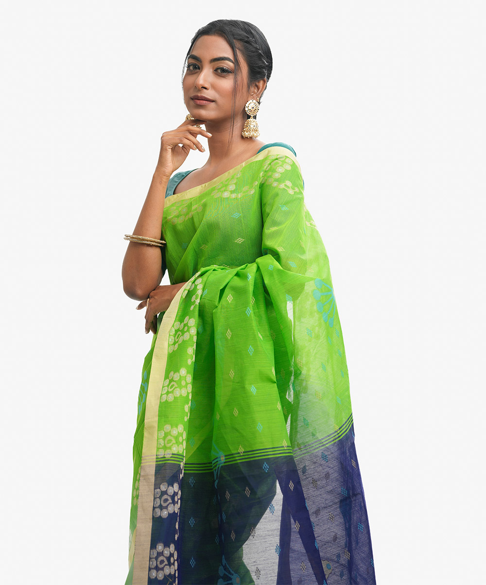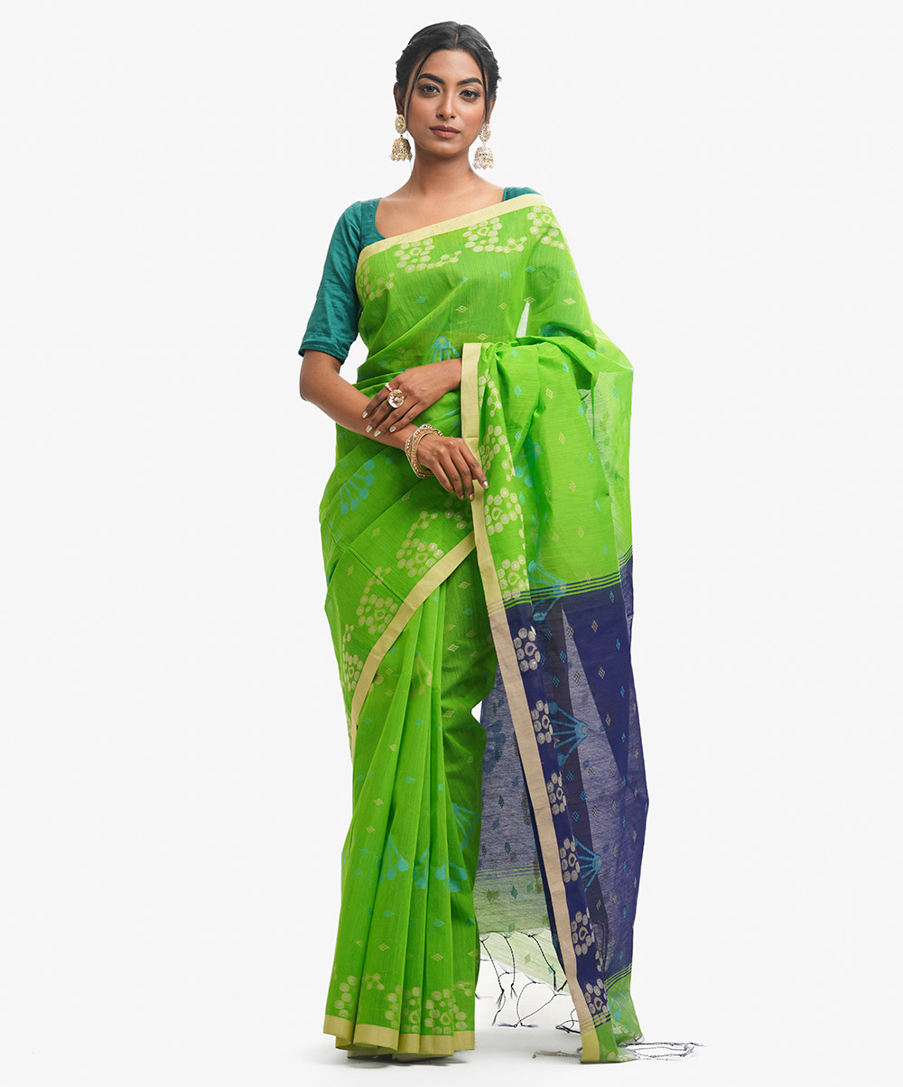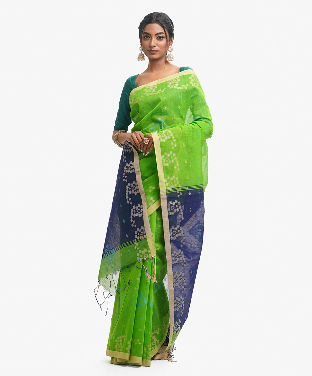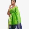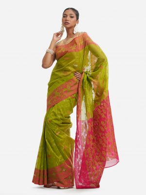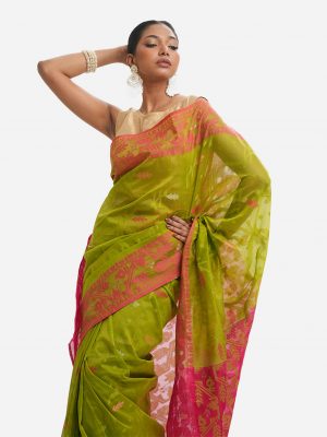 All-over weaving details saree in half-silk fabric. Frill trim at the border of Aanchal.