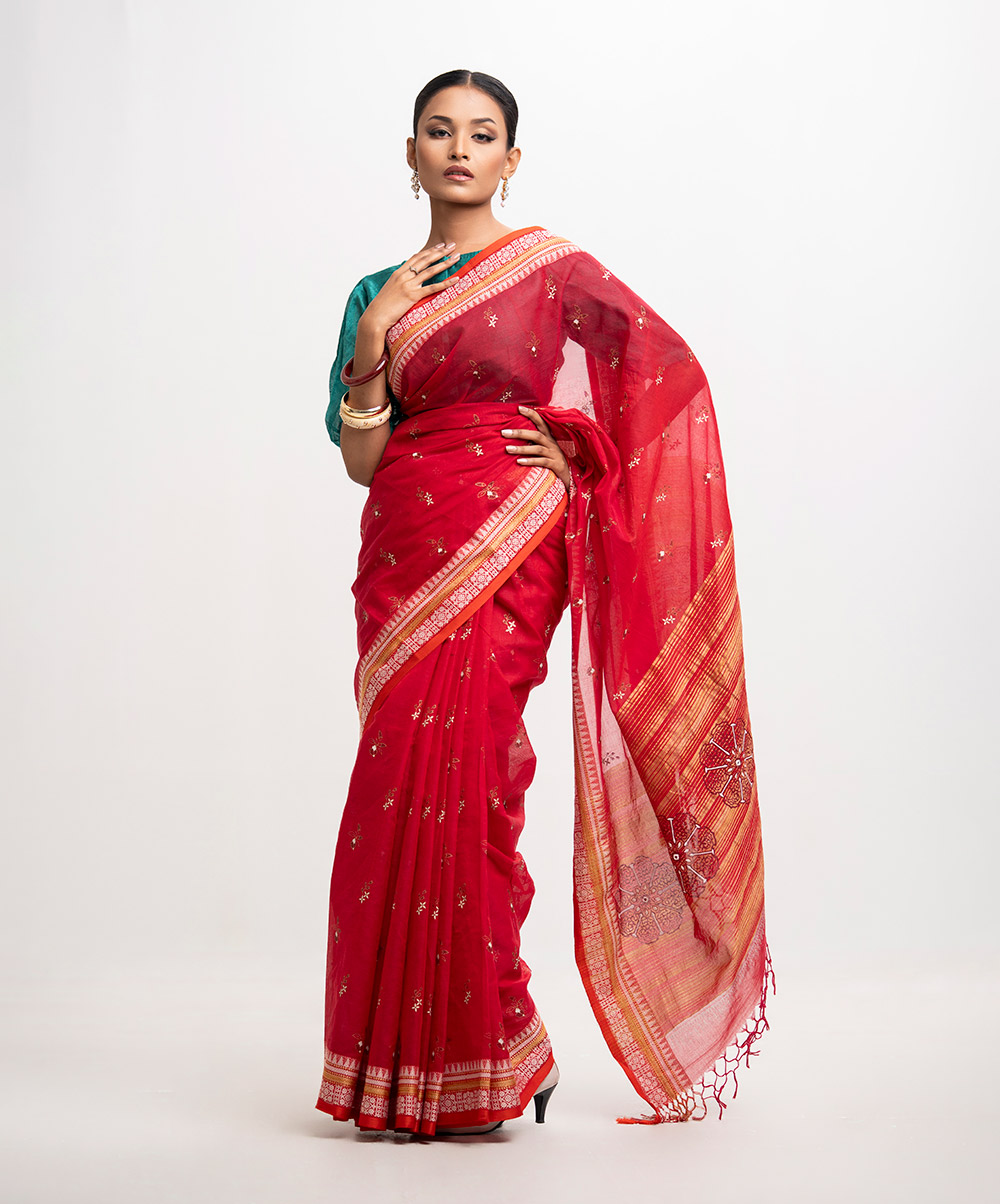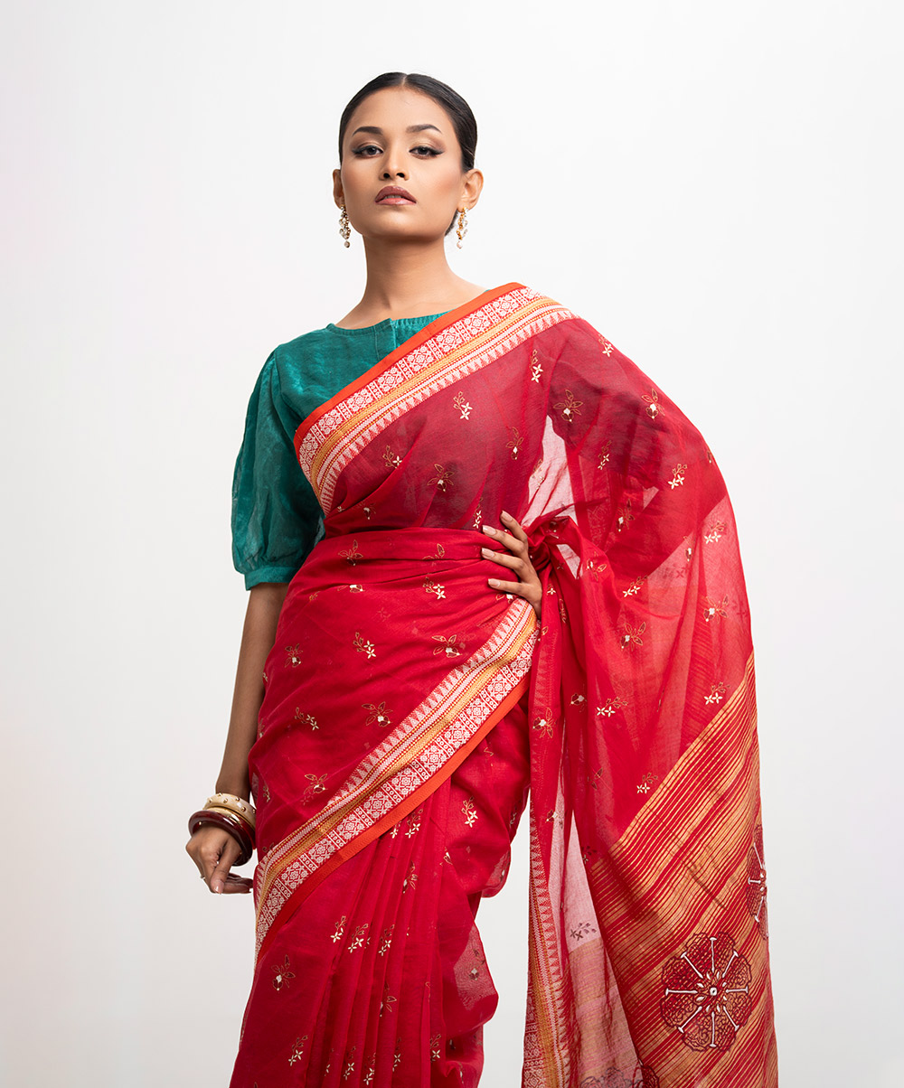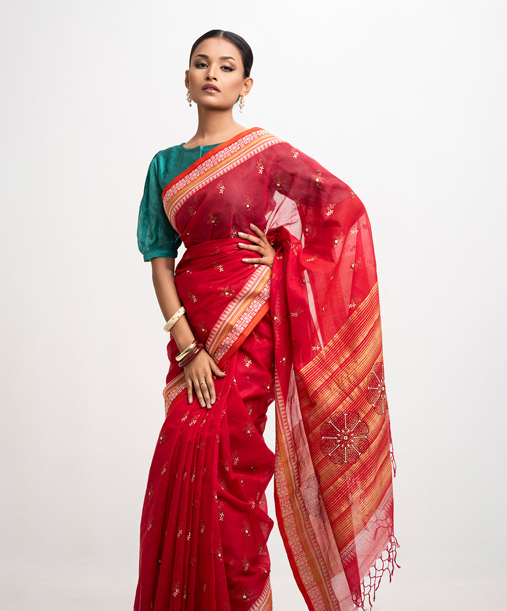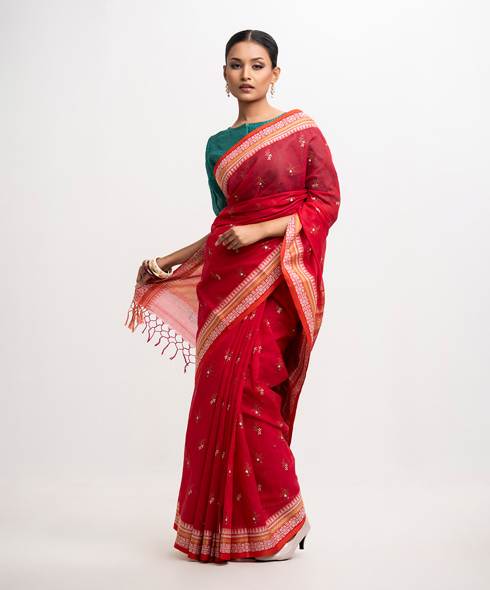 All-over printed saree in cotton fabric. Embroidery & fringe trim at the Aanchal.