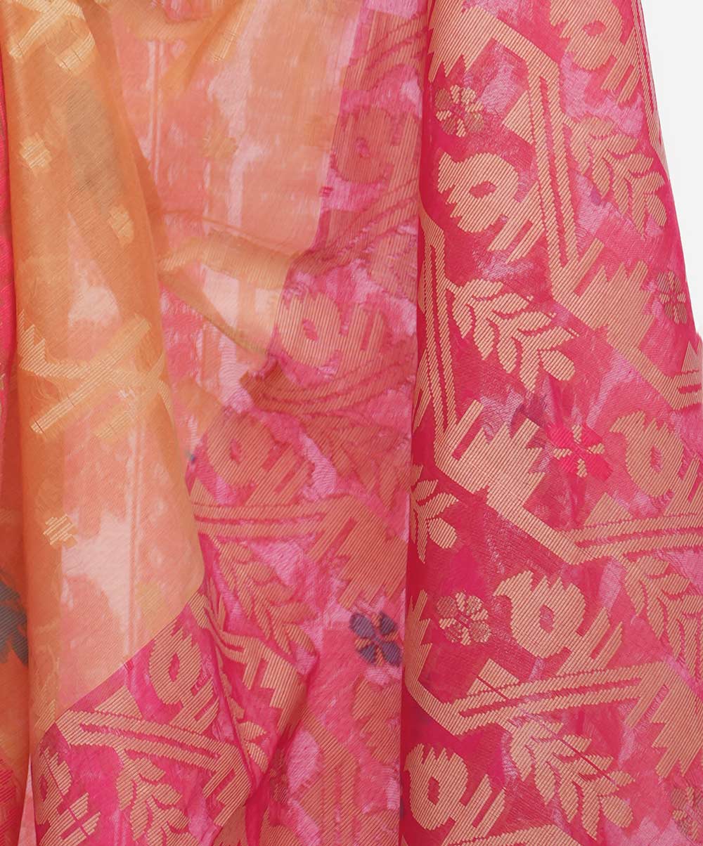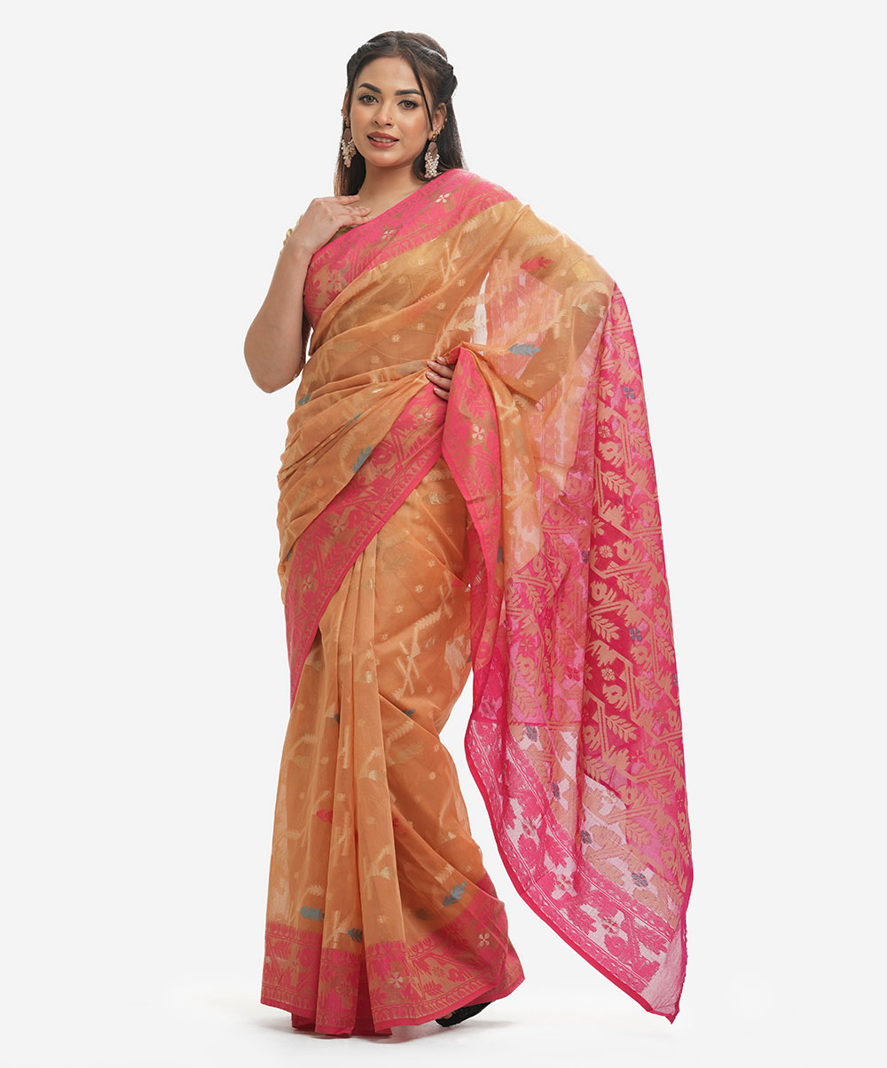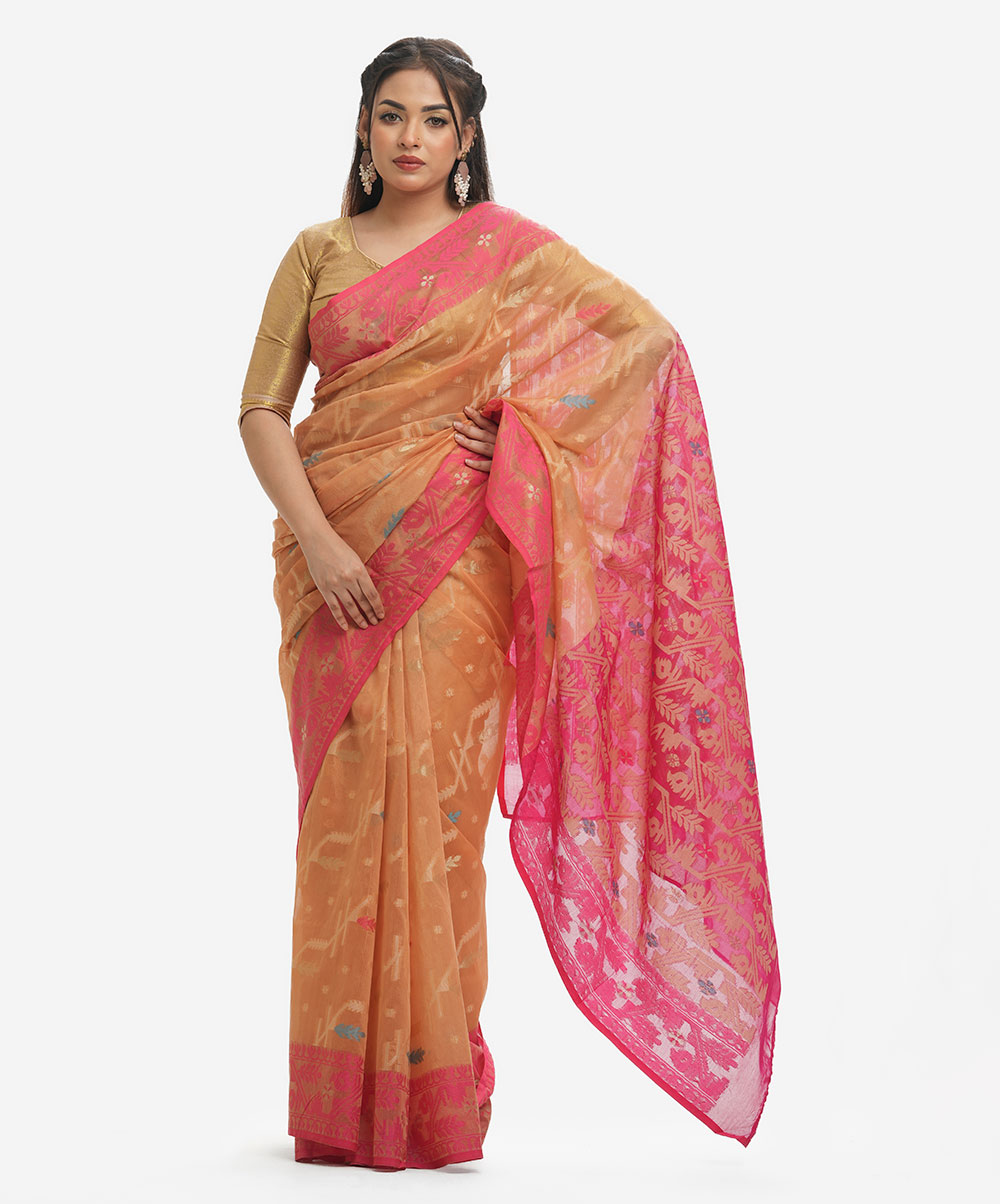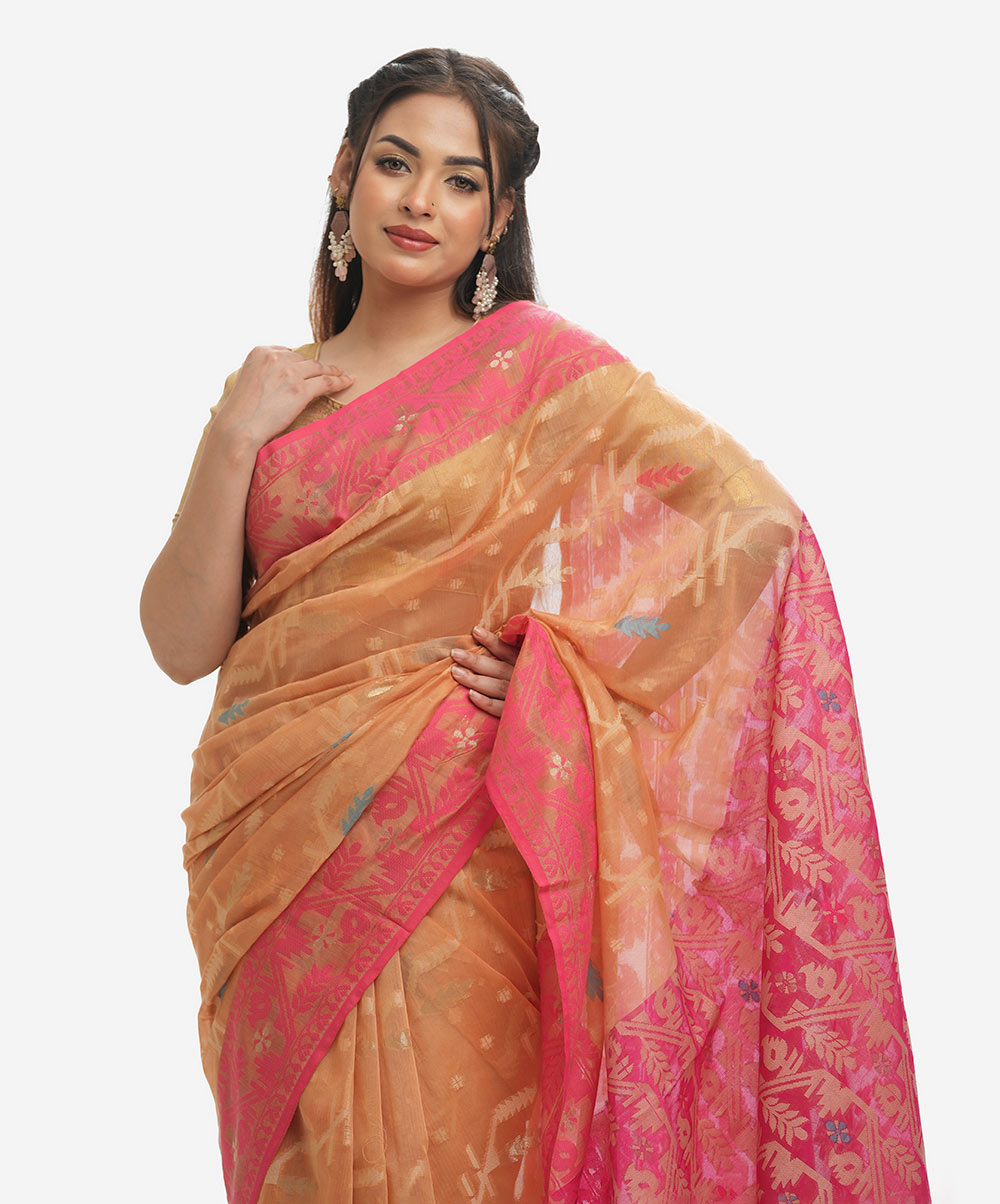 All-over weaving details saree in cotton fabric. Golden thread detail at the Aanchal.
