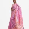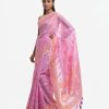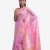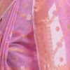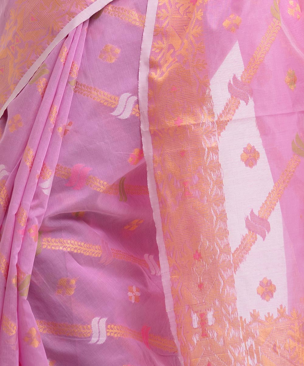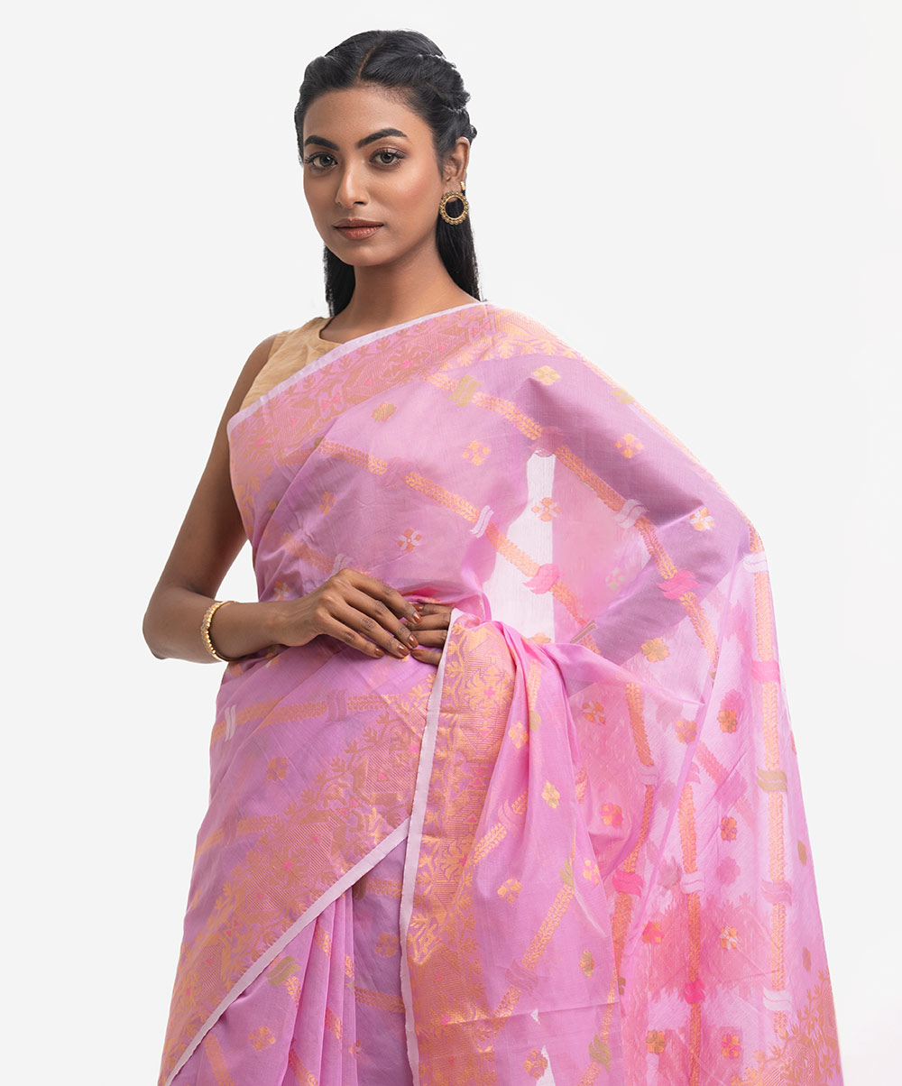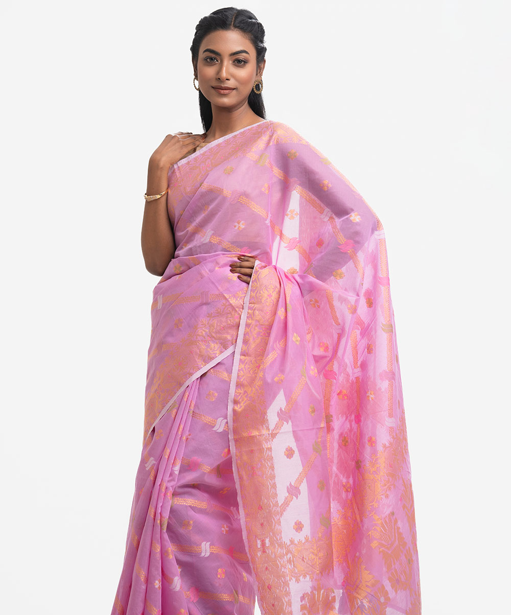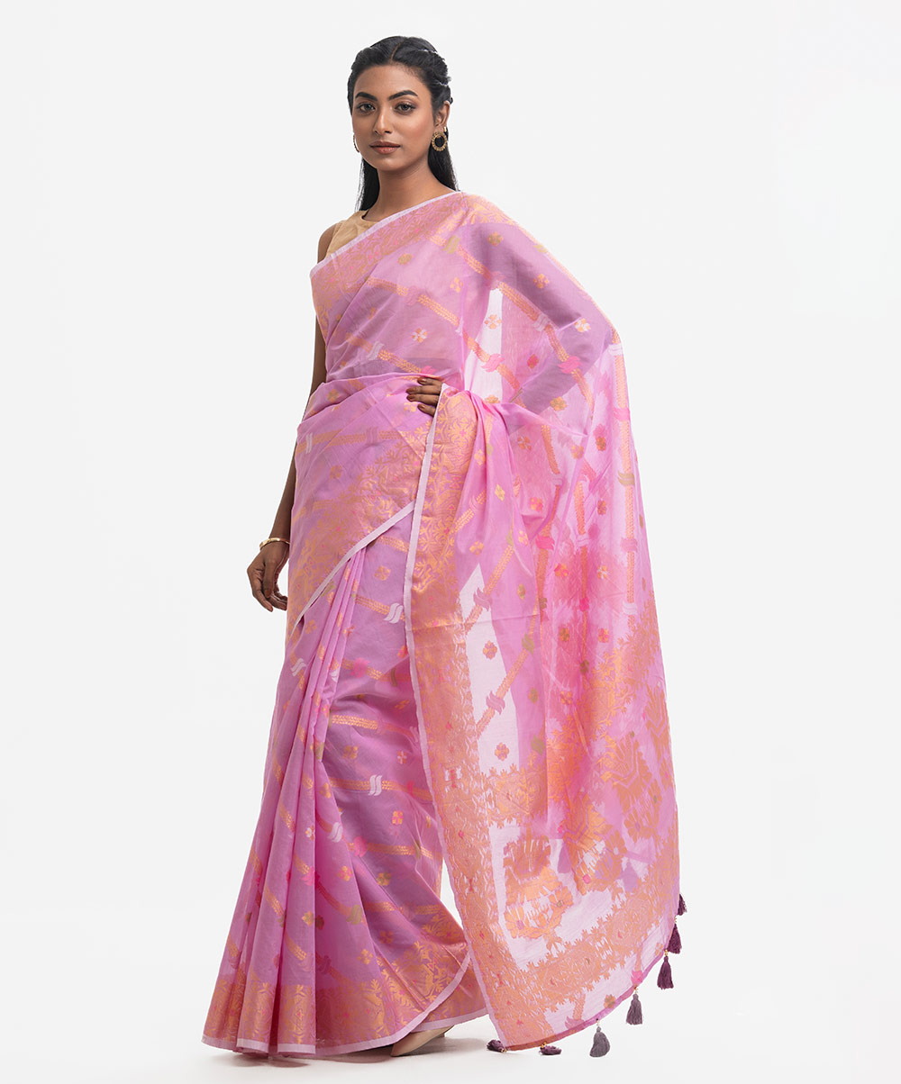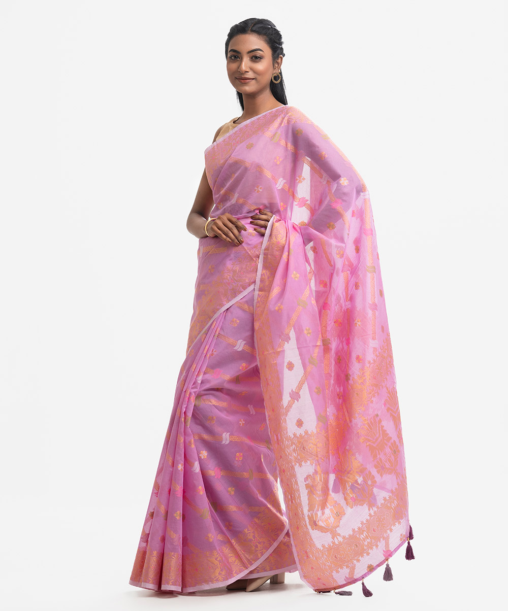 All-over jamdani pattern weaving details saree in half-silk fabric. Tassels at the Aanchal.