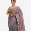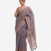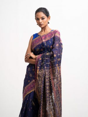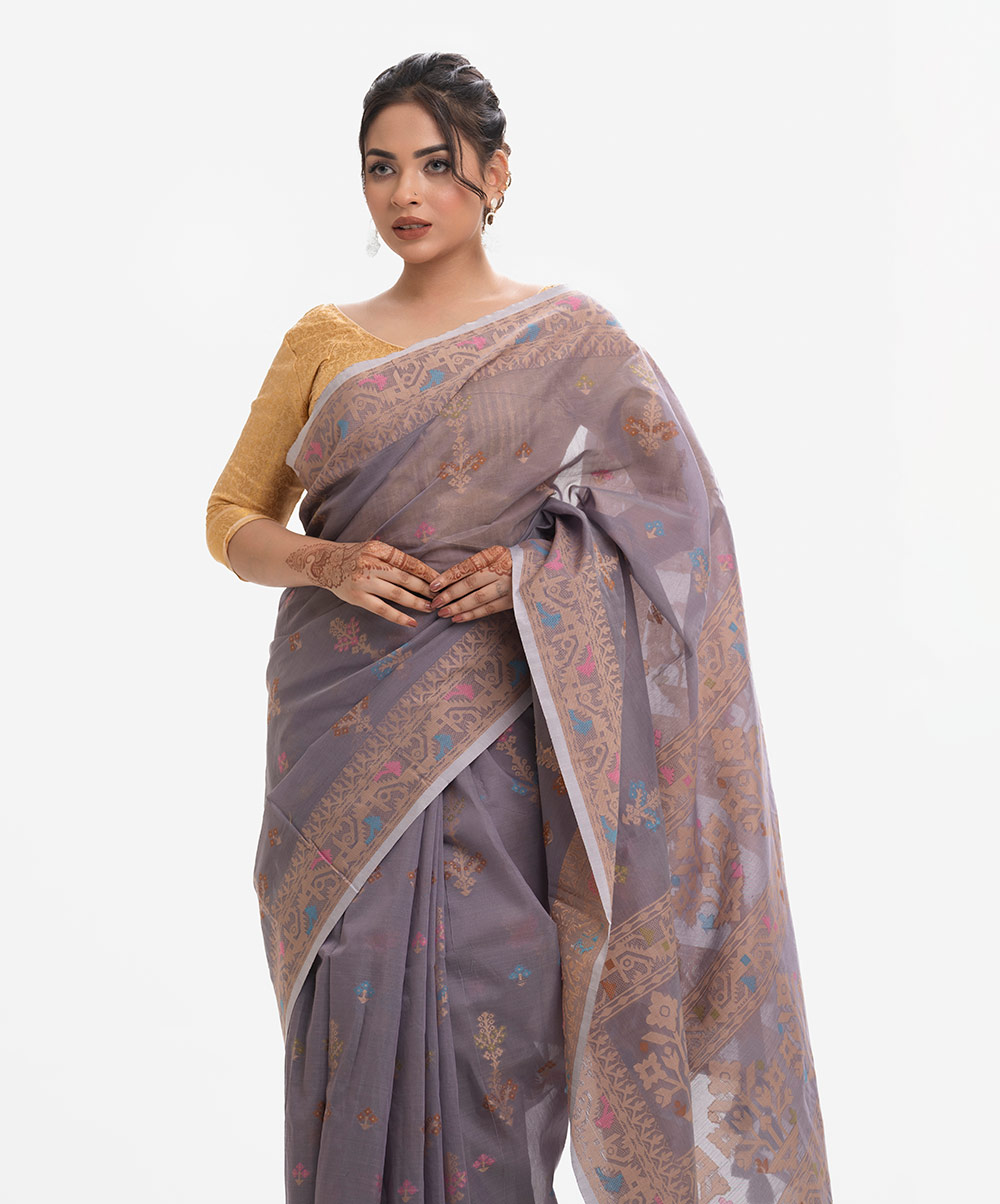 All-over jamdani pattern weaving details saree in half-silk fabric. Tassels at the Aanchal.