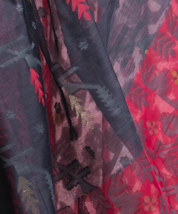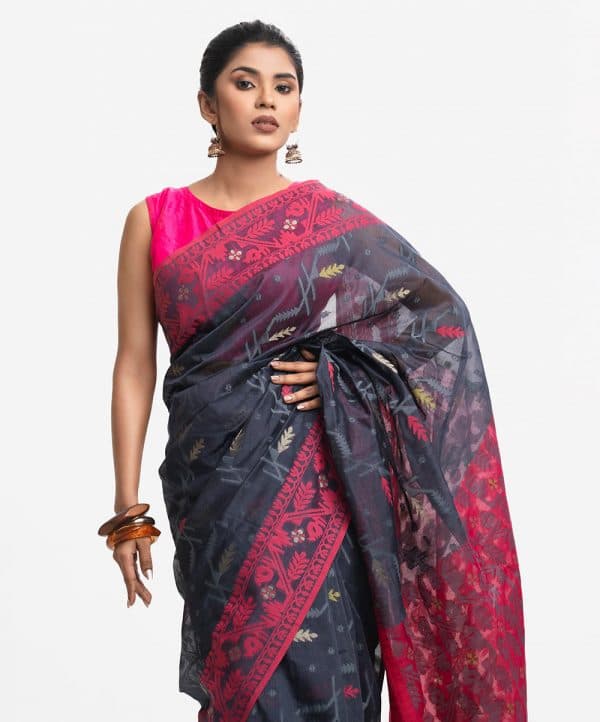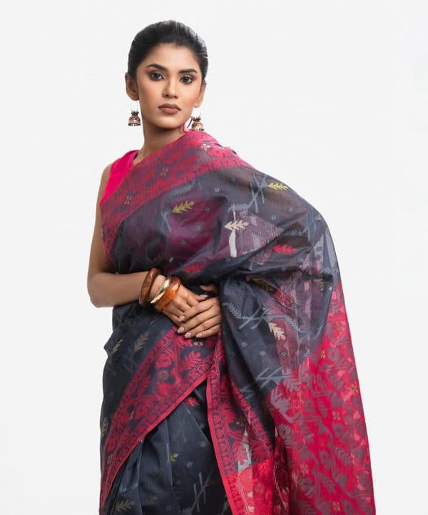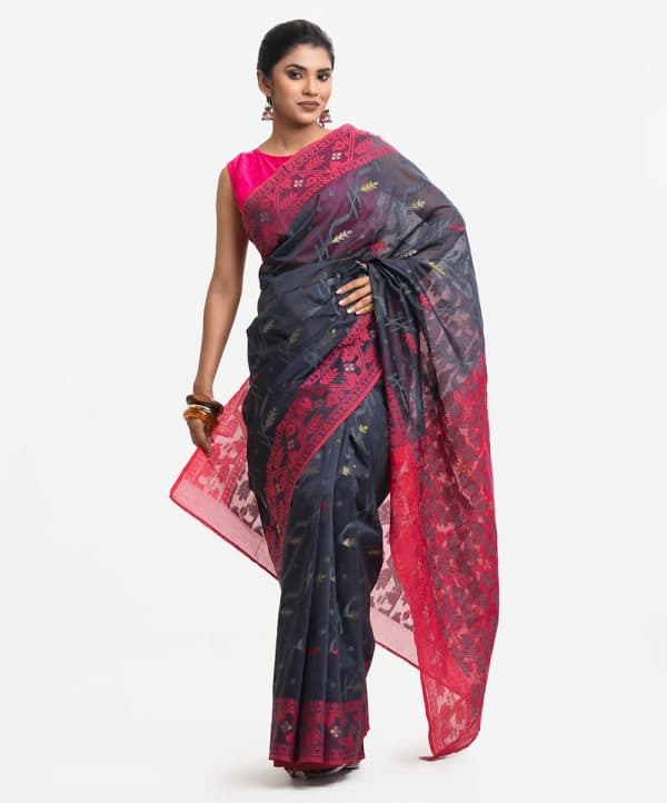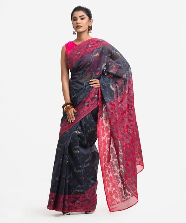 All-over jamdani pattern weaving details saree in half-silk fabric. Zari threads at the Aanchal.