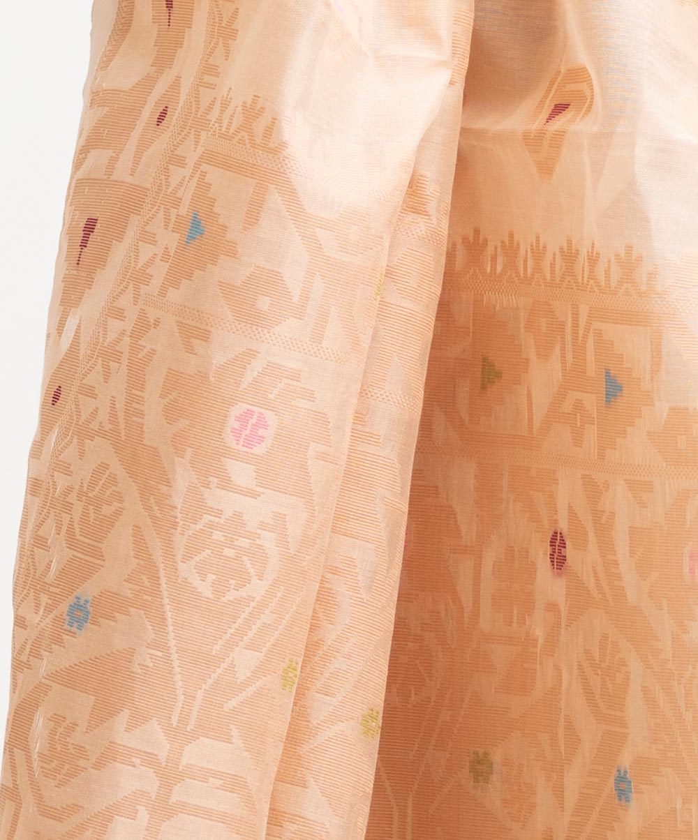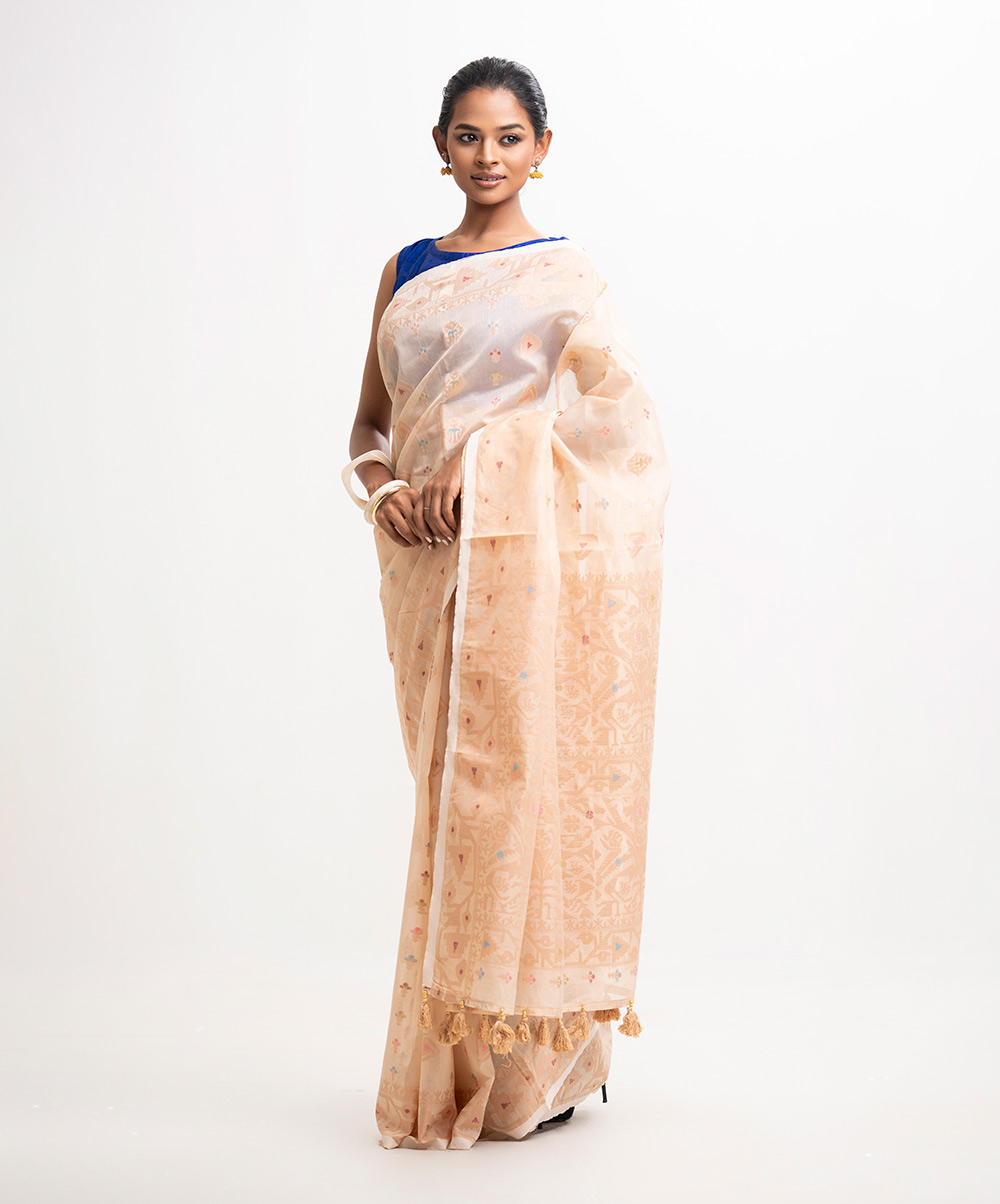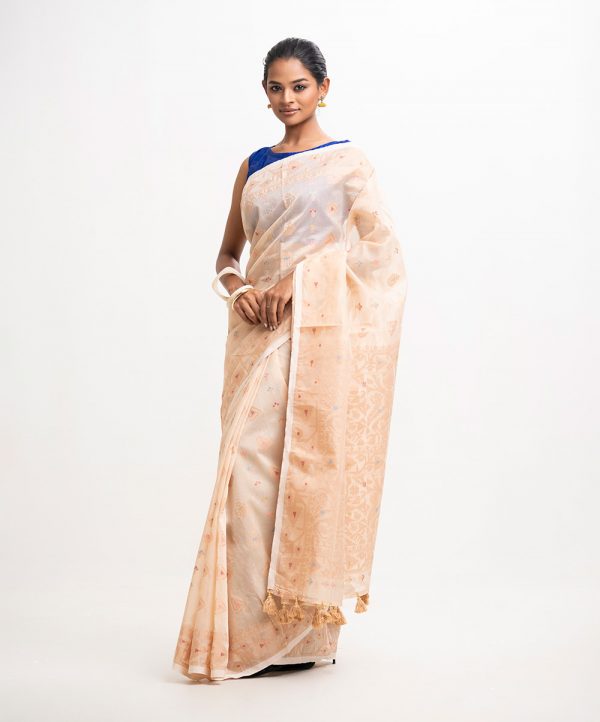All-over Jamdani pattern weaving details saree in half-silk fabric. Tassels at the Aanchal.