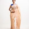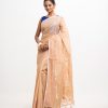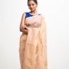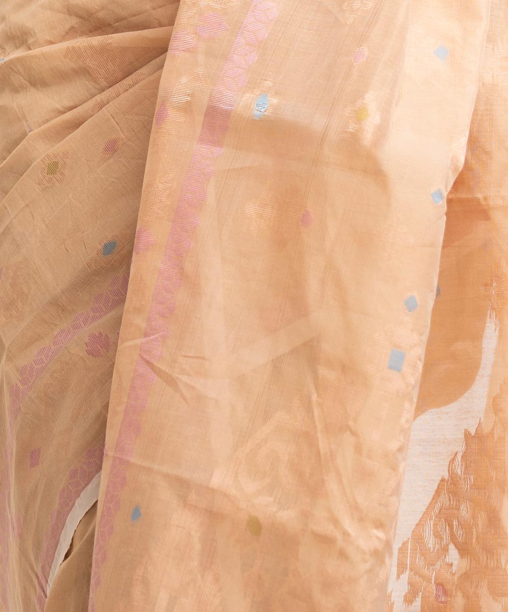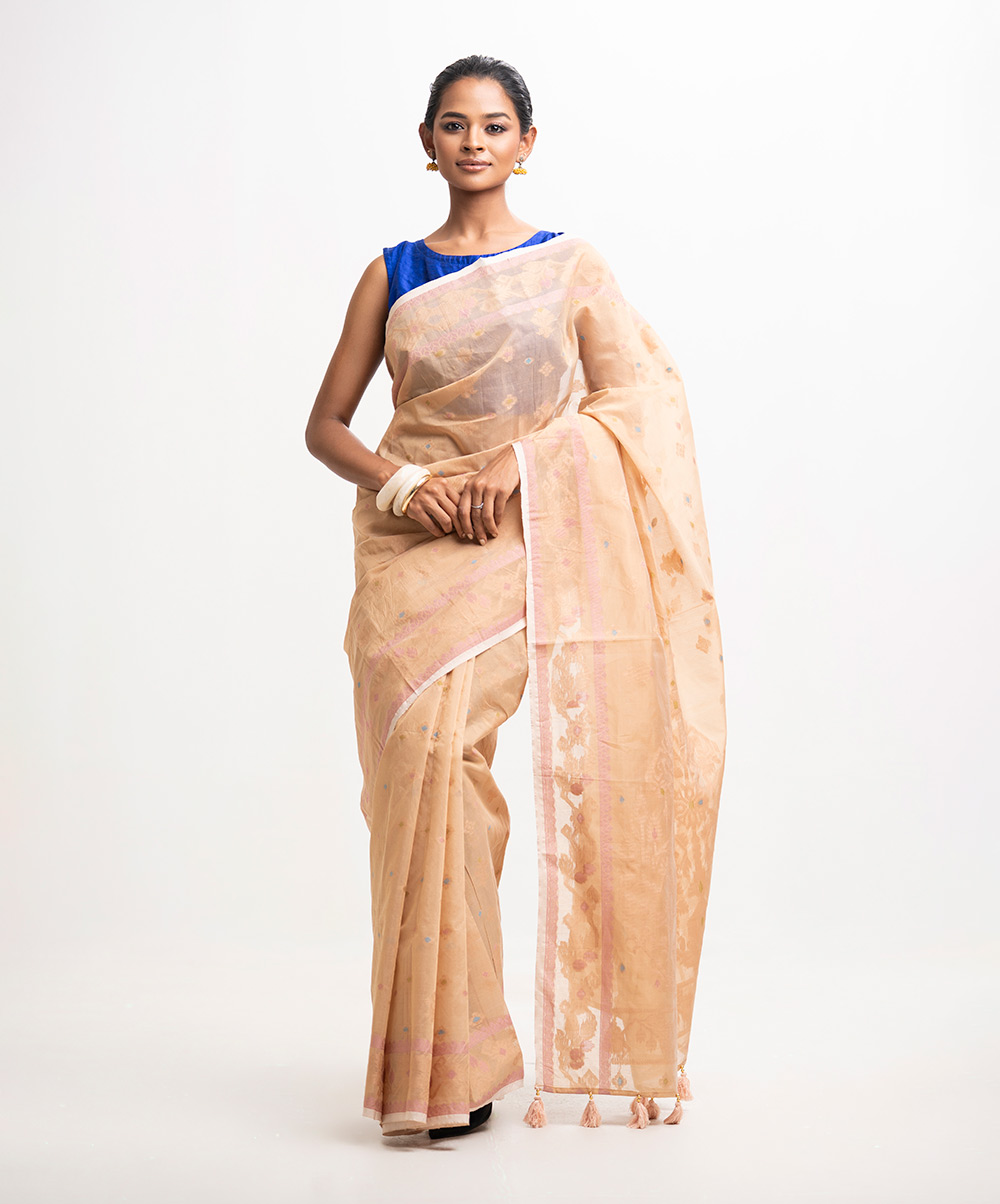 All-over Jamdani pattern weaving details saree in half-silk fabric. Tassels at the Aanchal.