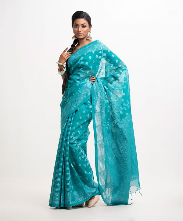 All-over weaving details saree in cotton fabric. Fringe trim at the Aanchal.