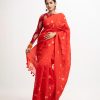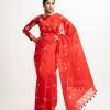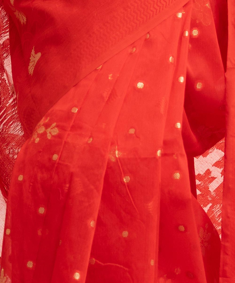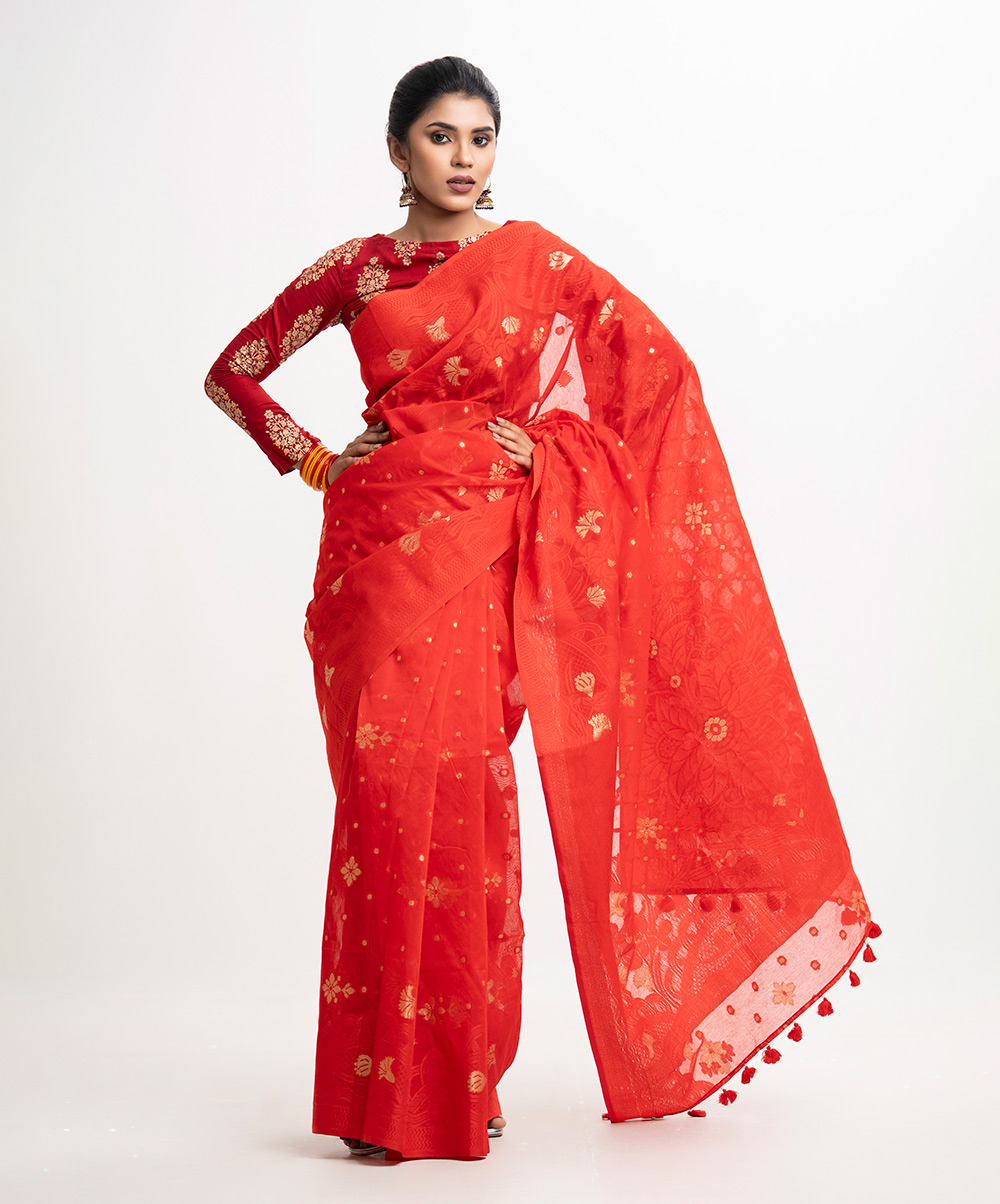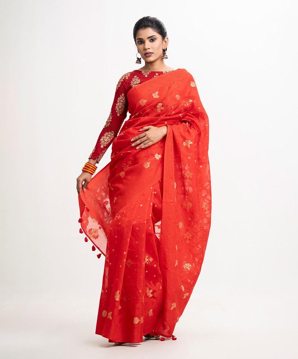 All-over weaving details saree in half-silk fabric. Tassels at the Aanchal.
