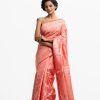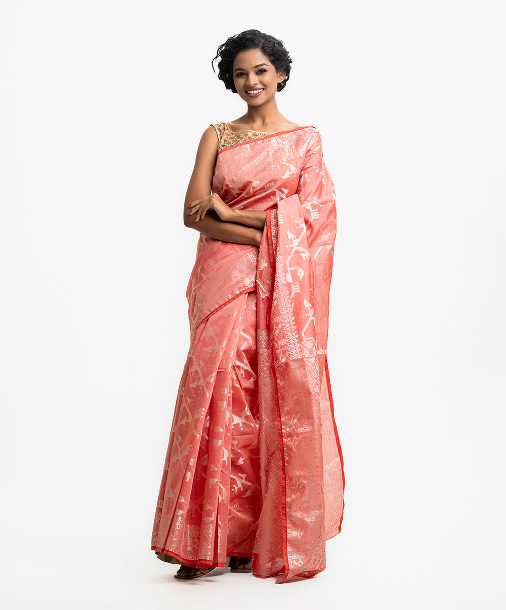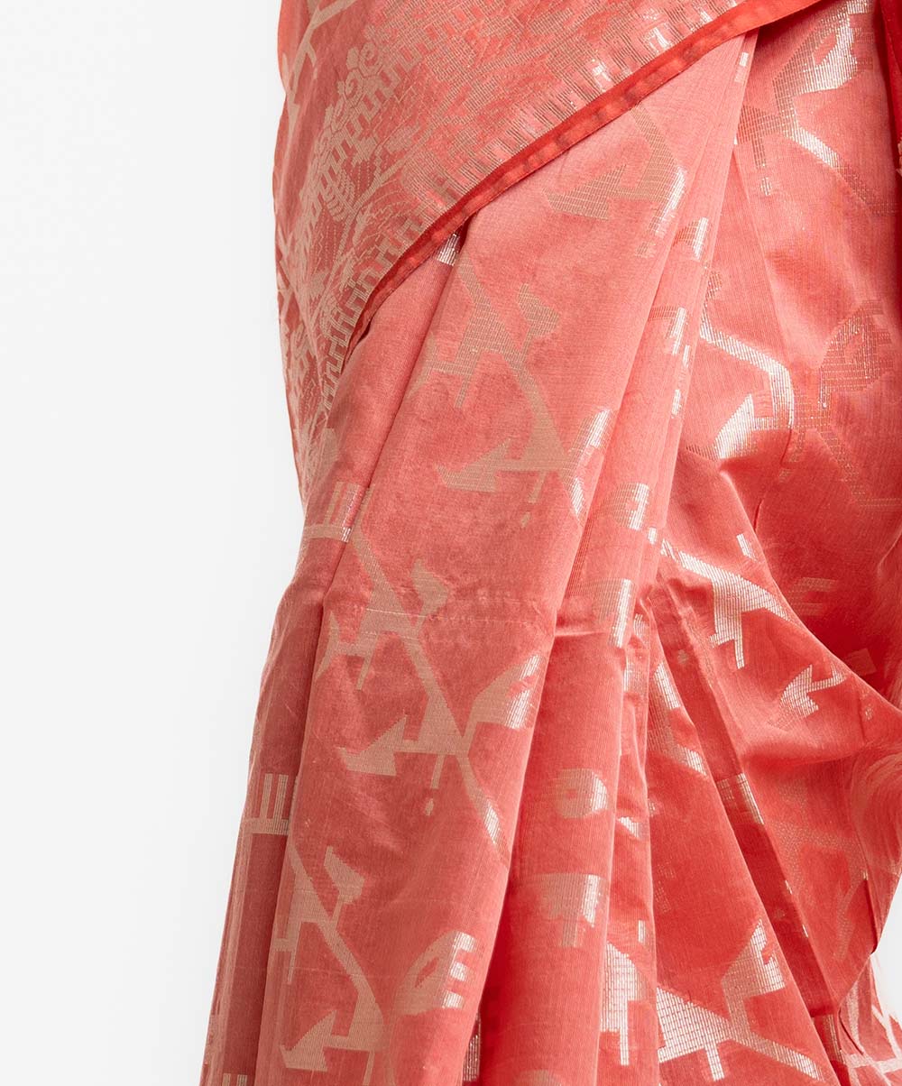 All-over jamdani pattern weaving details saree in half-silk fabric. Zari details at Aanchal.