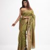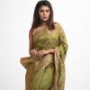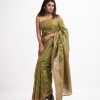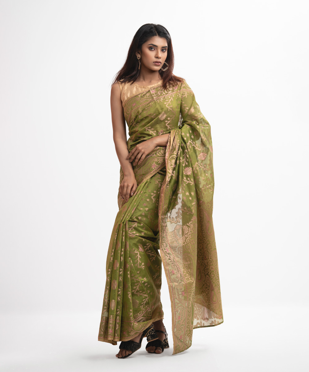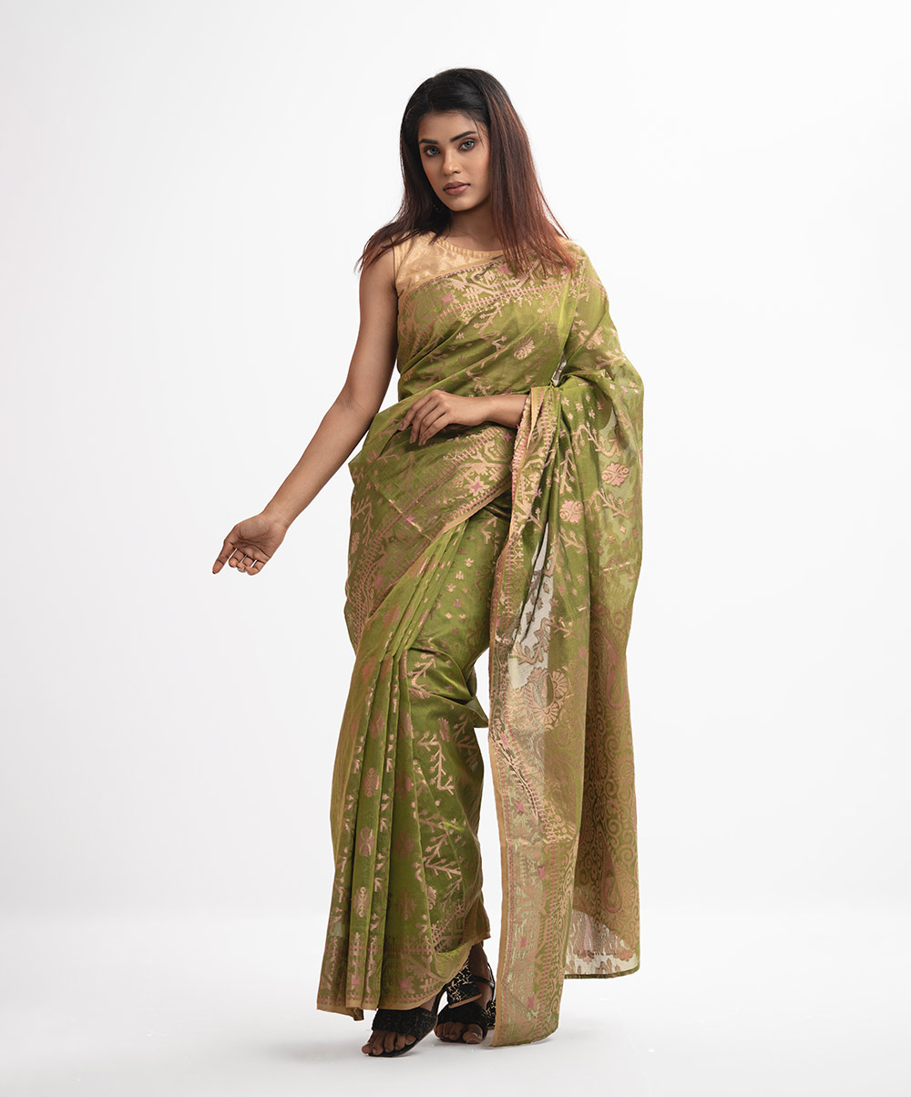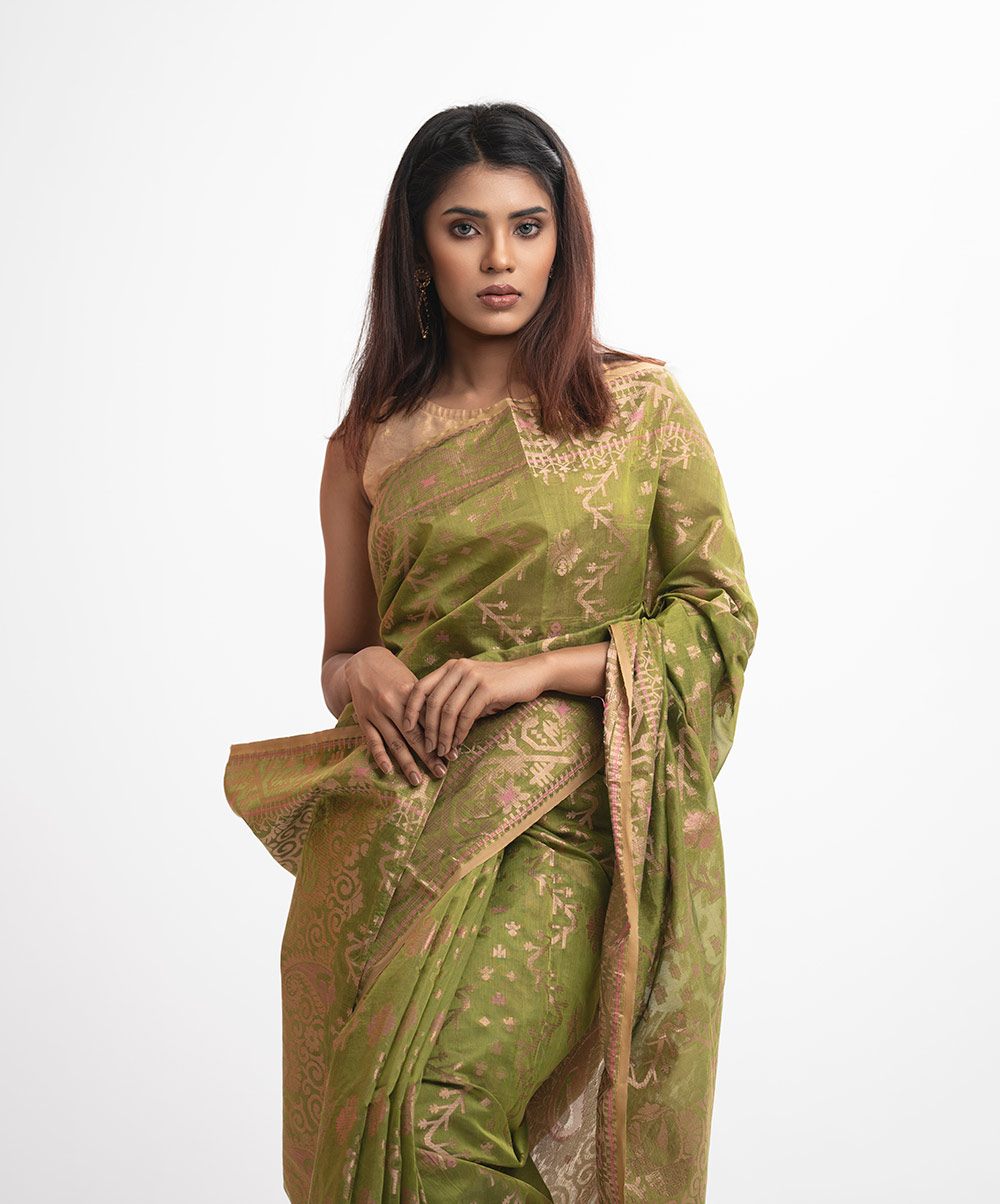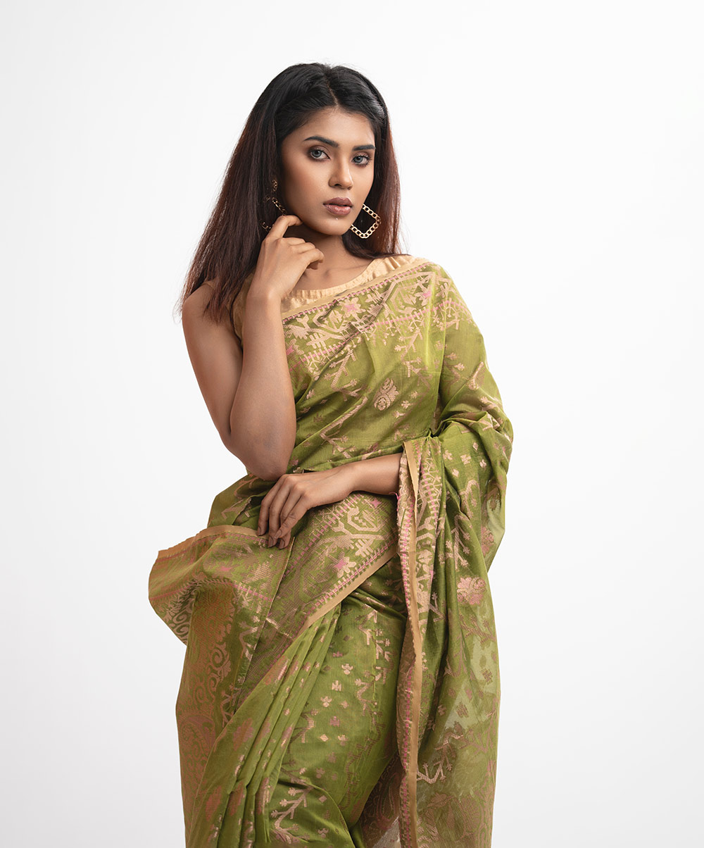 All-over weaving details saree in half-silk fabric. Zari threads detail at the Aanchal.