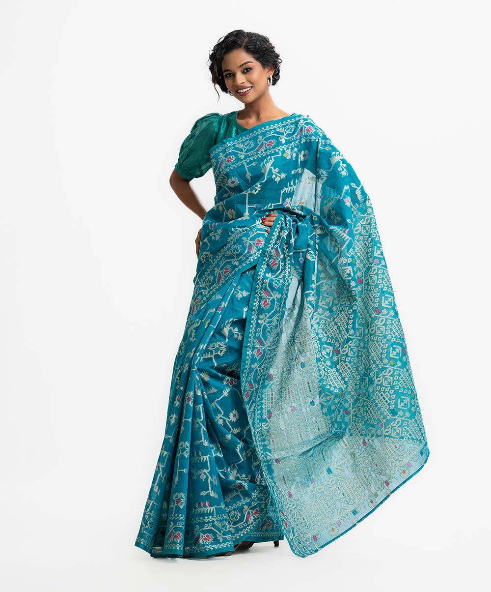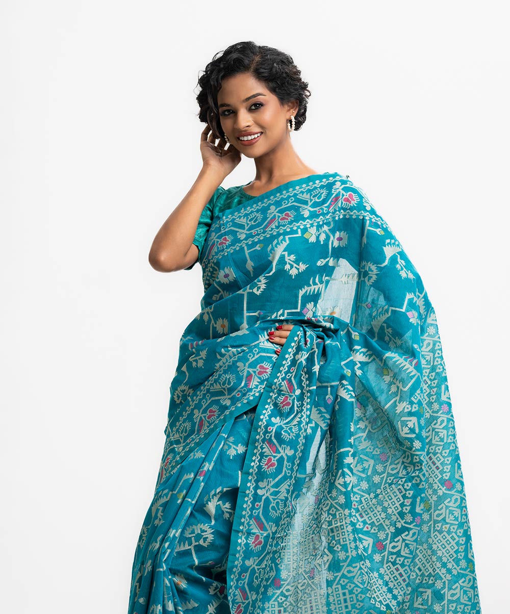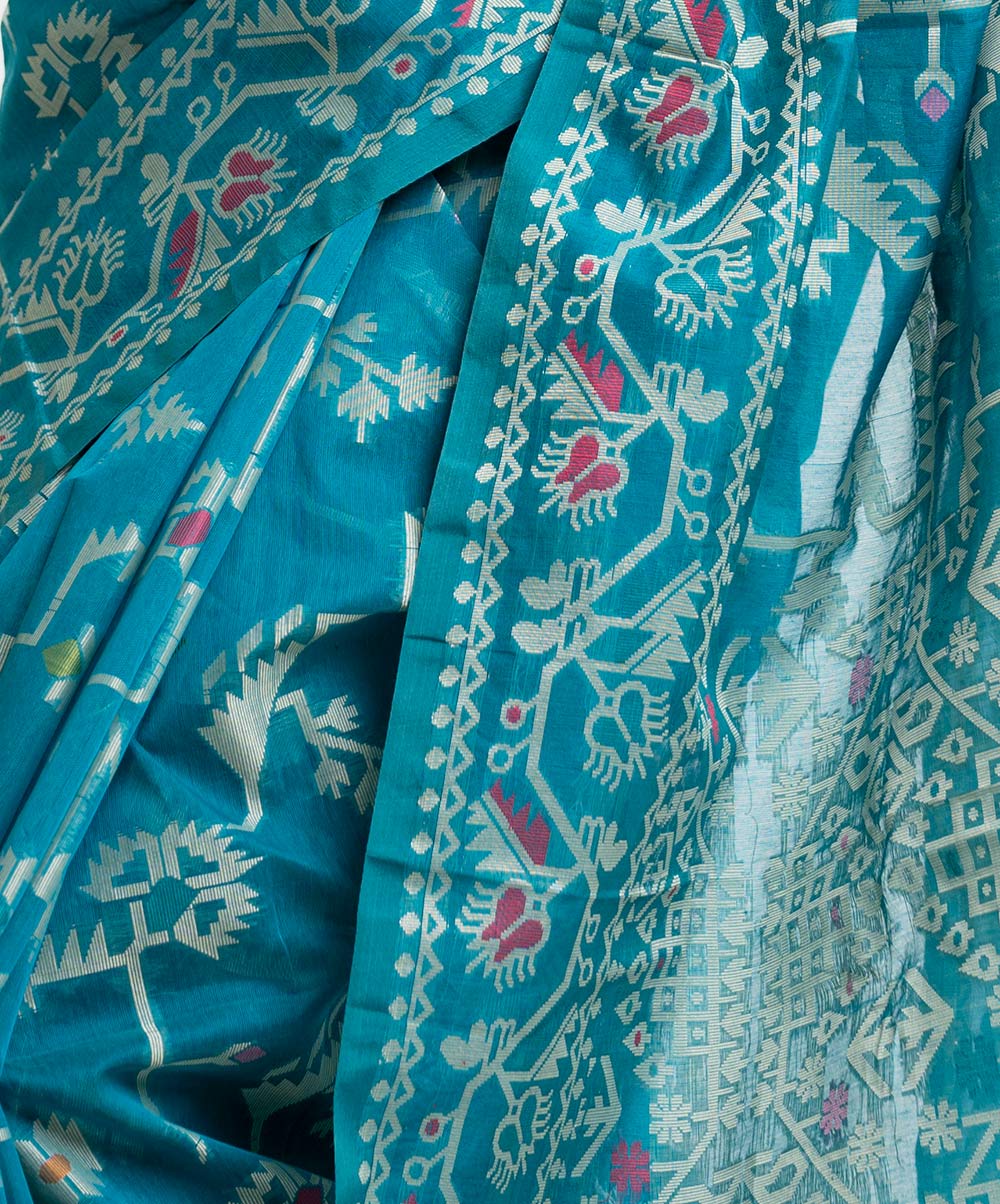All-over jamdani pattern weaving details saree in half-silk fabric. Colorful threads detail at Aanchal.