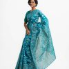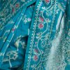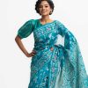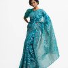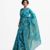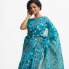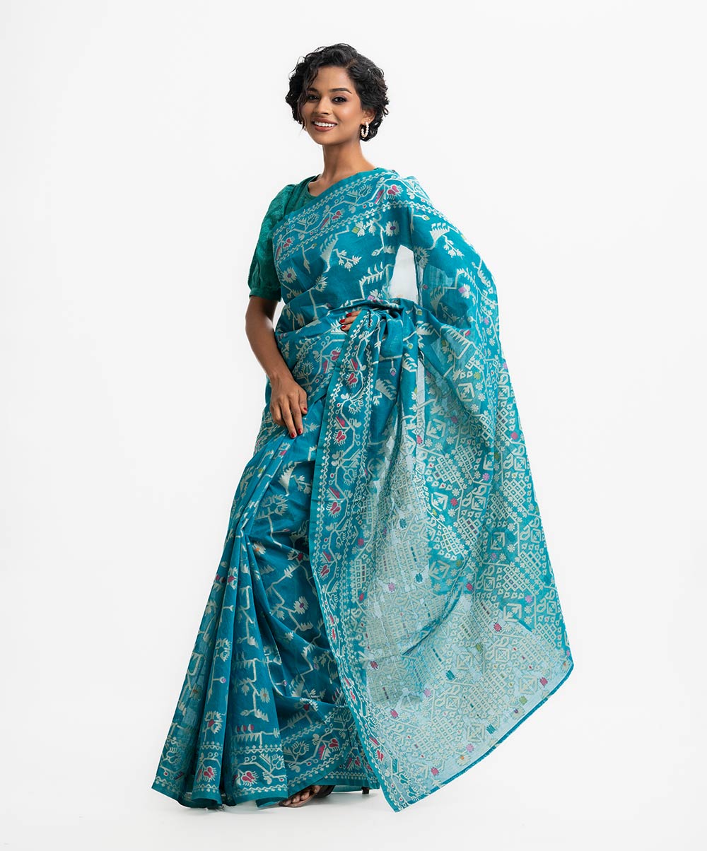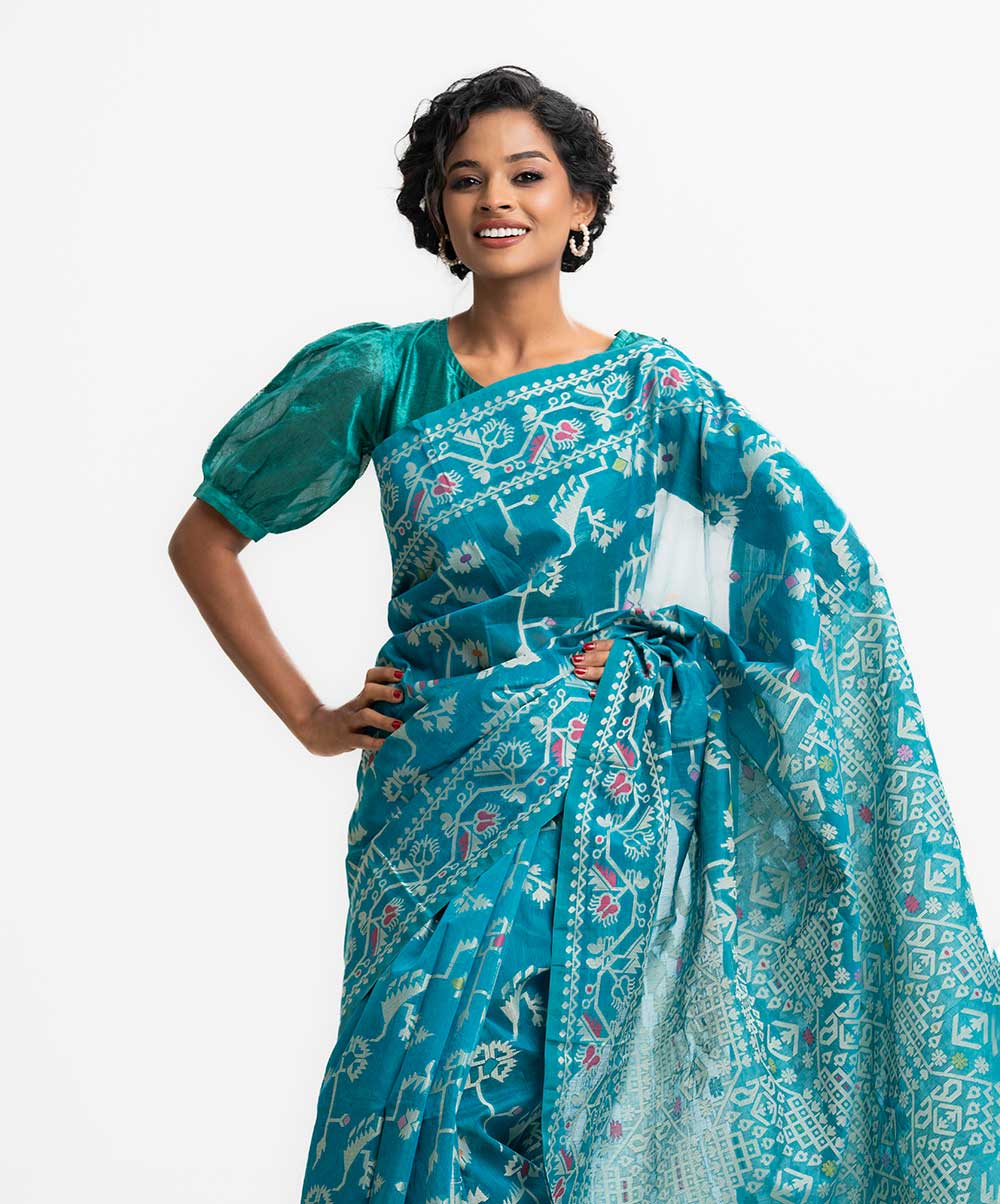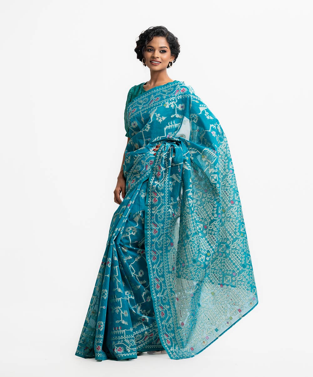 All-over jamdani pattern weaving details saree in half-silk fabric. Colorful threads detail at Aanchal.