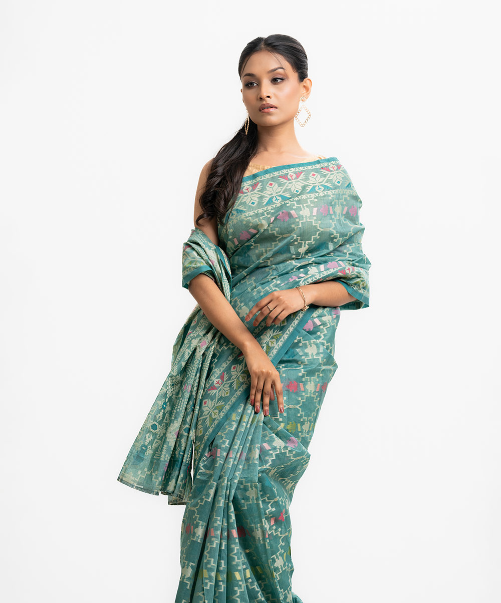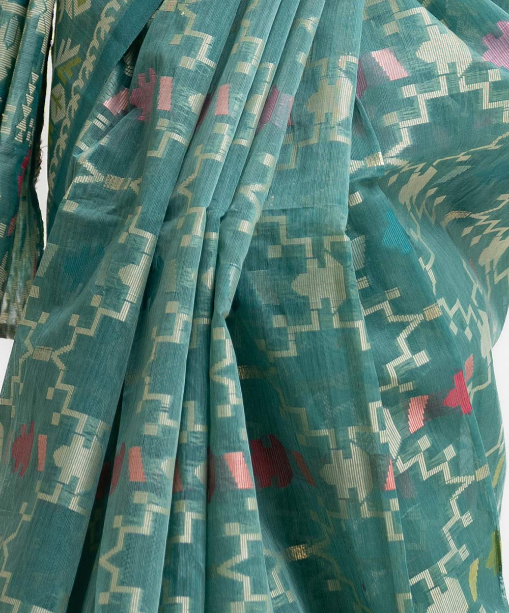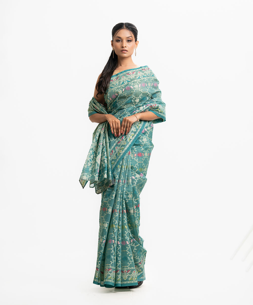 All-over jamdani pattern weaving details saree in half-silk fabric. Colorful threads detail at Aanchal.
