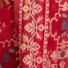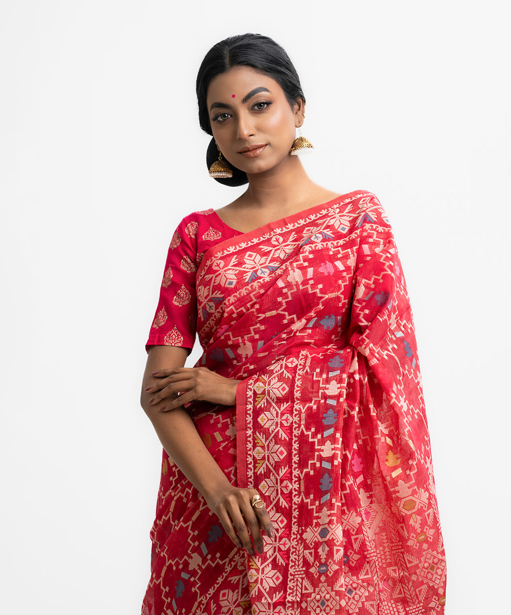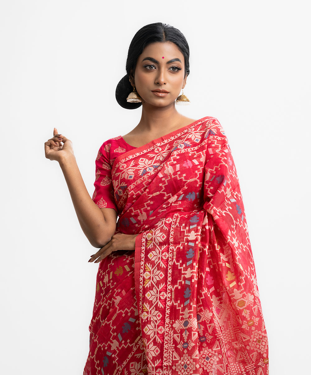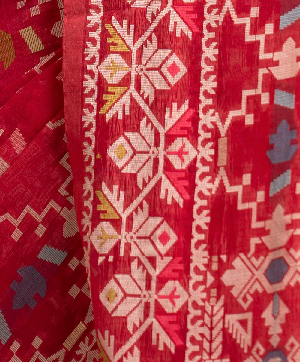All-over jamdani pattern weaving details saree in half-silk fabric. Colorful threads detail at Aanchal.