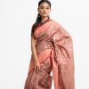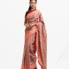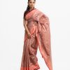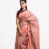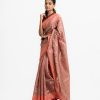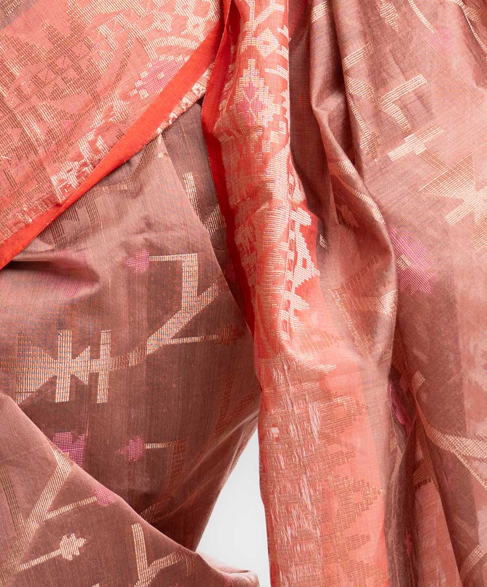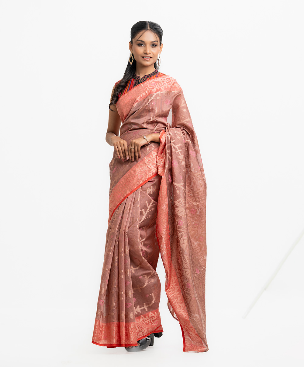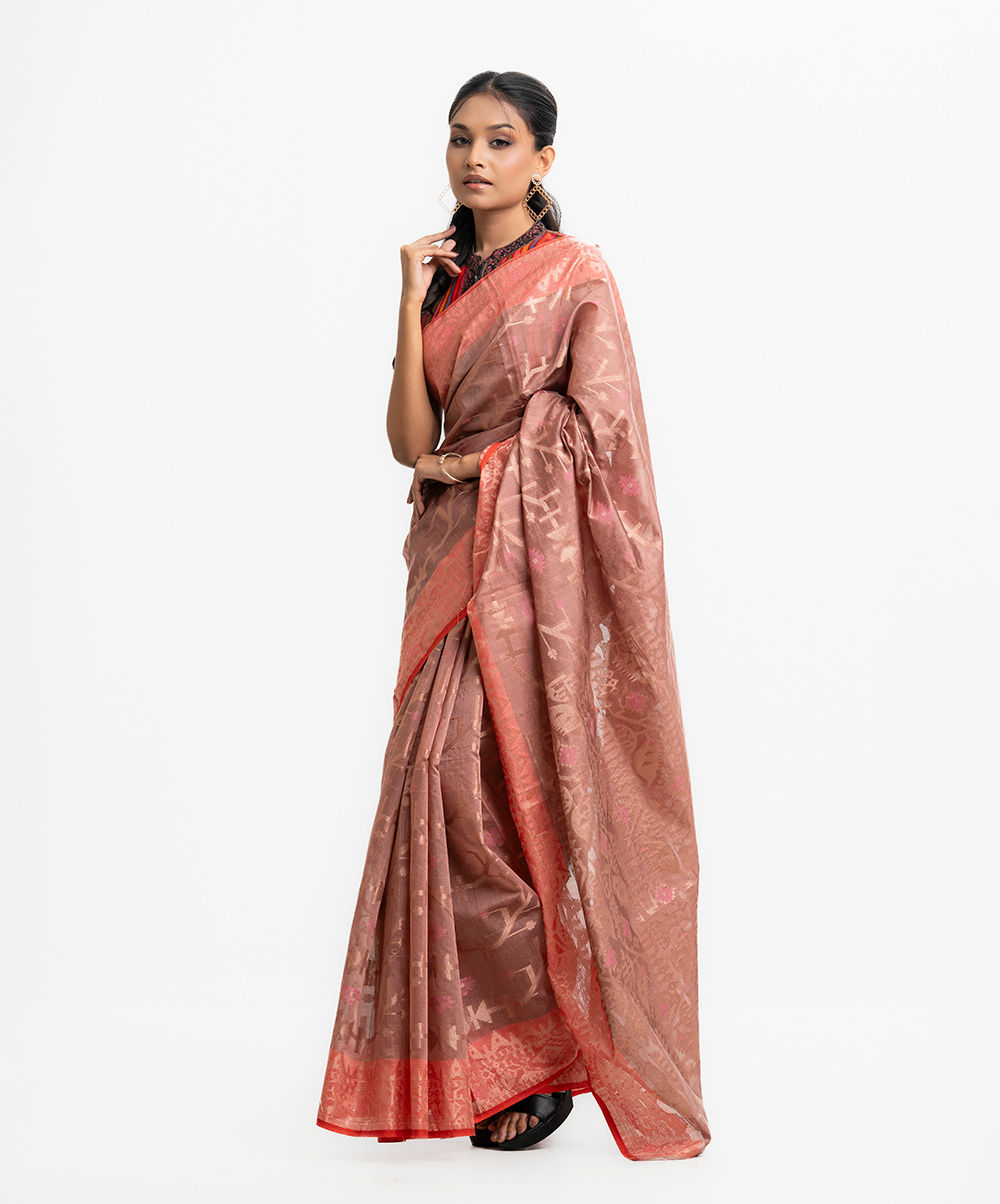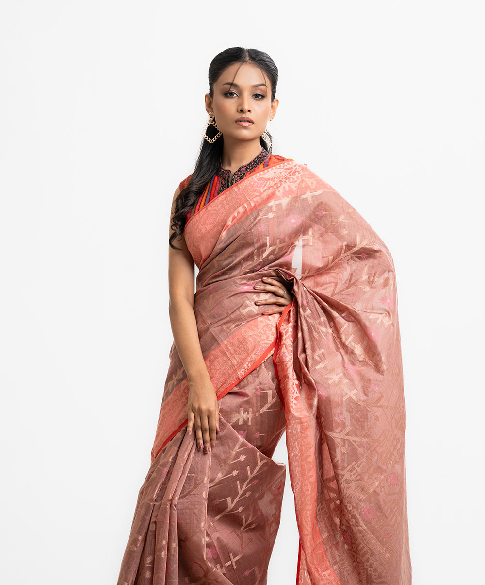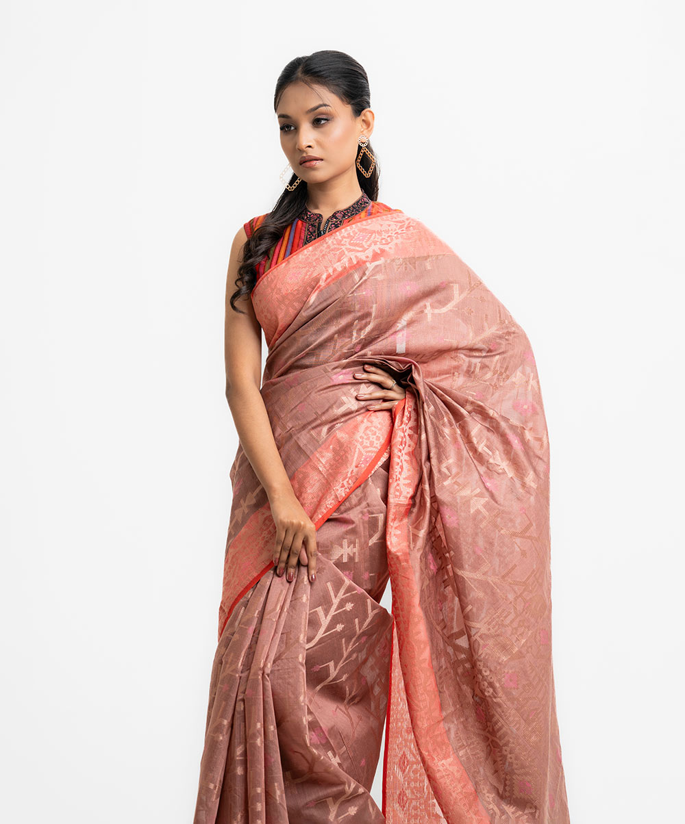 All-over jamdani pattern weaving details saree in half-silk fabric. Colorful threads detail at Aanchal.