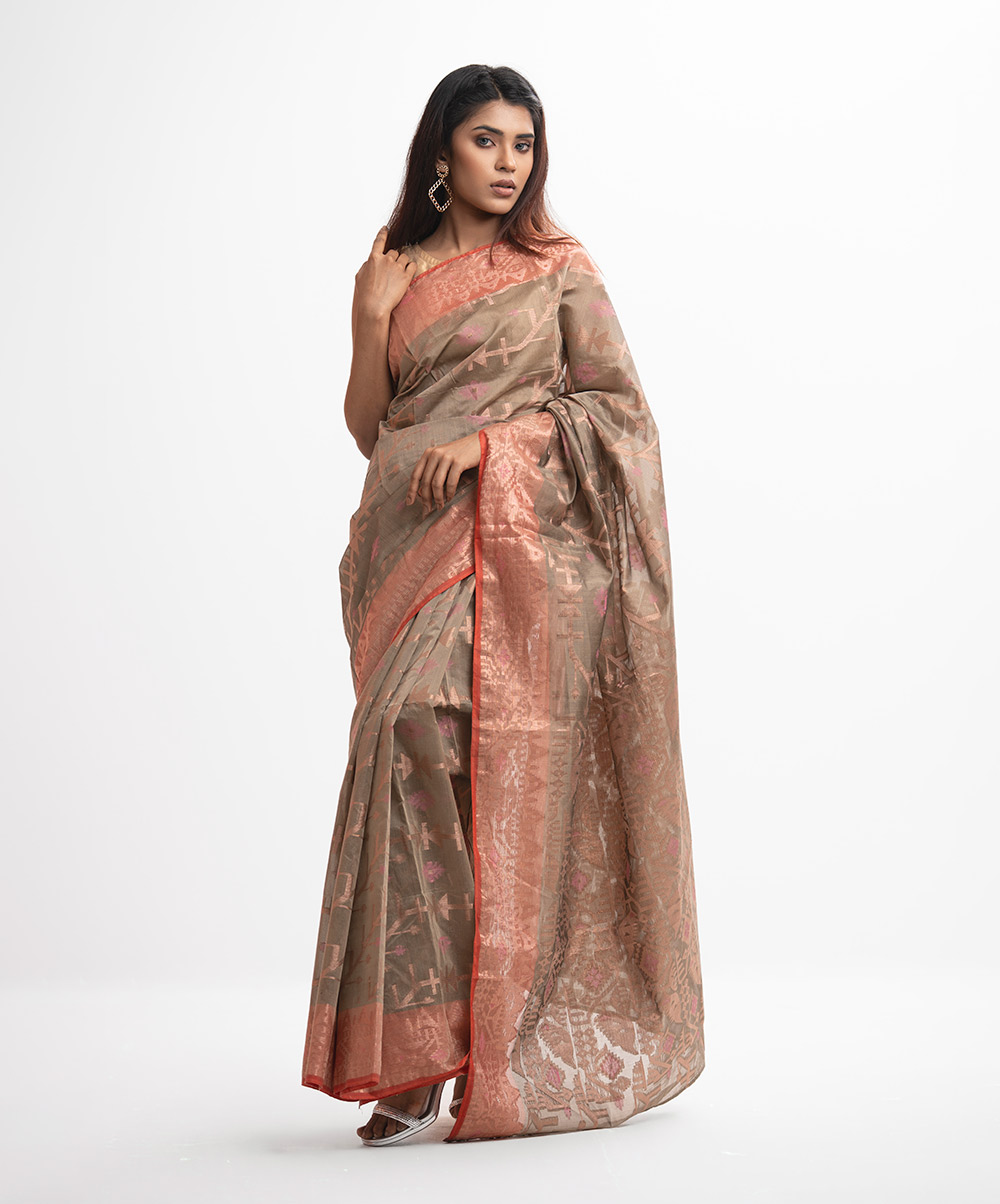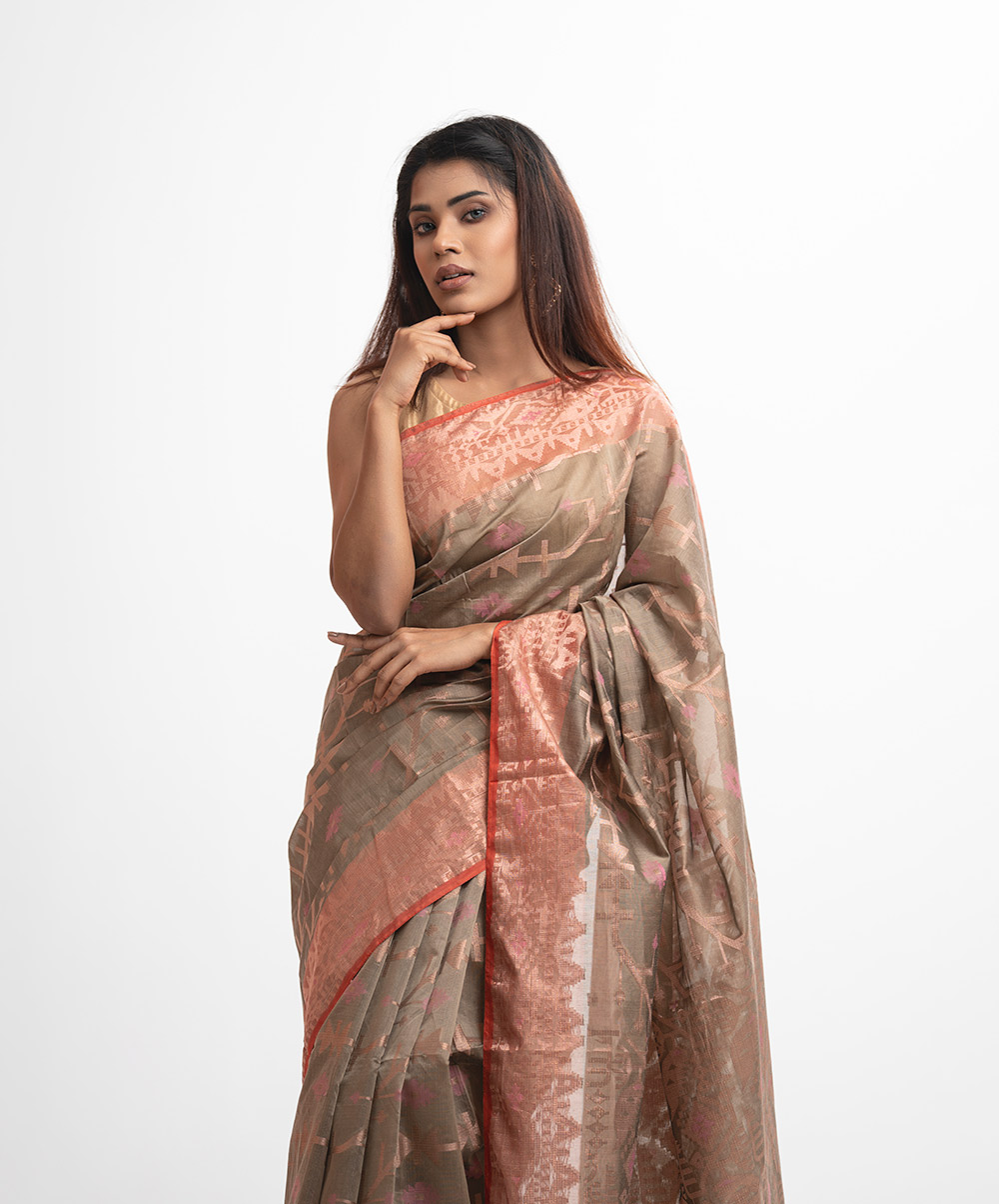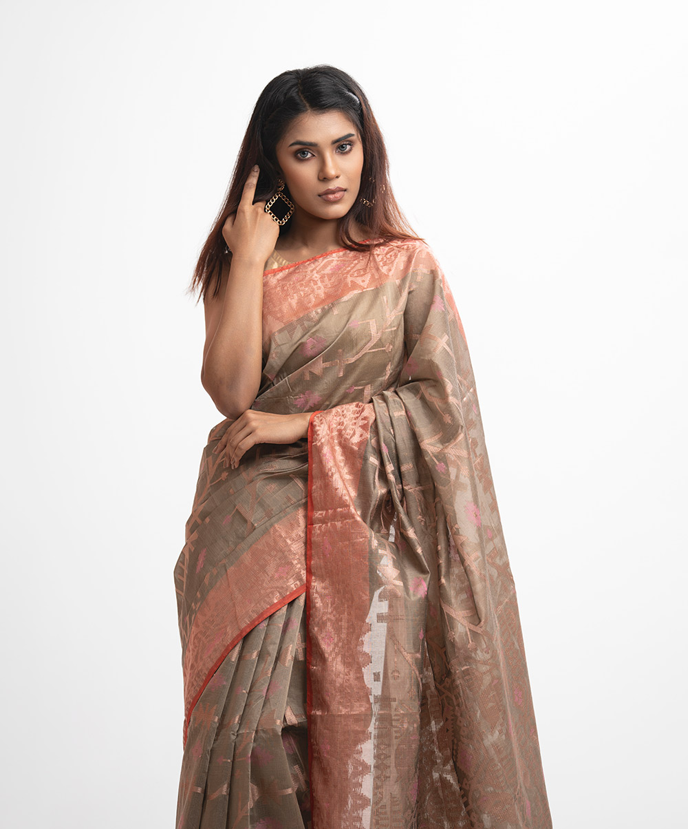 All-over jamdani pattern weaving details saree in half-silk fabric. Colorful threads detail at the Aanchal.