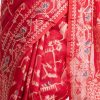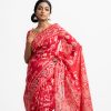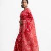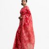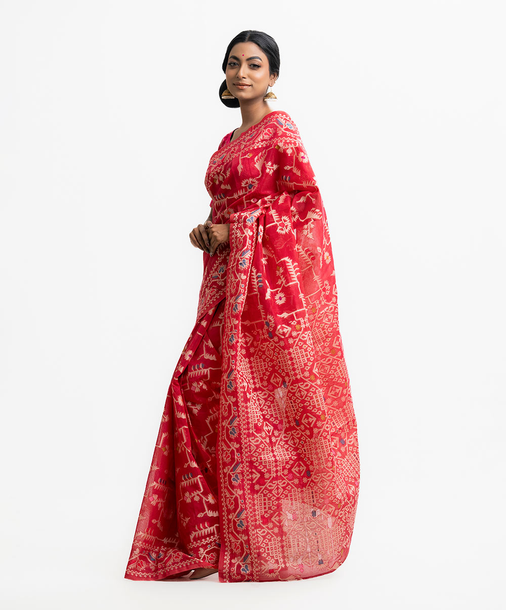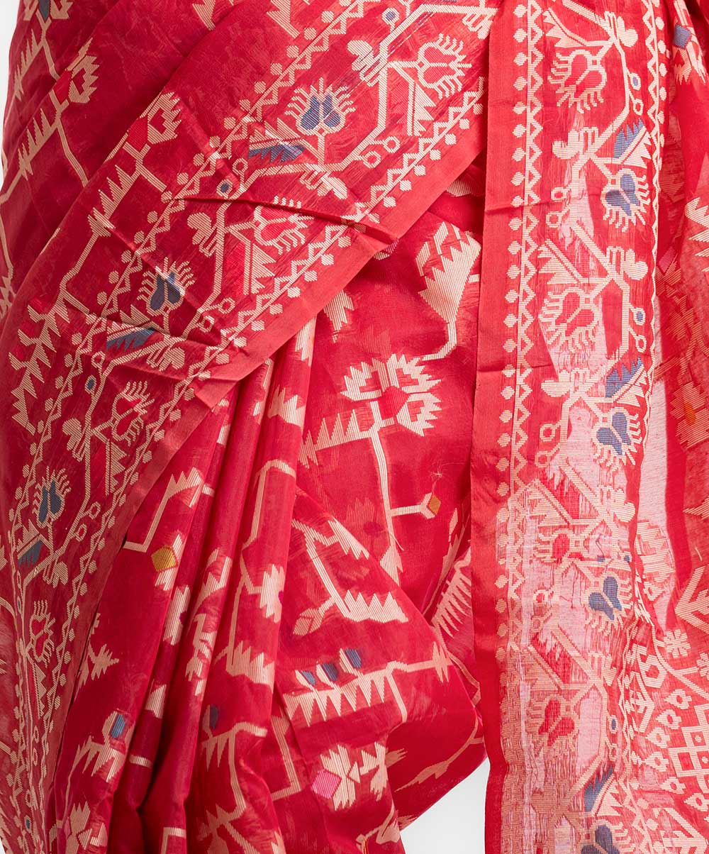 All-over jamdani pattern weaving details saree in half-silk fabric. Colorful threads detail at Aanchal.