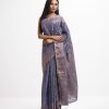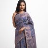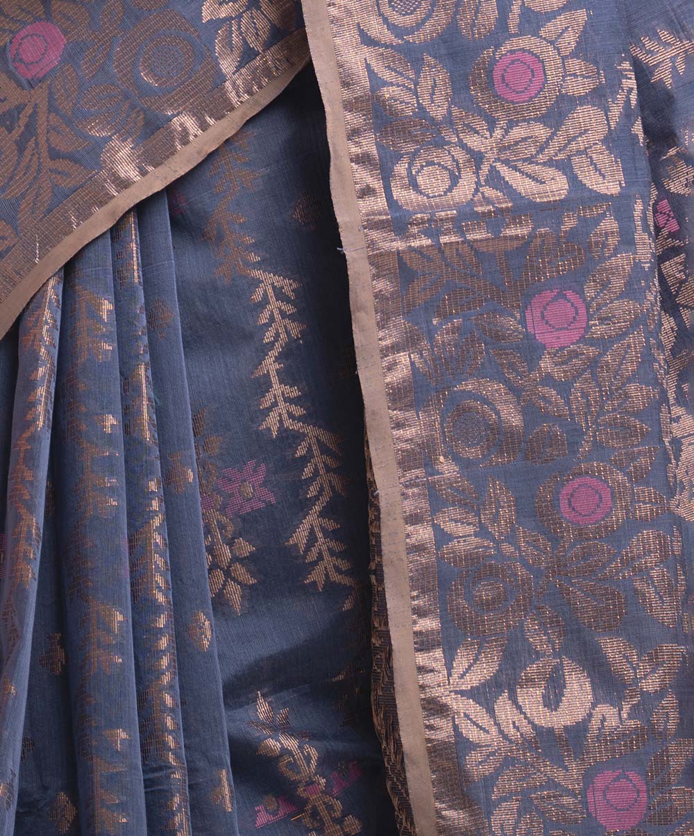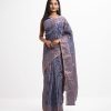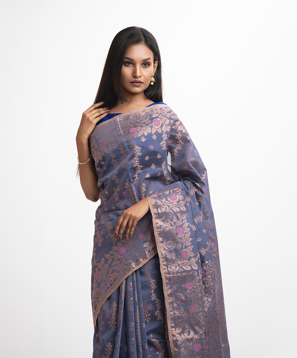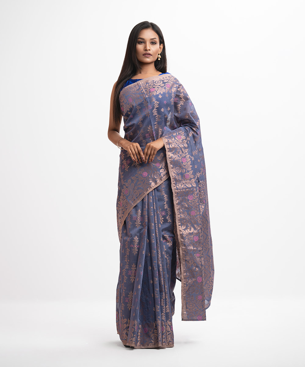 All-over jamdani pattern weaving details saree in half-silk fabric. Zari & colorful threads detail at the Aanchal.