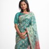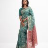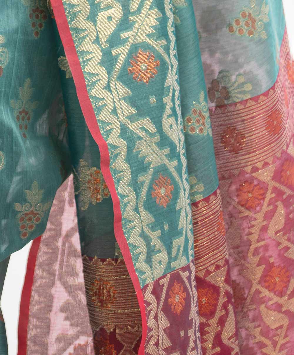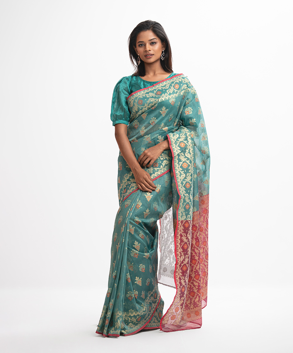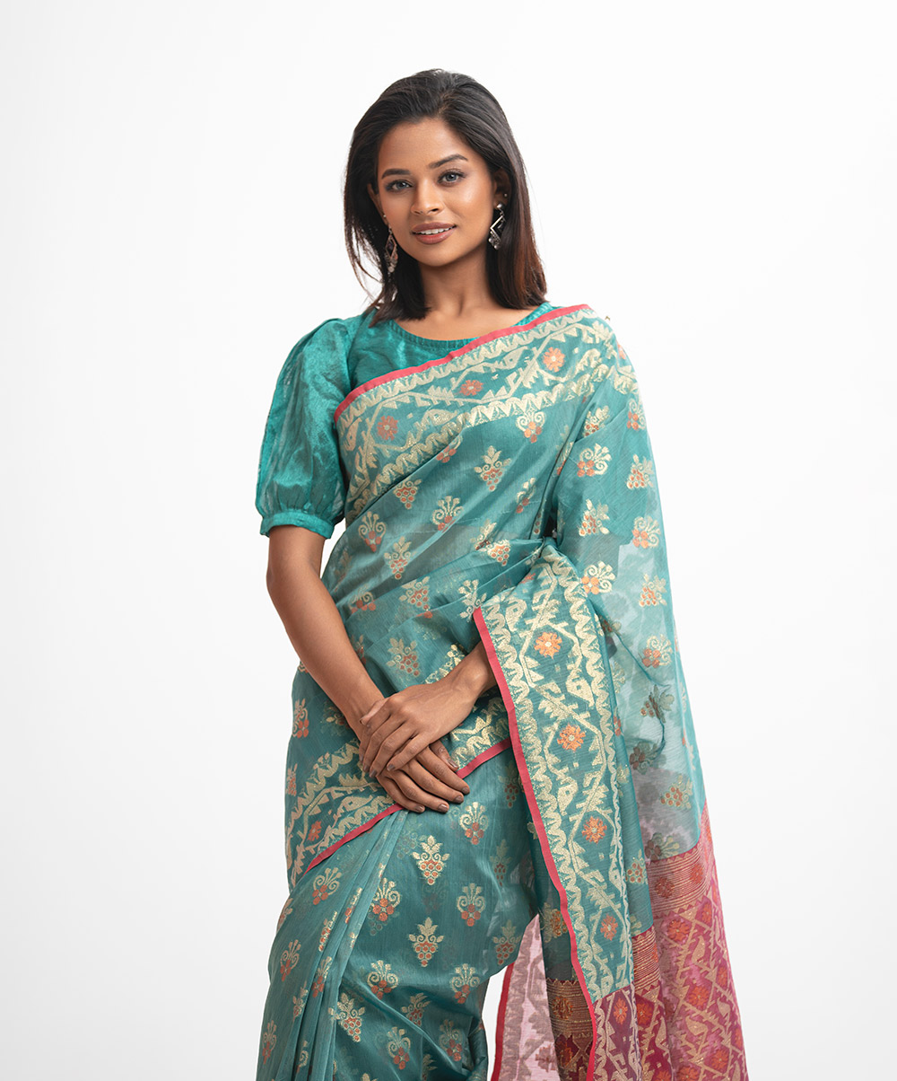 All-over jamdani pattern weaving details saree in half-silk fabric. Zari threads detail at the Aanchal.