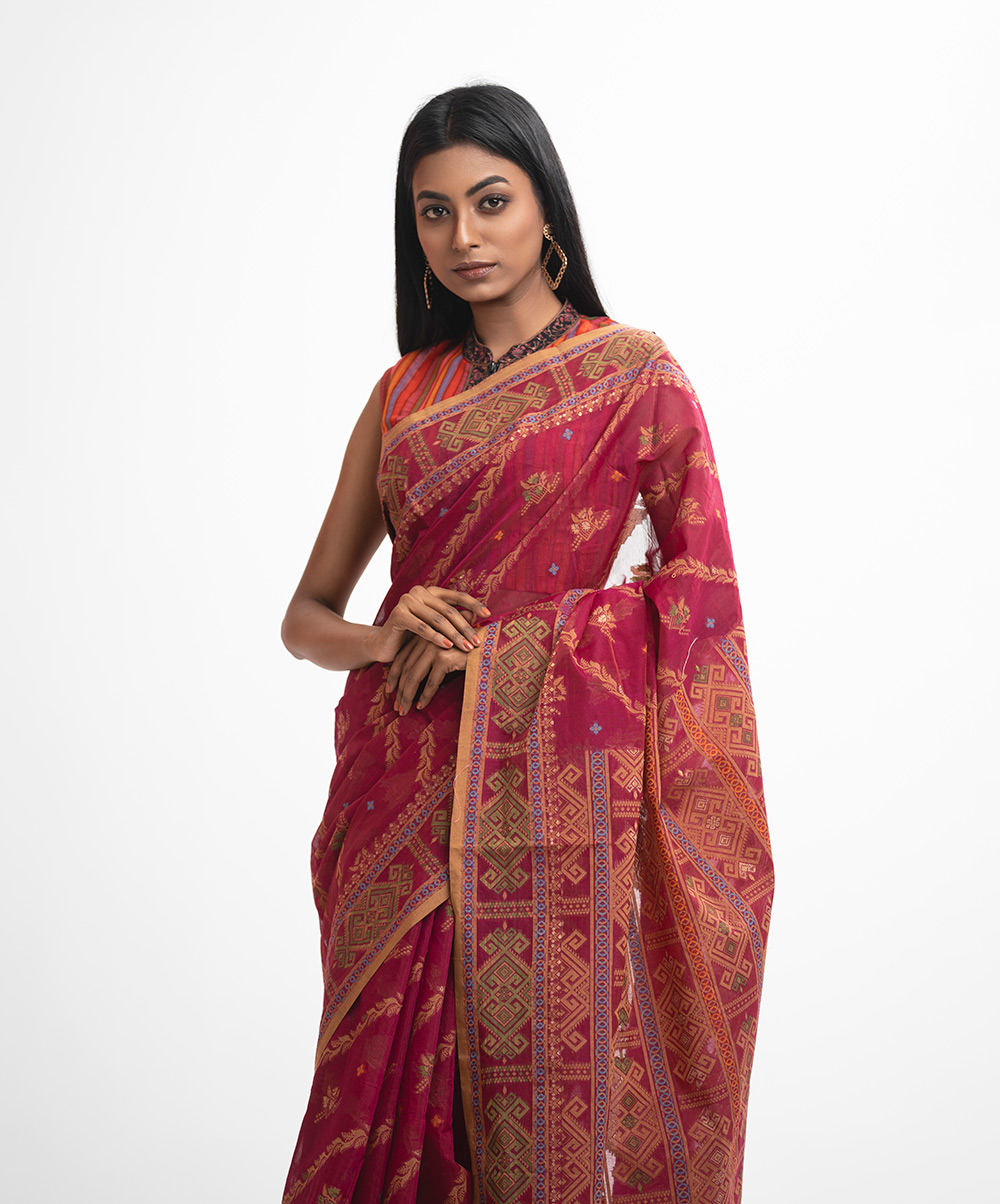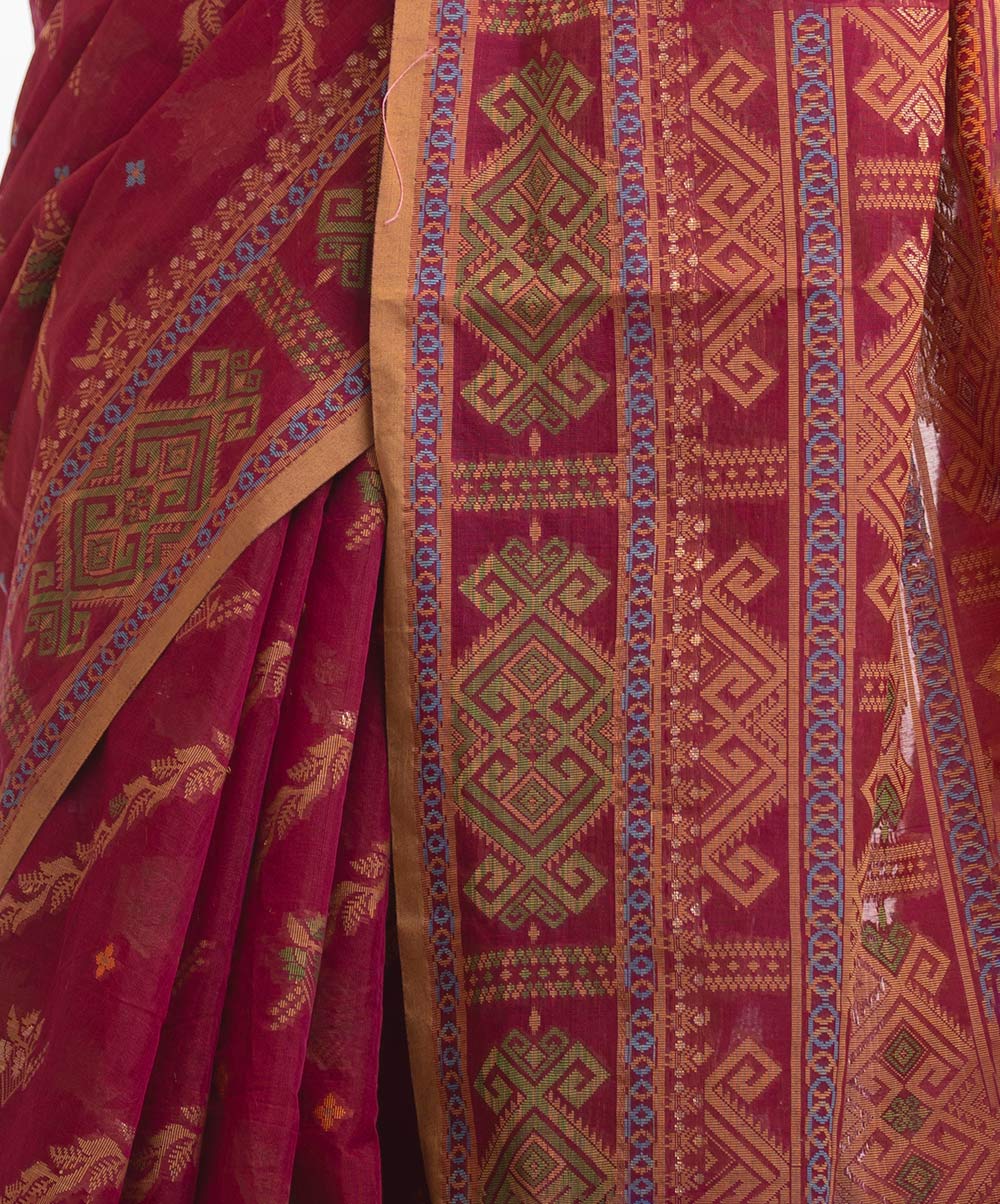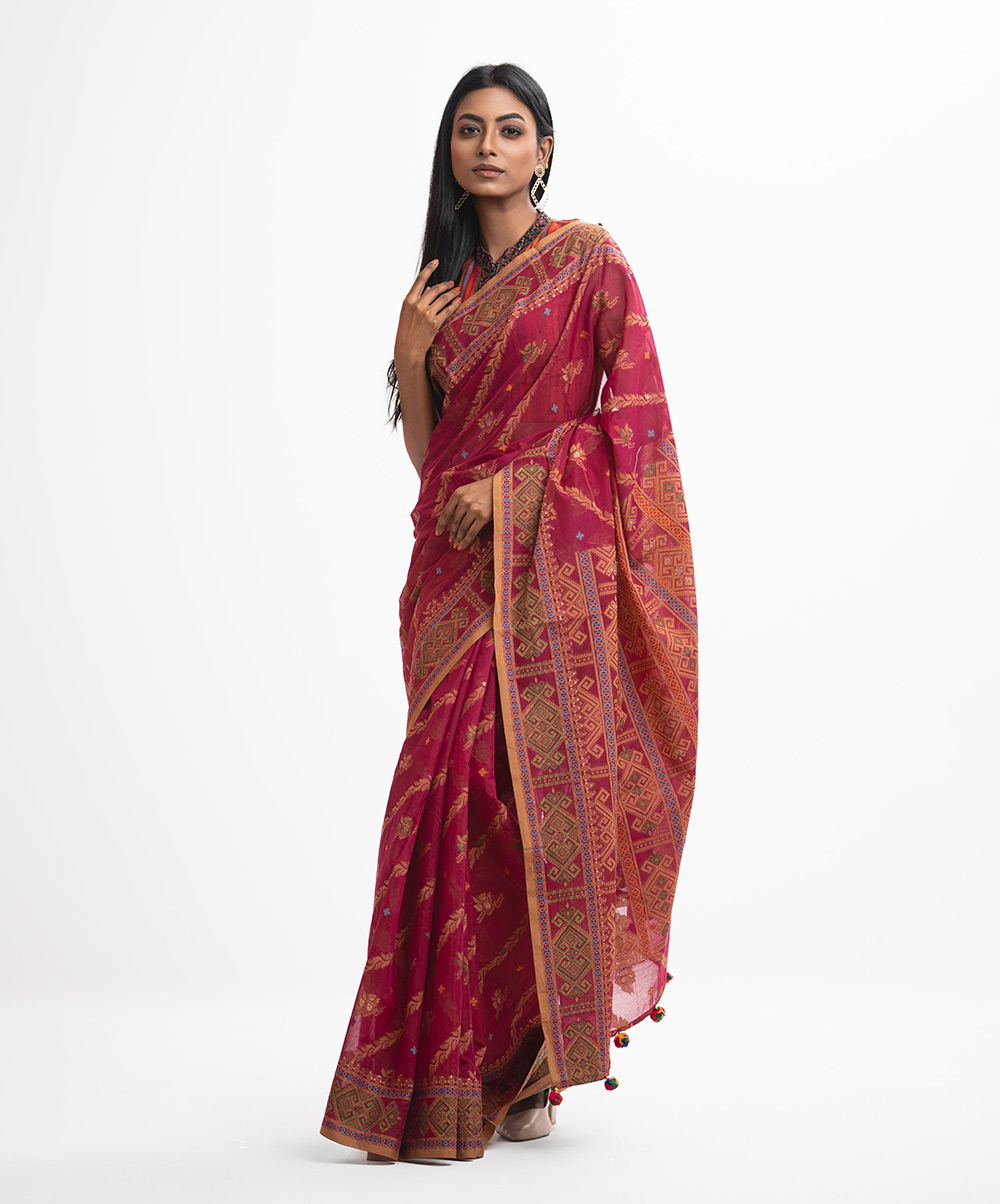 All-over jamdani pattern weaving details saree in half-silk fabric. Colorful threads detail & pom poms at the Aanchal.