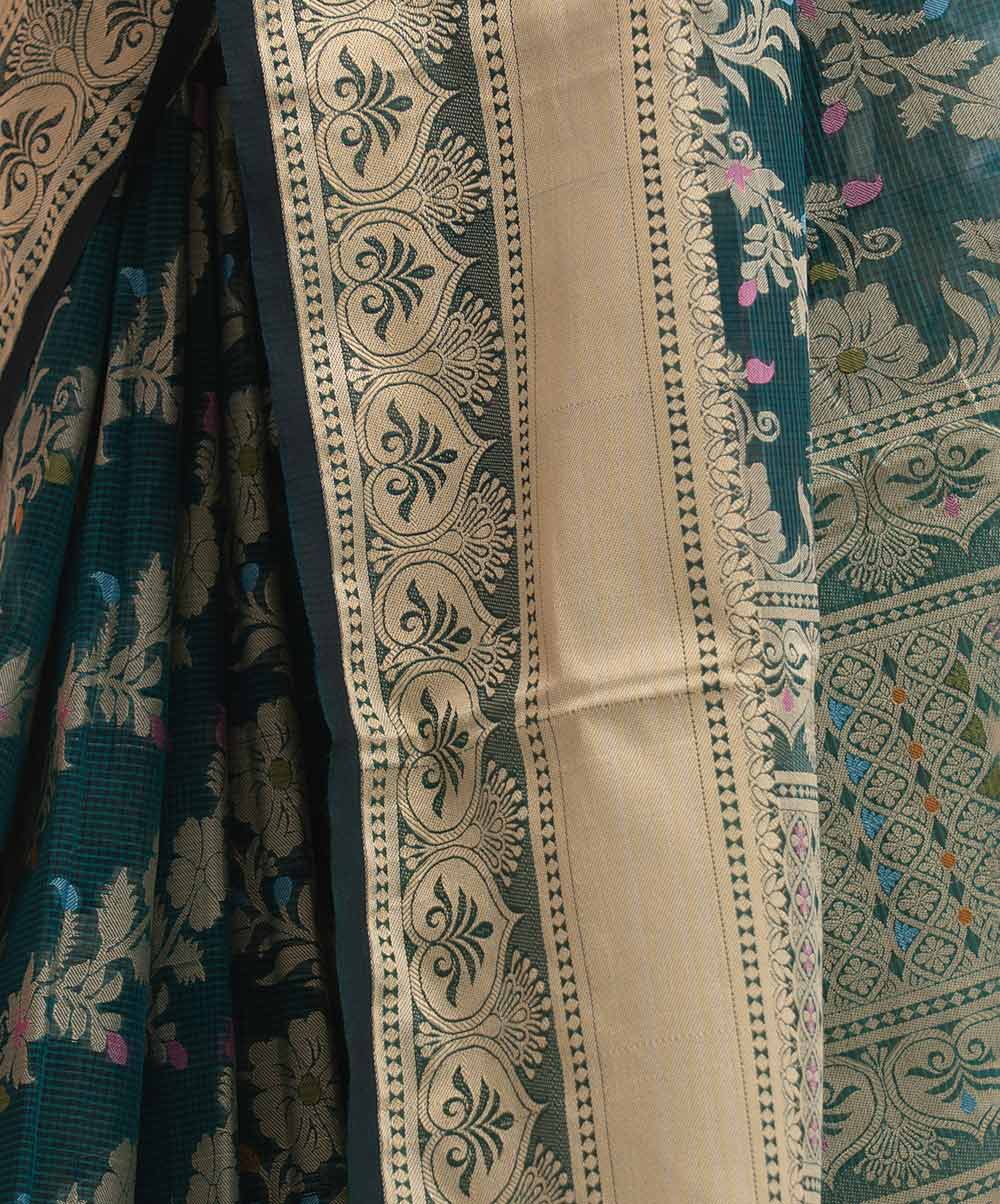 All-over weaving details saree in half-silk fabric. Colorful threads detail at the Aanchal.