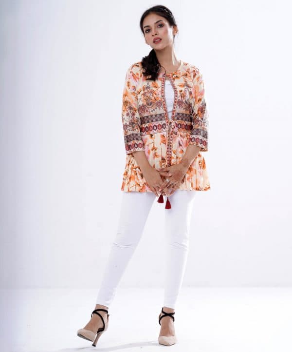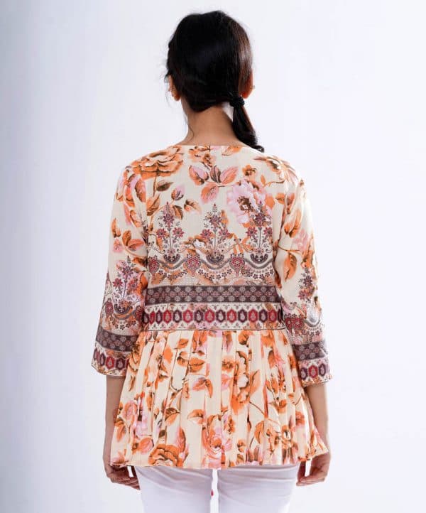Multi-color all-over printed Koti in Crepe Viscose fabric. Designed with a round neck and three-quarter sleeves. Tasseled tie-cord closing at the front. Detailed with patch attachment at the front slit and gathers from the waistline.
