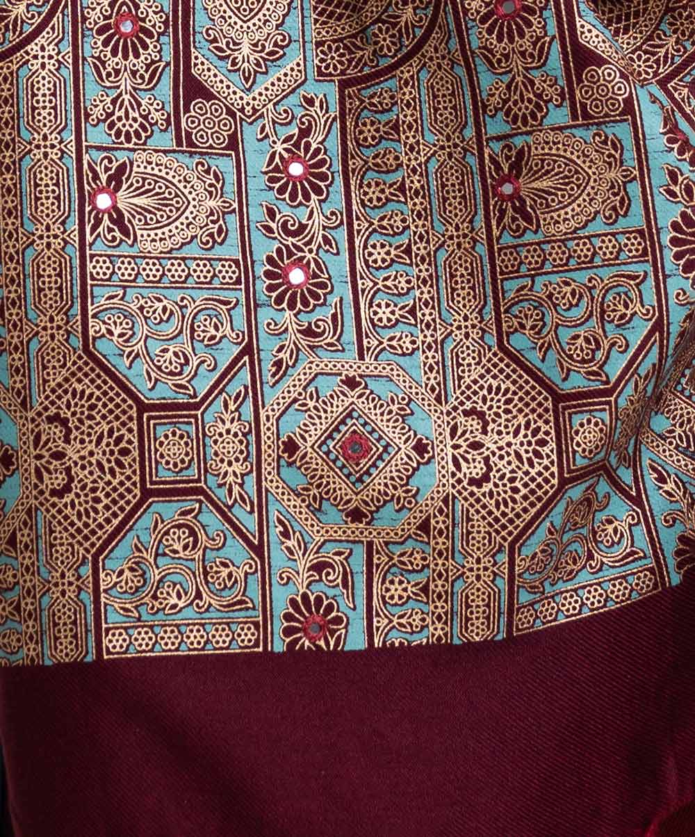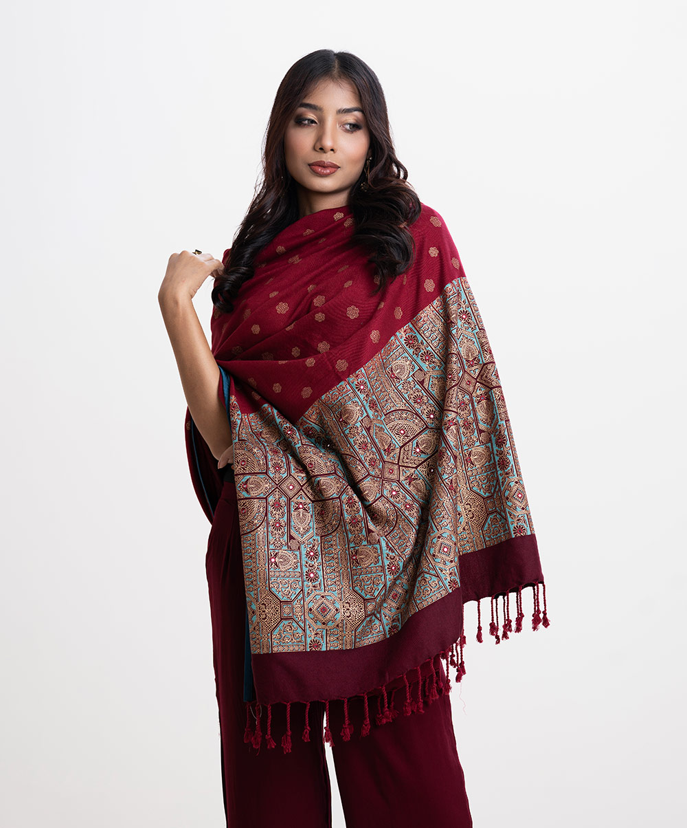 Printed shawl in viscose fabric. Comes with karchupi work and fringe trim at the border.