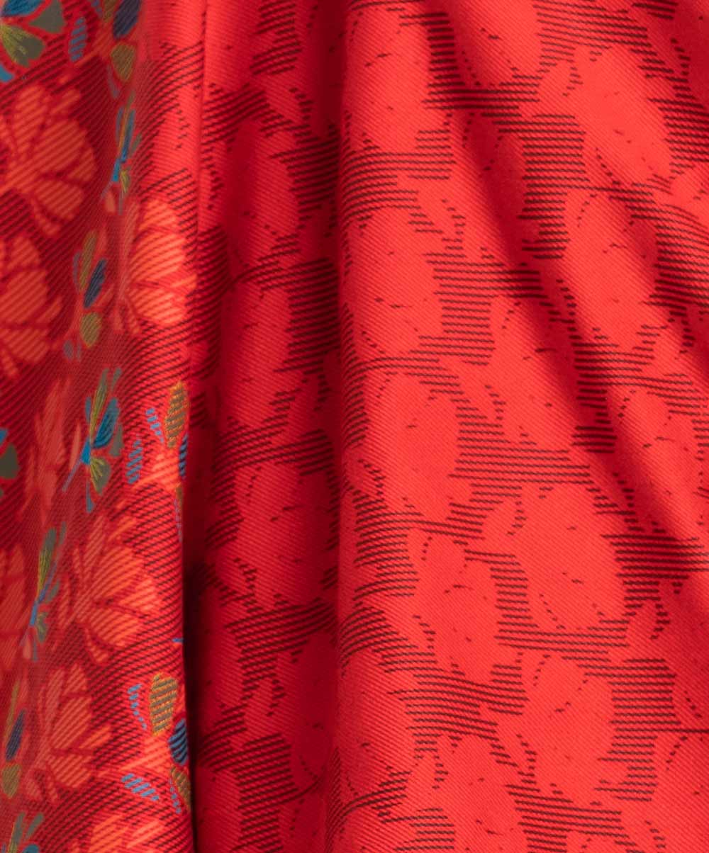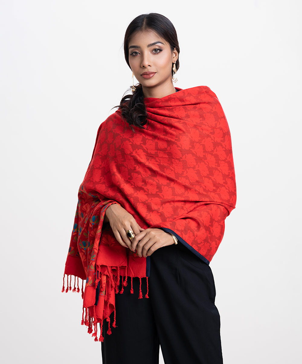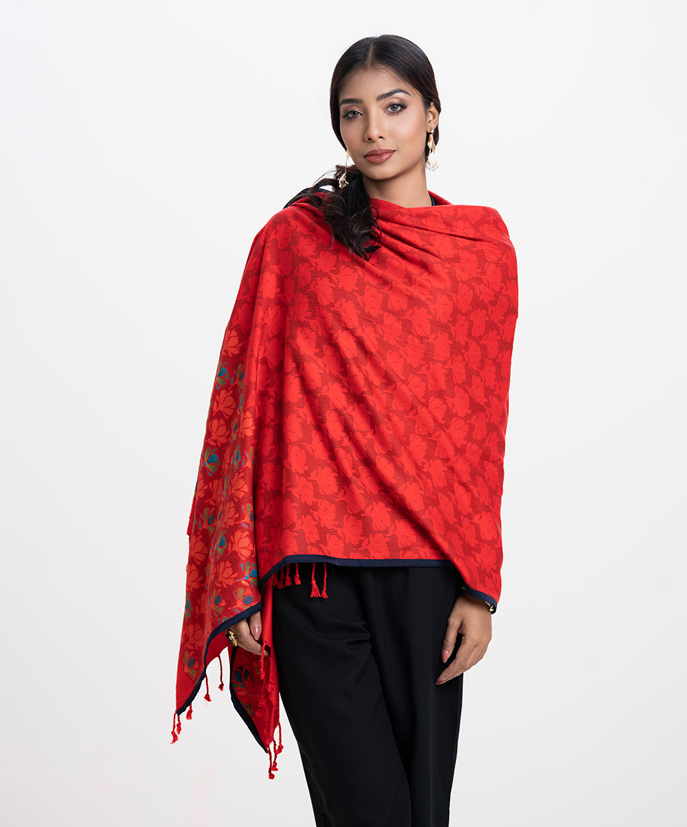 Women’s floral printed shawl in viscose fabric. Comes with embroidery work and fringe trim at the border.