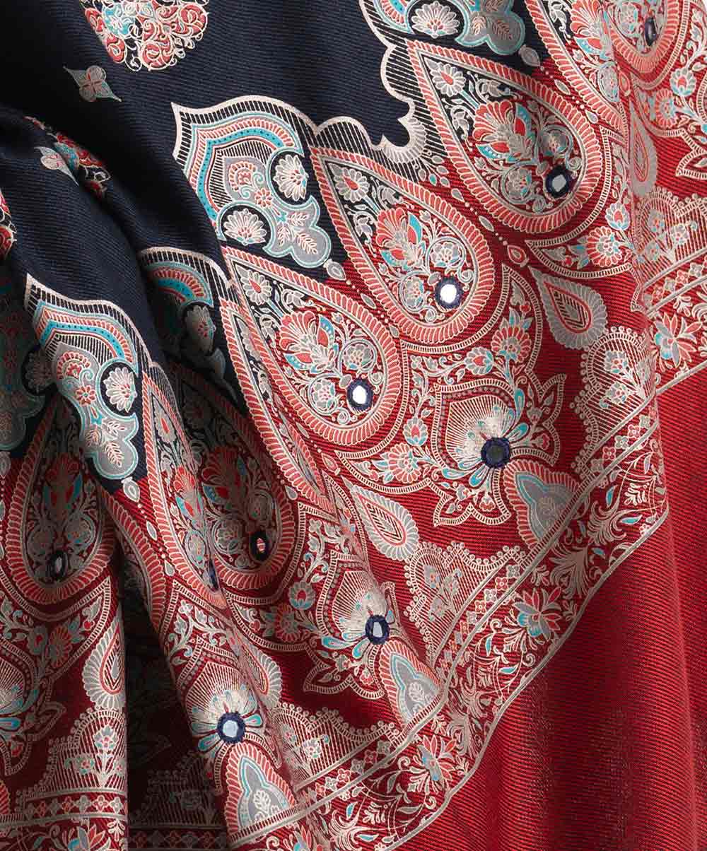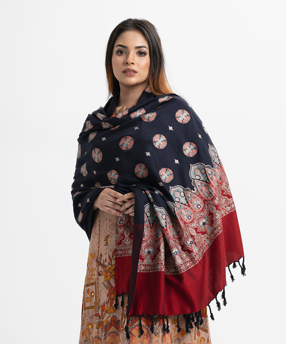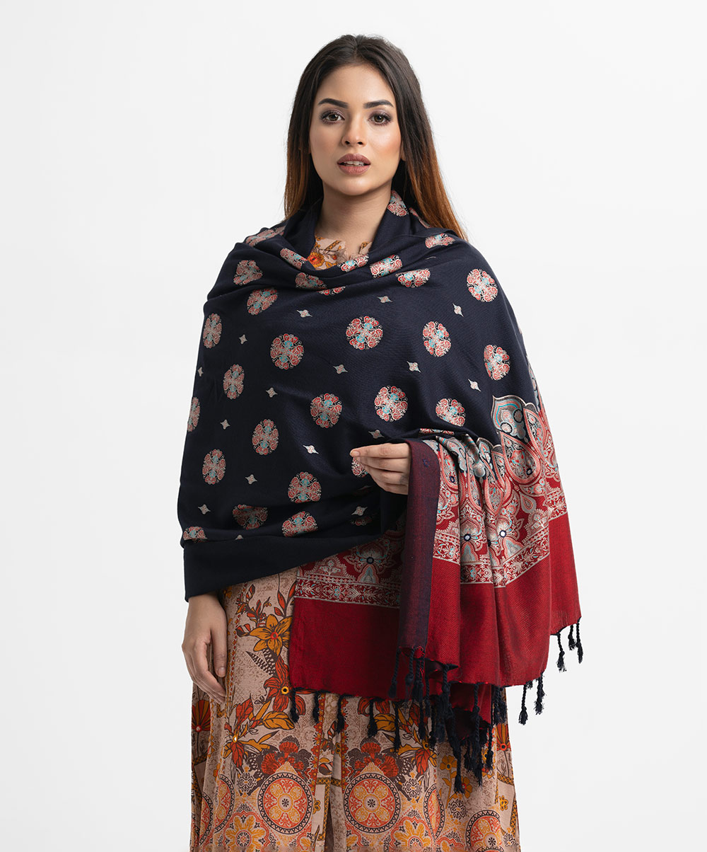 Women’s printed winter shawl in viscose fabric. Comes with karchupi and fringe trim at the border.