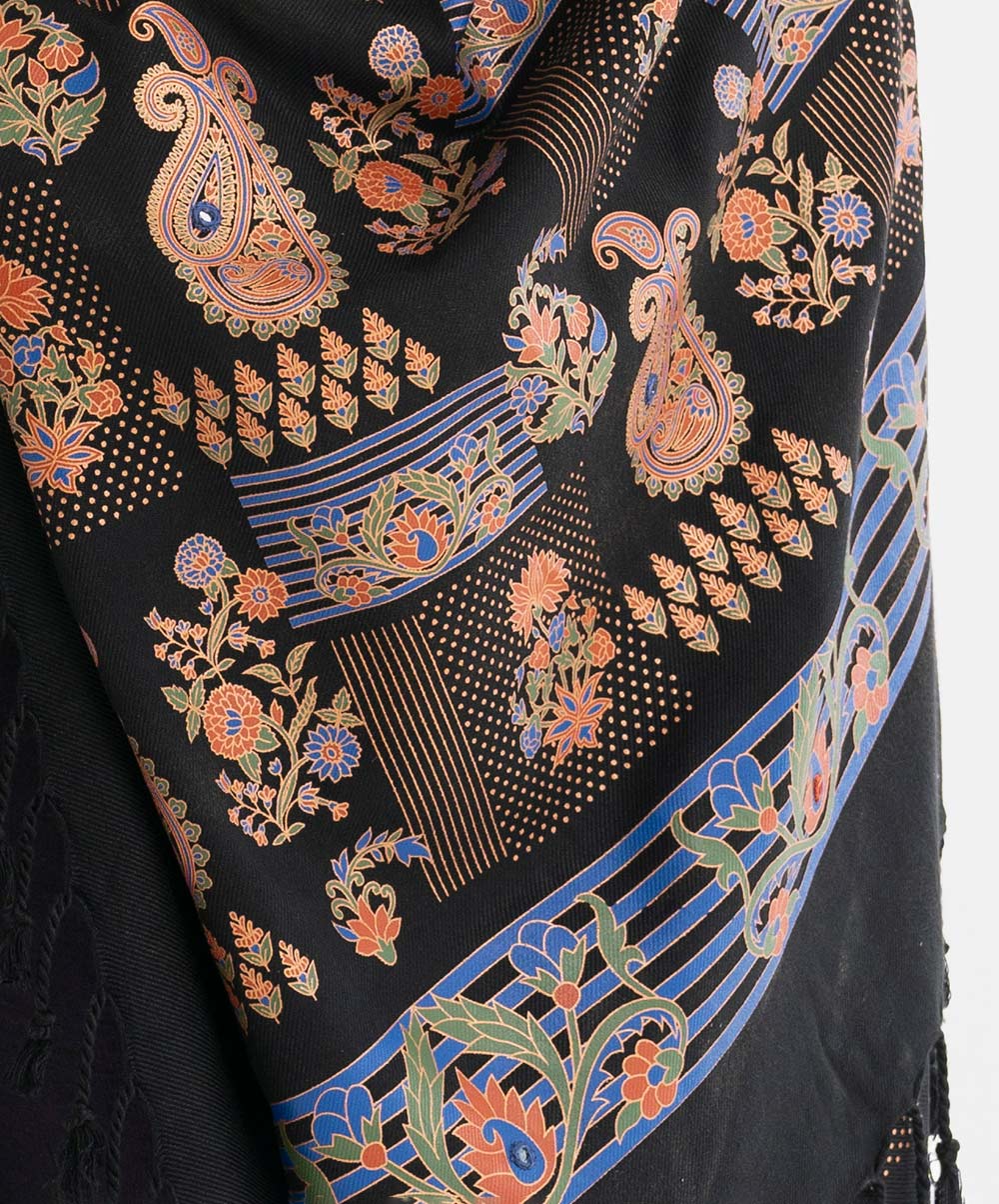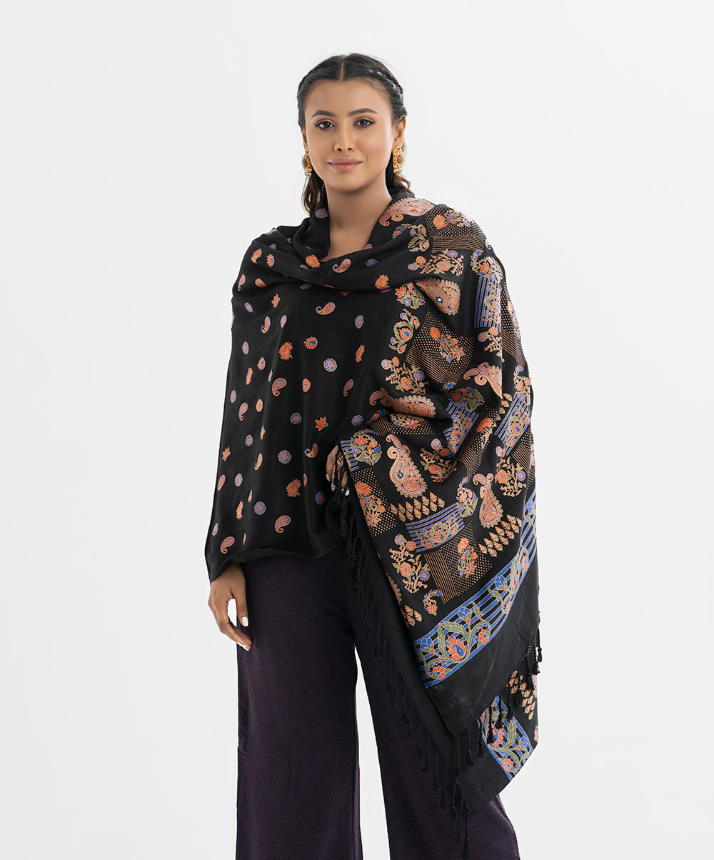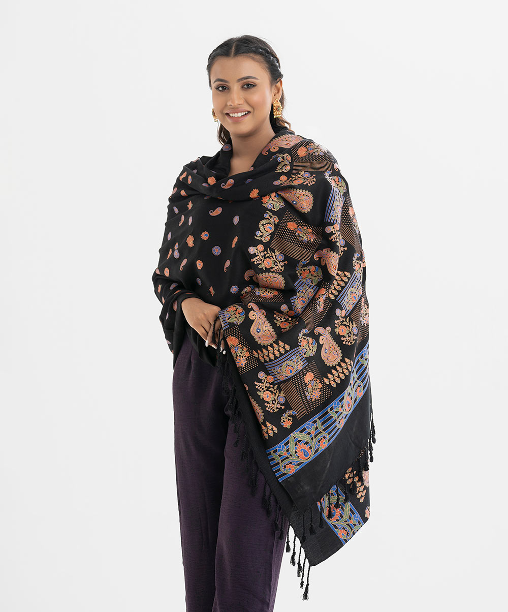 Women’s printed winter shawl in viscose fabric. Comes with karchupi on body & fringe trim at the border.