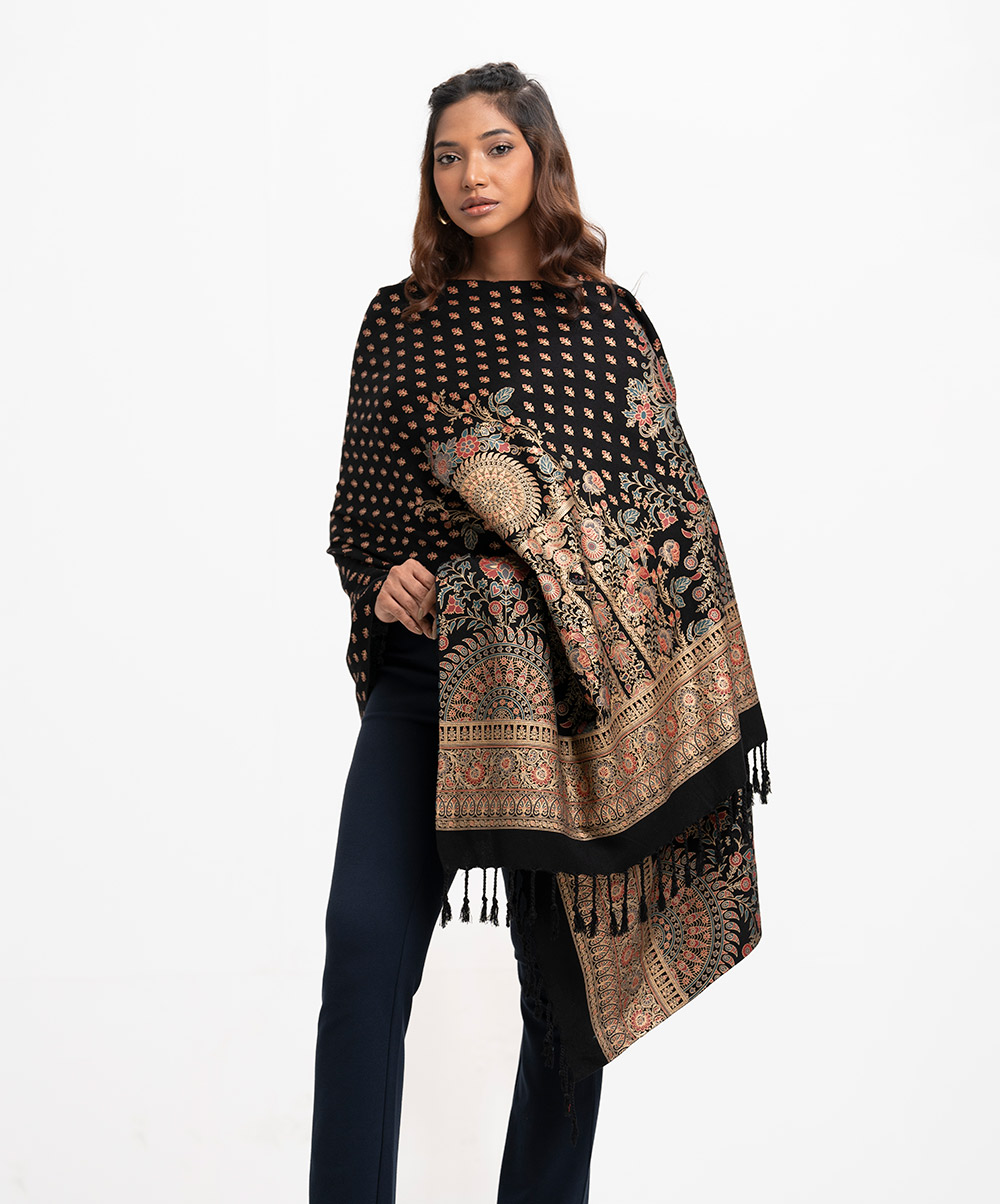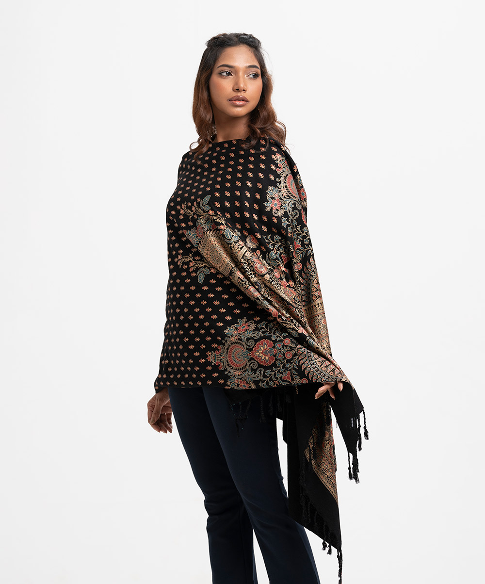 Women’s printed winter shawl in viscose fabric. Comes with fringe trim at the border.