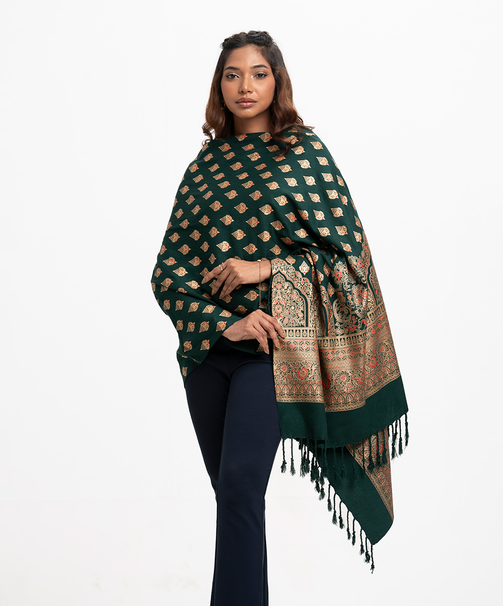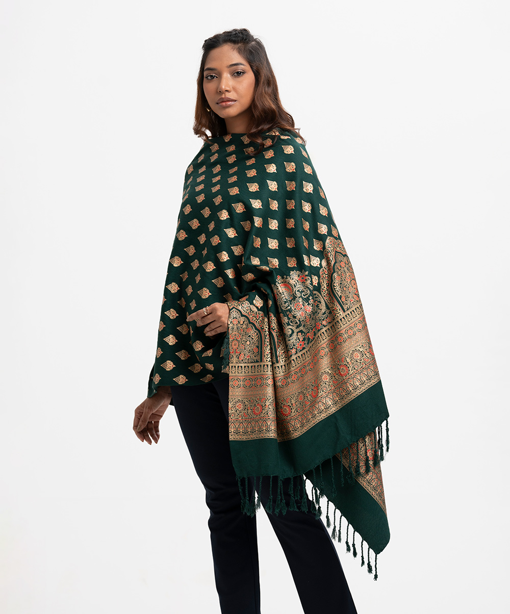Women’s printed winter shawl in viscose fabric. Comes with fringe trim at the border.