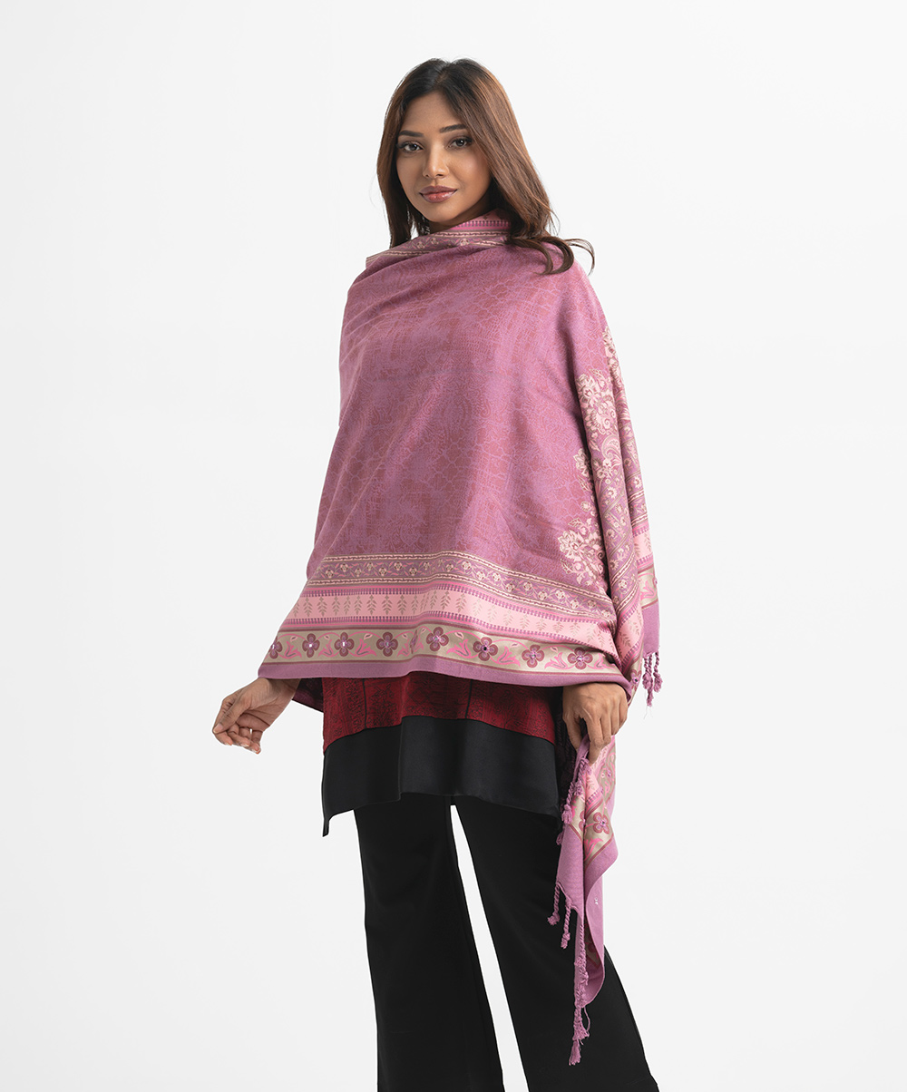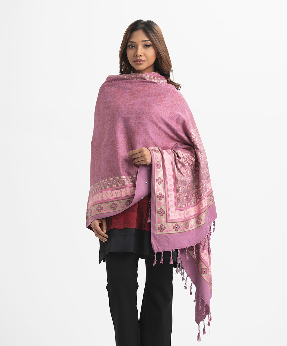 Women’s printed winter shawl in viscose fabric. Comes with karchupi and fringe trim at the border.