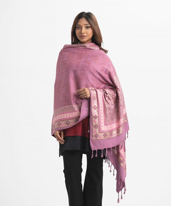 Women’s printed winter shawl in viscose fabric. Comes with karchupi and fringe trim at the border.