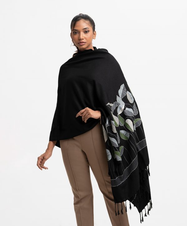 Women’s printed shawl in cotton viscose fabric. All-over embroidery and fringe trim.