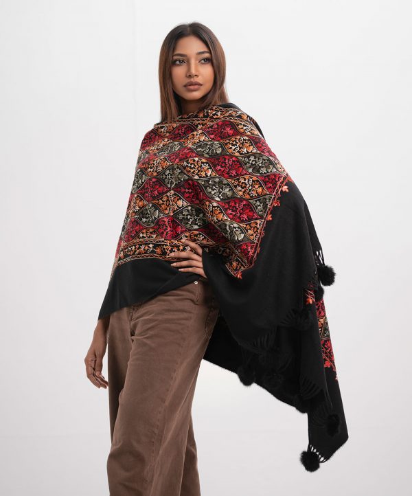 Women’s shawl in woolen fabric. Comes with embroidery and pom pom tassels at the border.