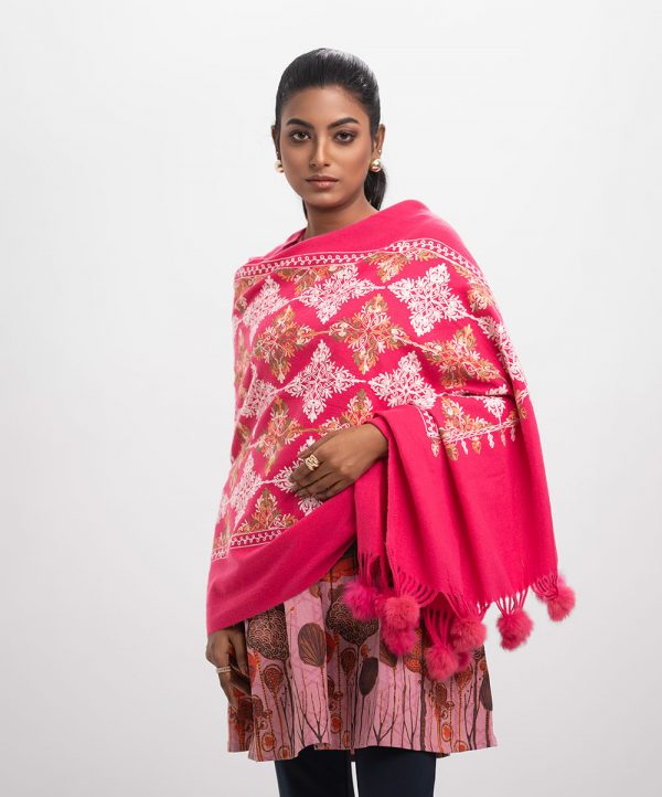 Women’s shawl in woolen fabric. Comes with embroidery and pom pom tassels at the border.