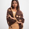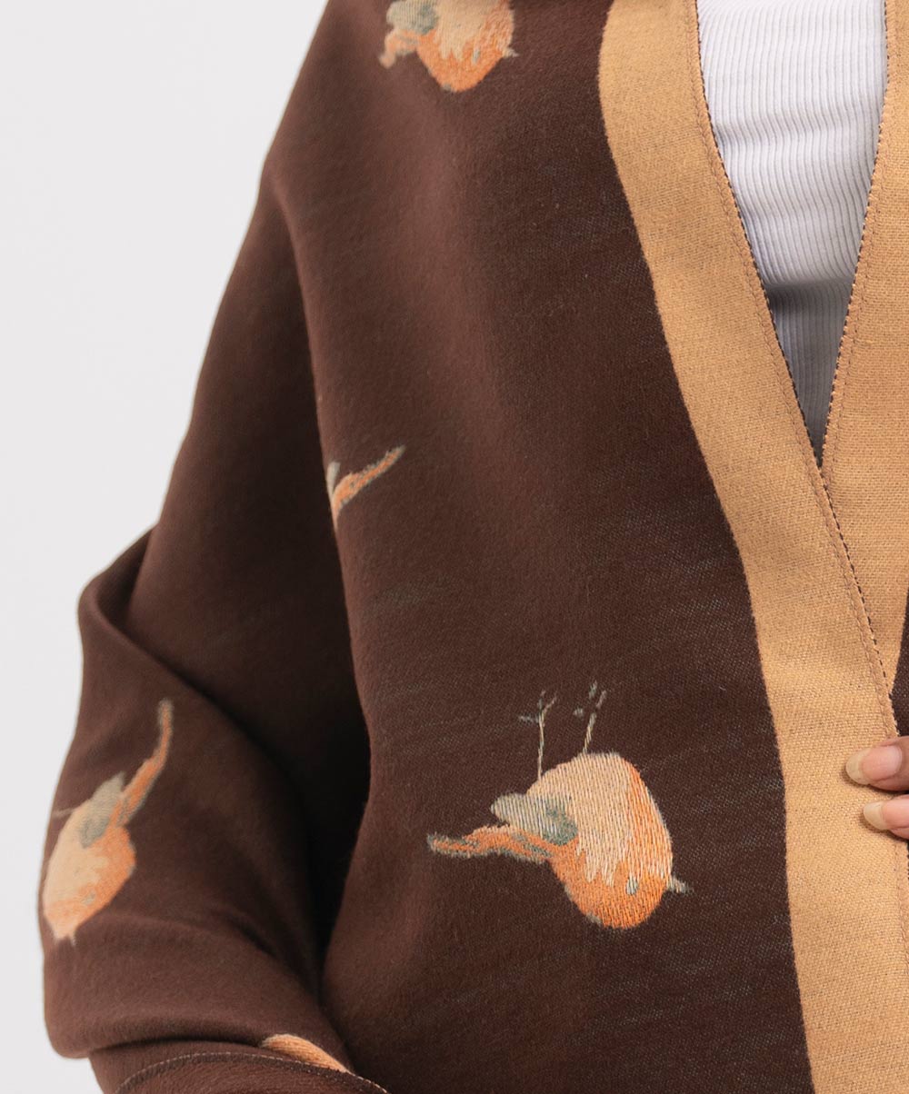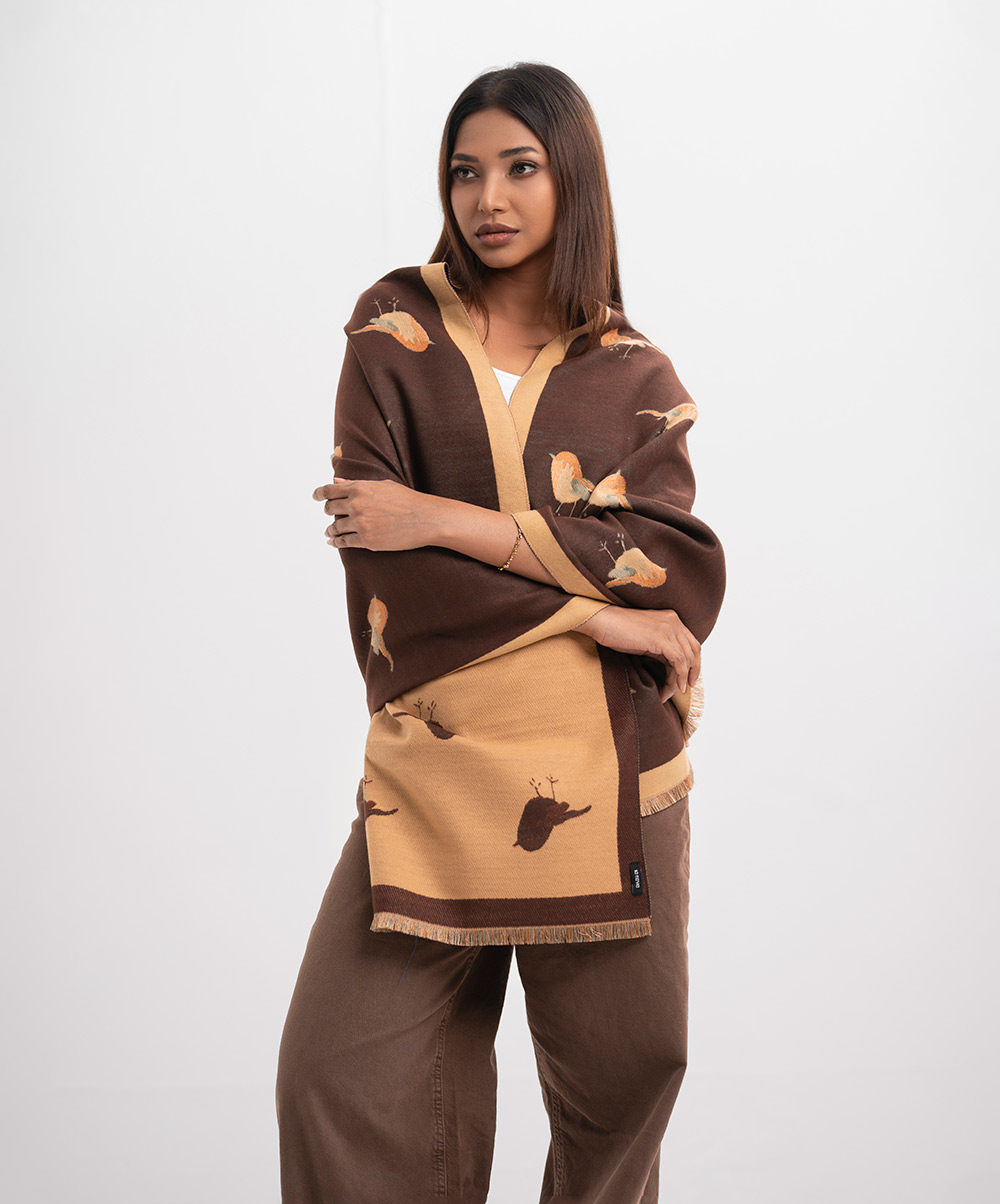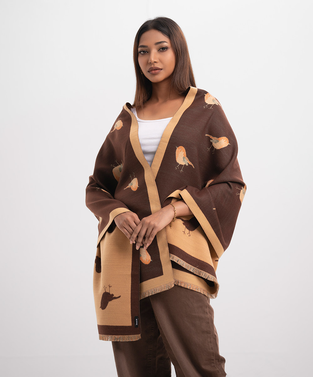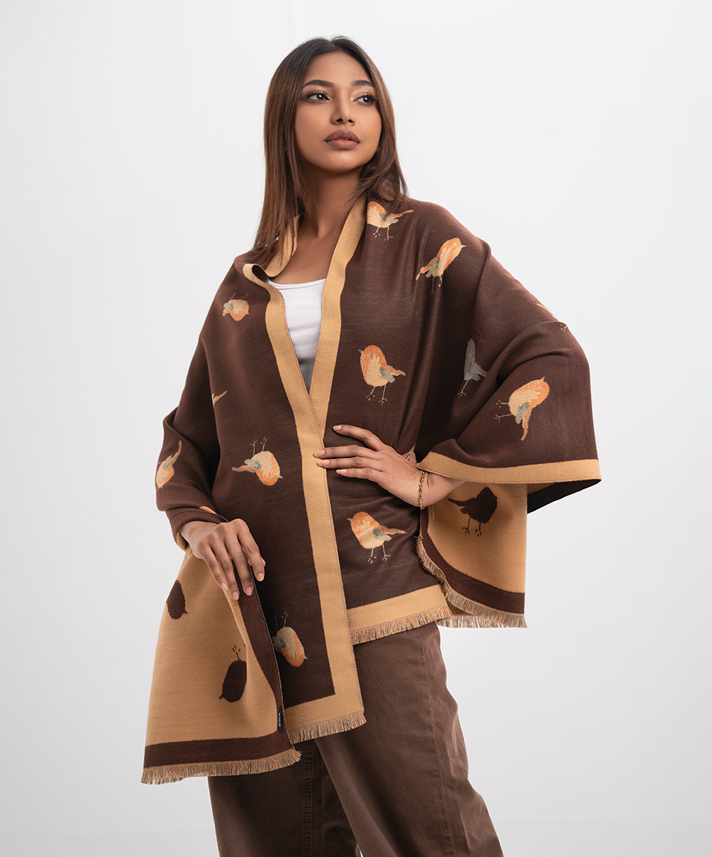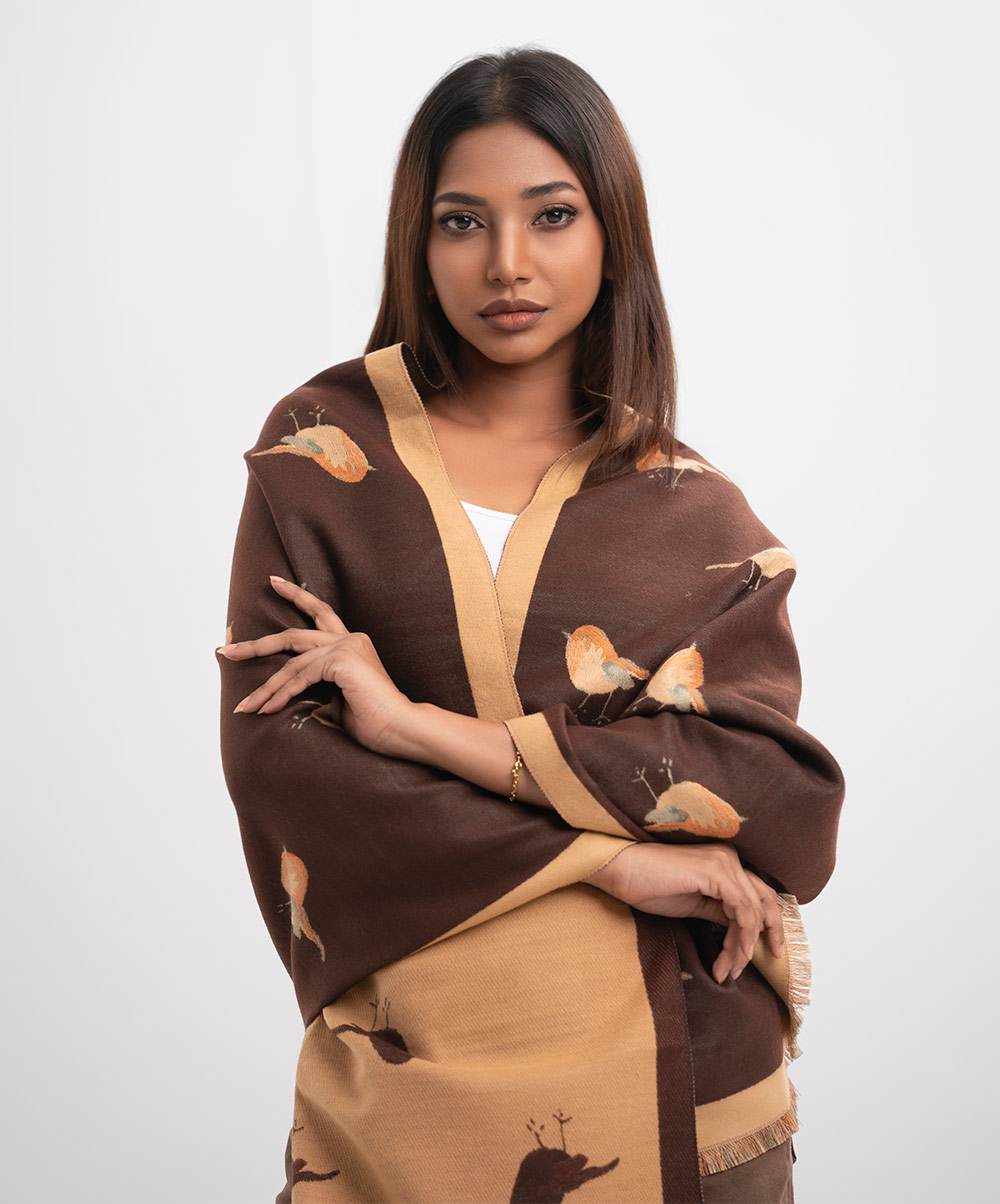 Women’s winter shawl in woolen fabric. All over woven bird pattern.