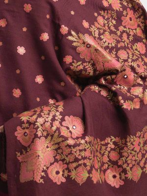 Women’s shawl in woolen fabric. Comes with embroidery and pom pom tassels at the border.