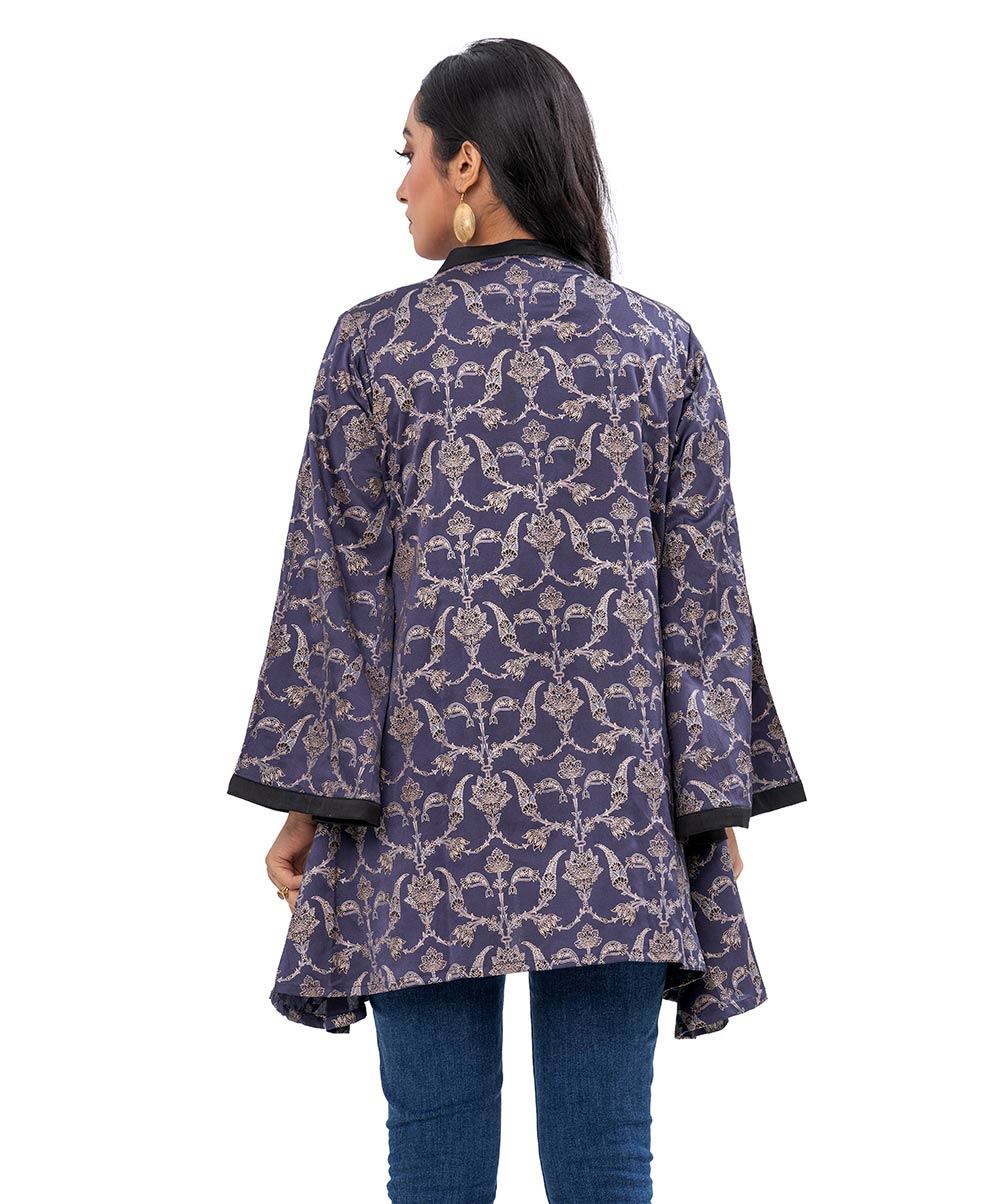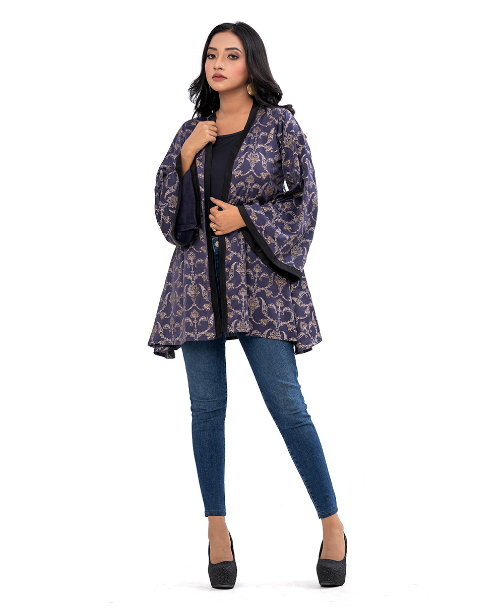 Gray all-over printed Shrug in Crepe fabric with kimono sleeves.