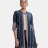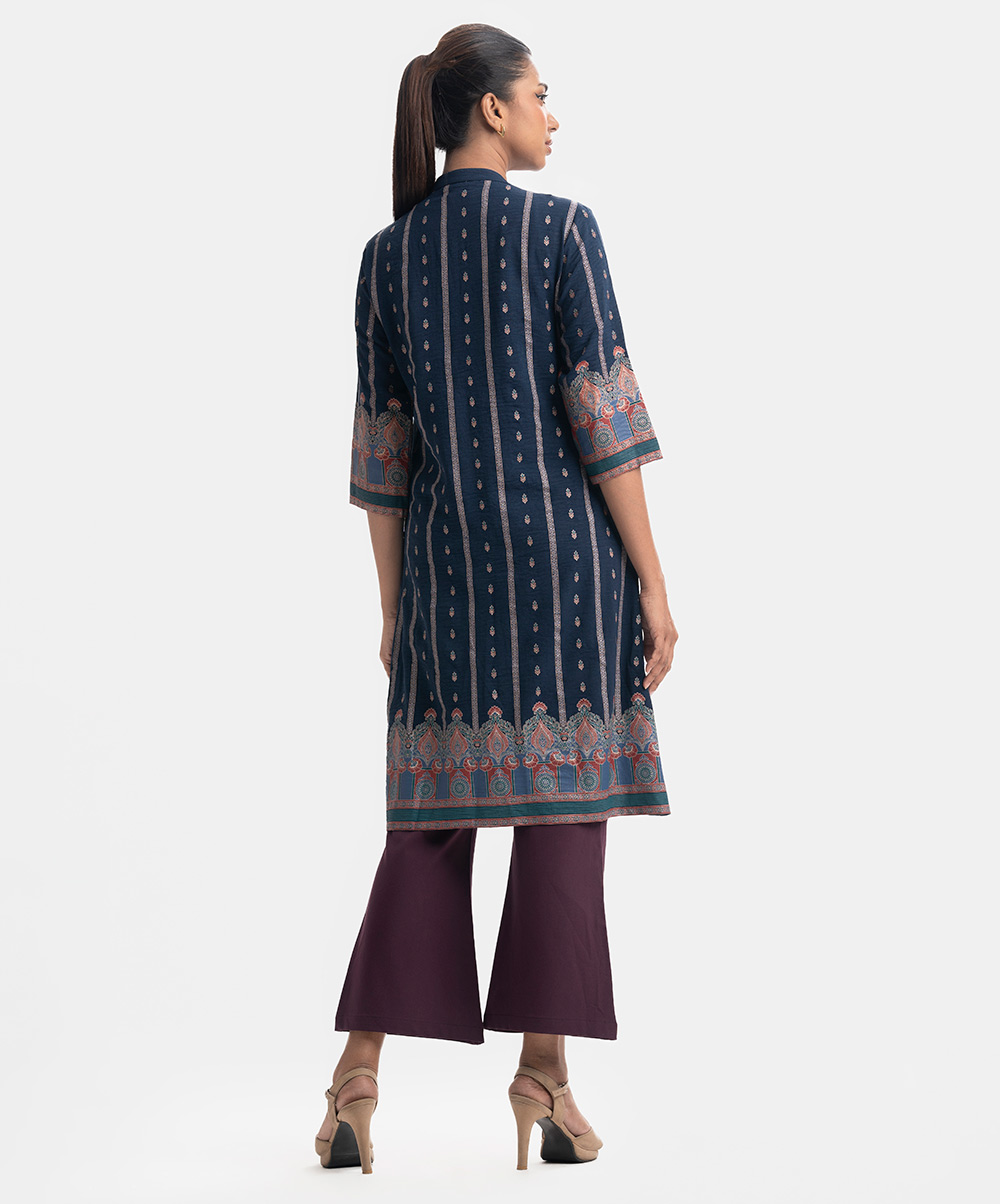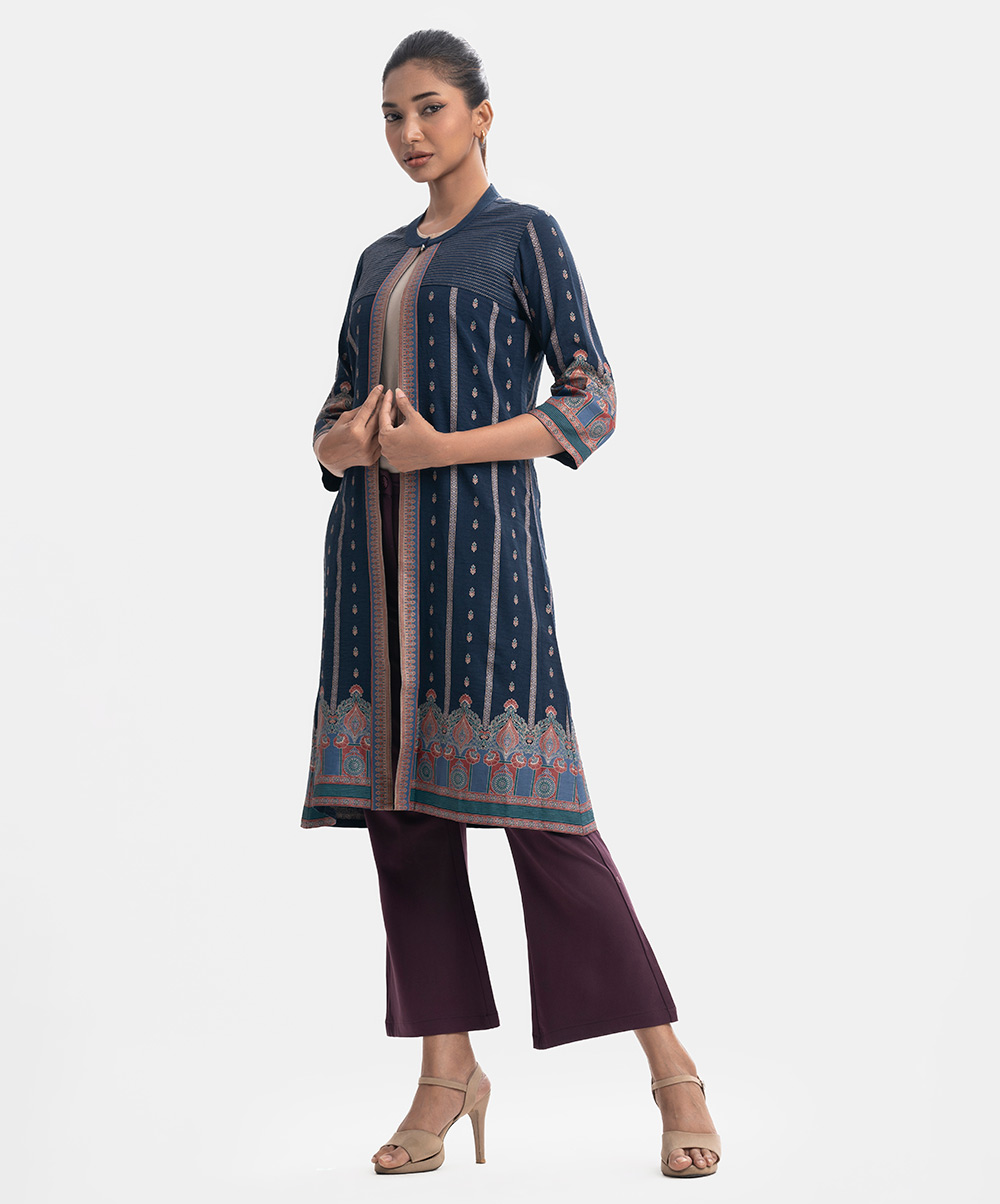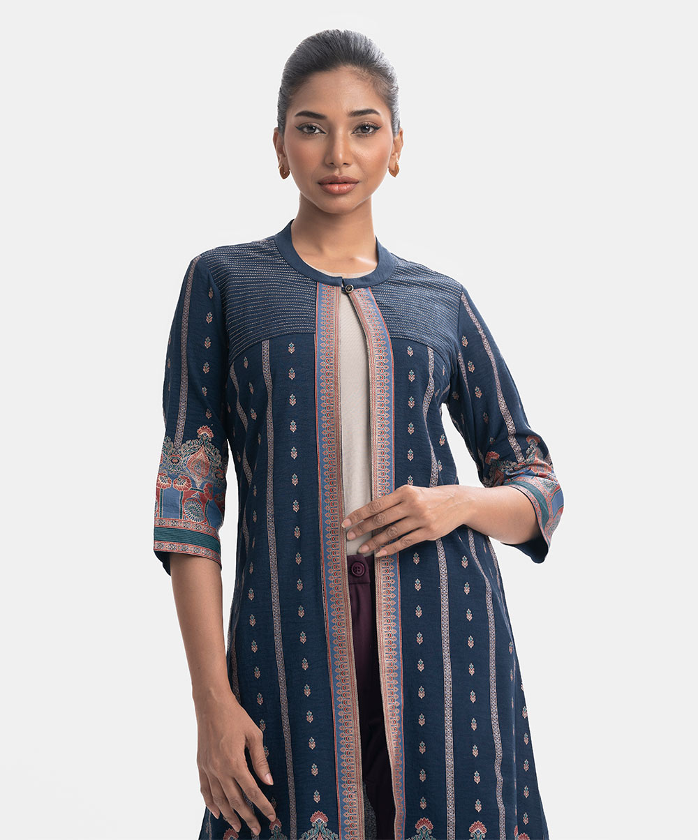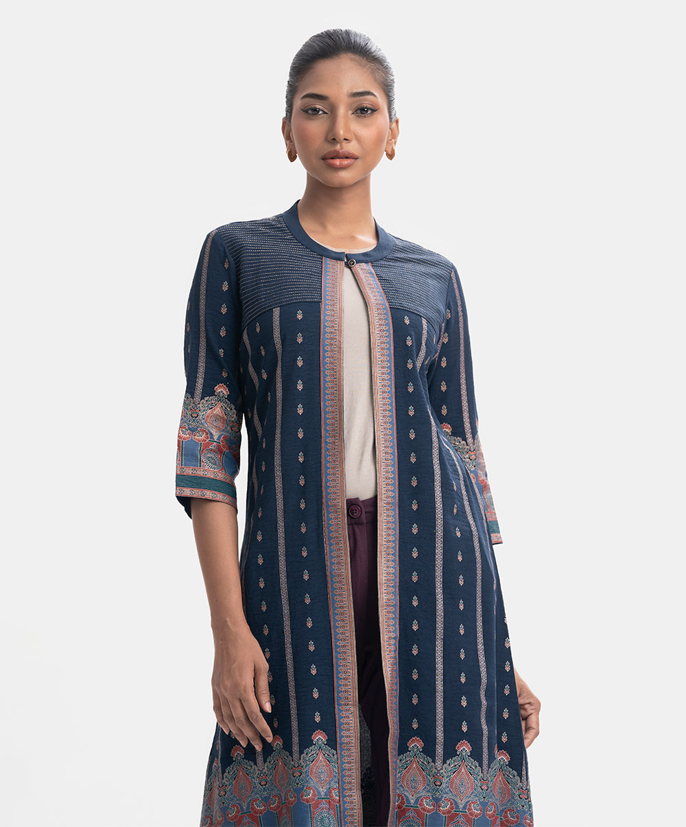 Single-button long shrug in blended georgette fabric. Patterned. Three-quarter sleeves.