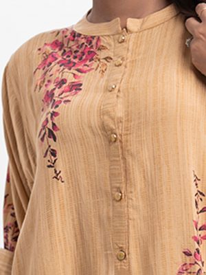 Brown ladies shirt in printed Georgette fabric. Designed with a band collar, front button opening and bishop sleeves.