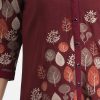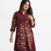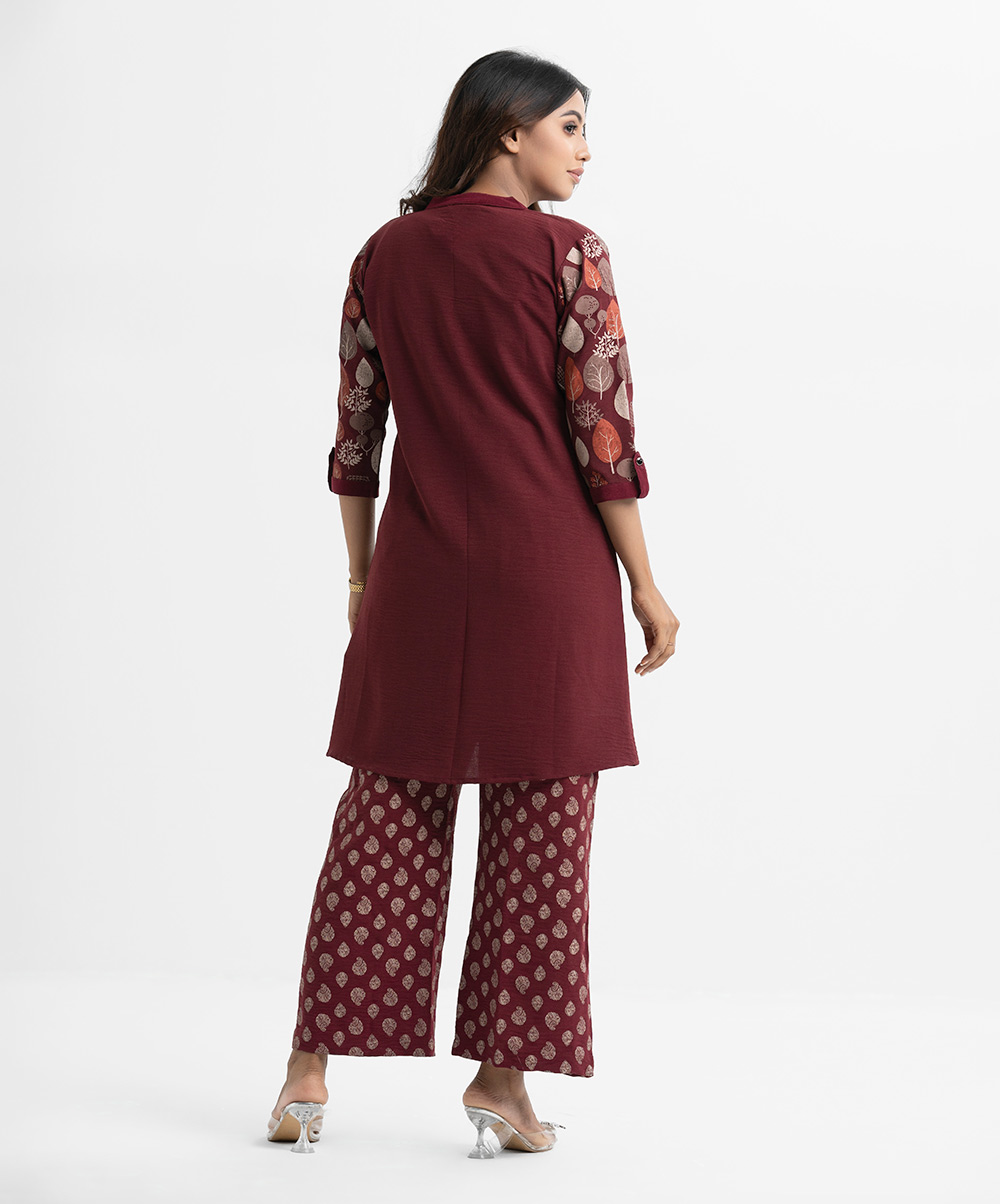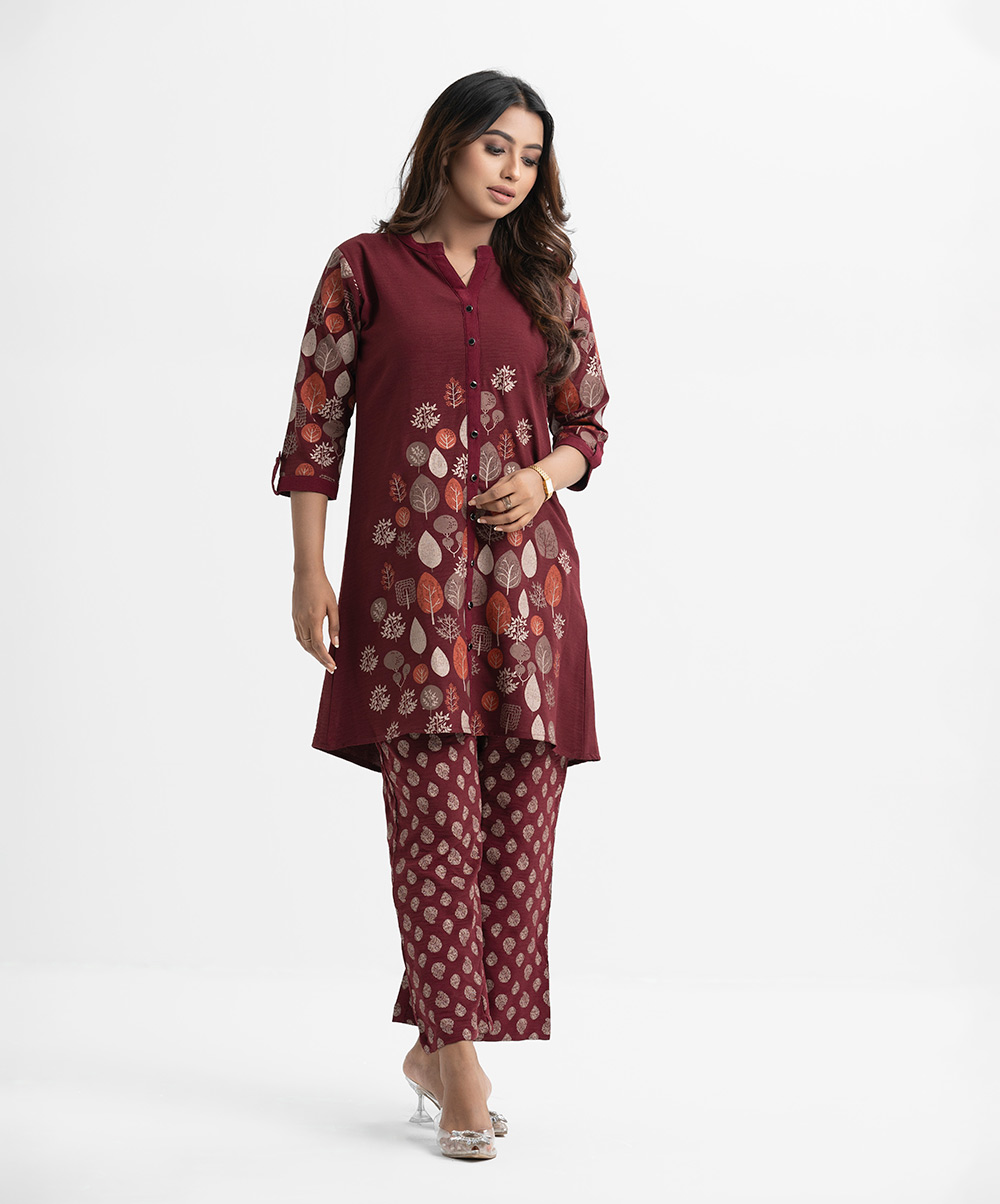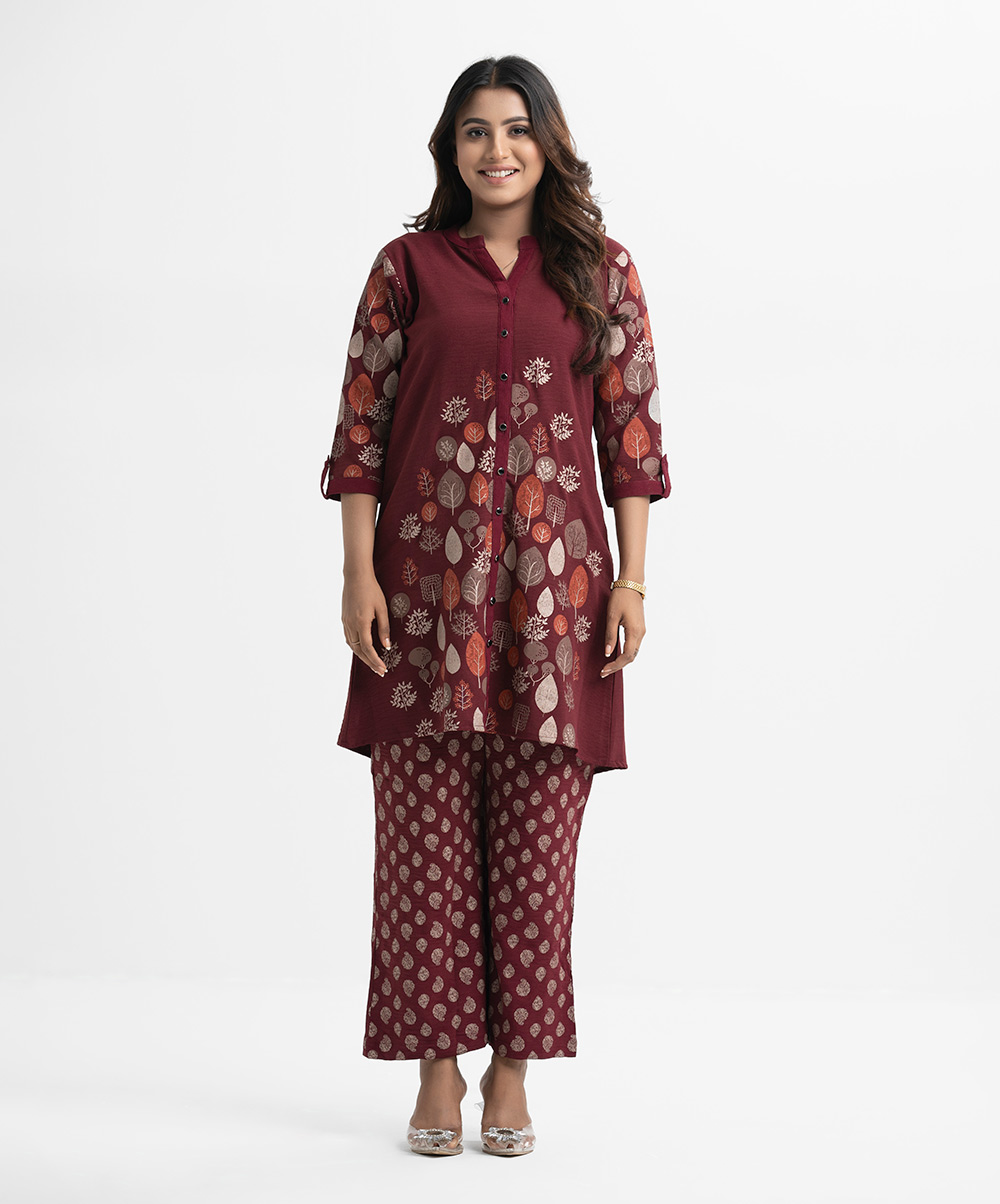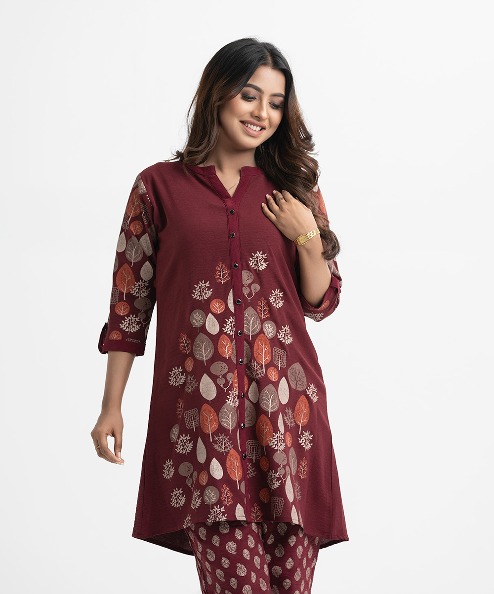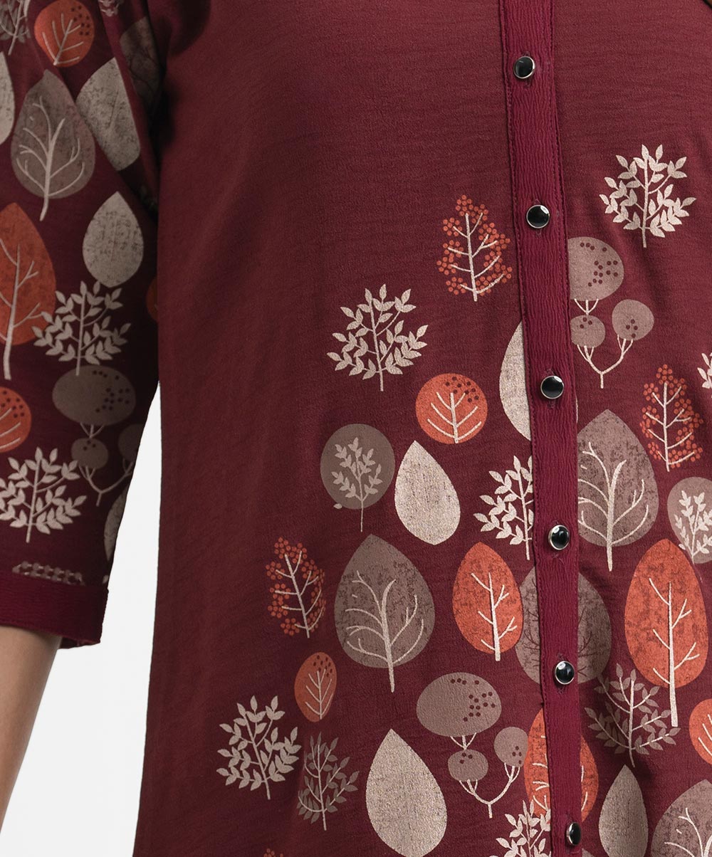 Ladies’ printed shirt in viscose fabric. Stand collar, three-quarter sleeves. Buttons fastening at front. Inseam side pockets.