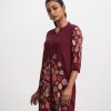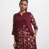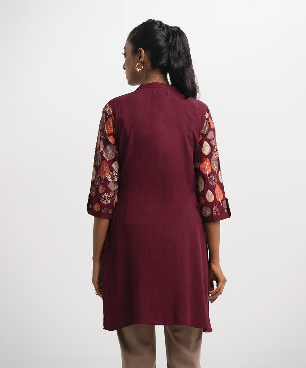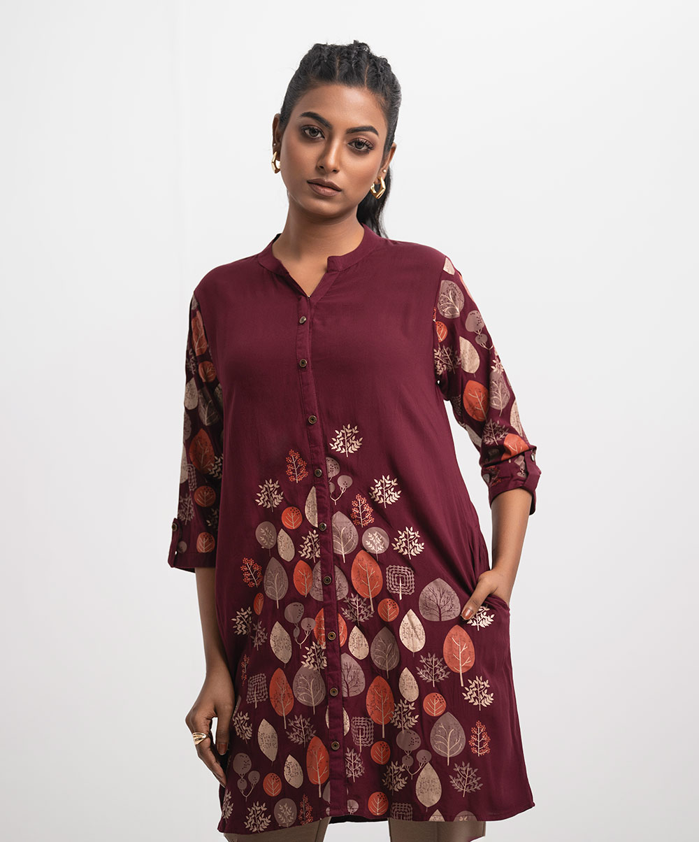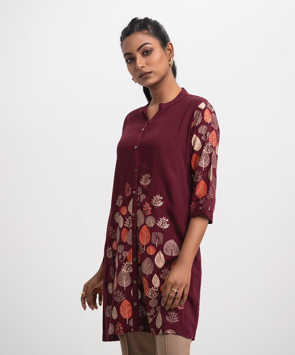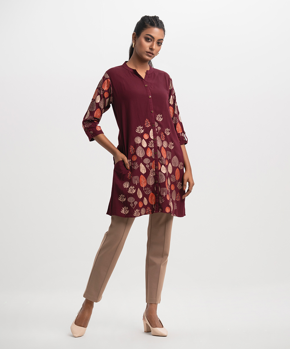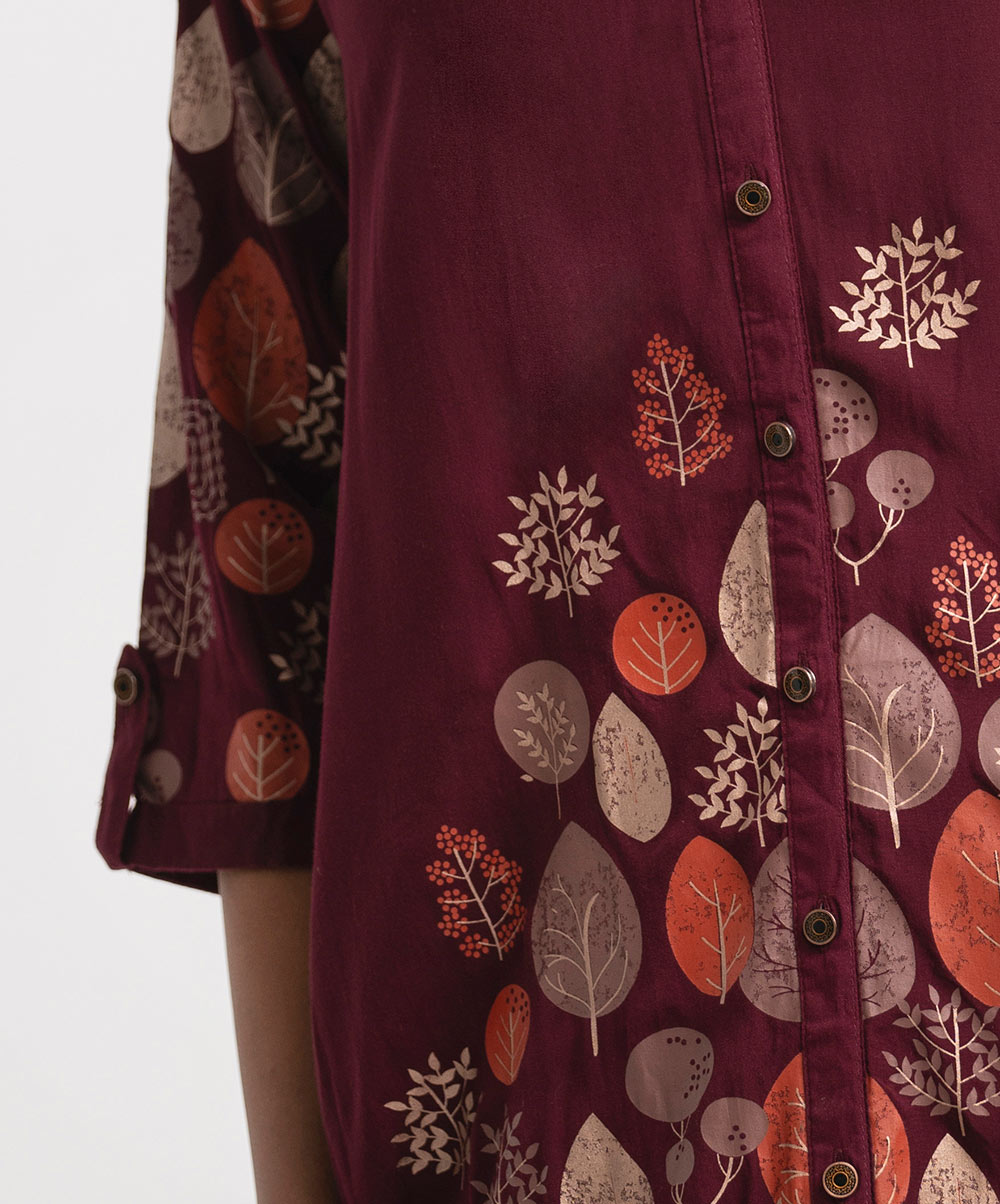 Ladies’ printed shirt in viscose fabric. Stand collar, three-quarter sleeves. Buttons fastening at front. Inseam side pockets.