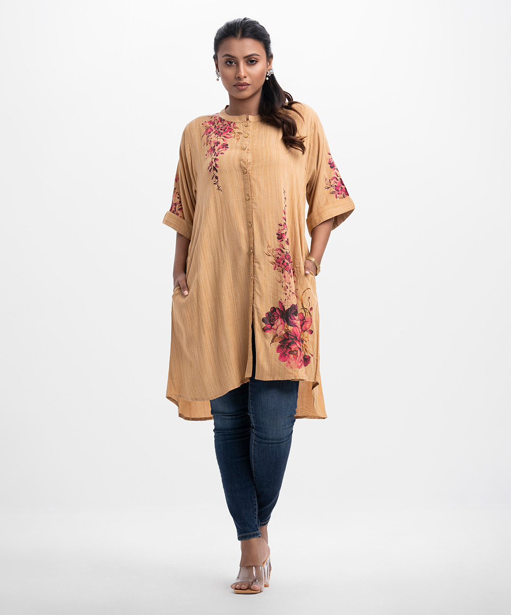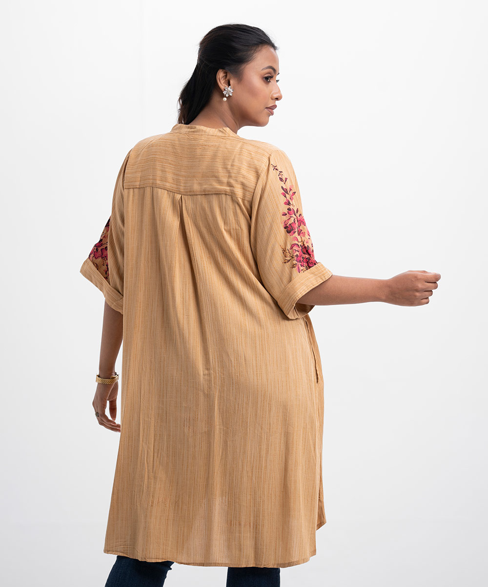 High-low hem shirt in viscose fabric.Band collar, three-quarter sleeves with folded cuffs.Inseam side pockets.