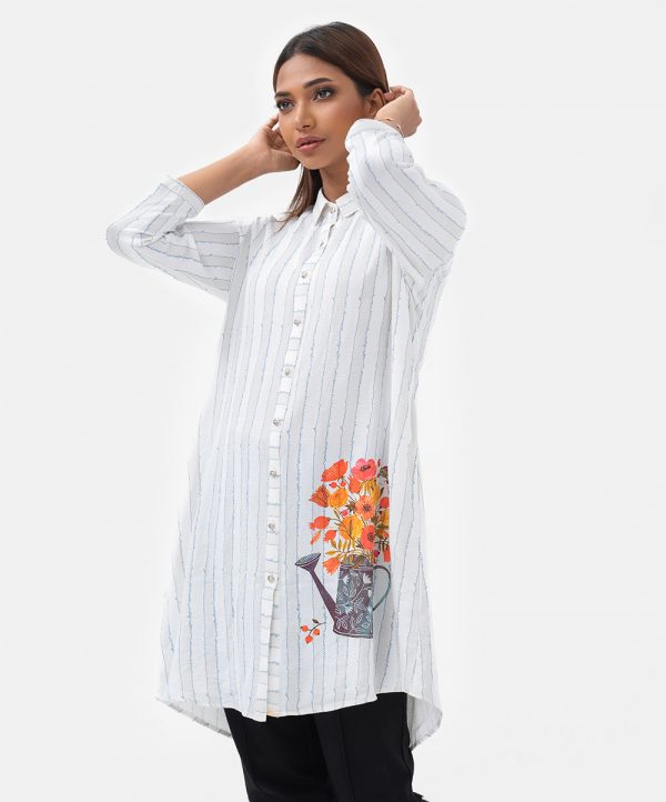 Ladies’ printed long shirt in georgette fabric. Classic collar, three-quarter sleeves and button fastening at the front.