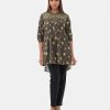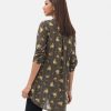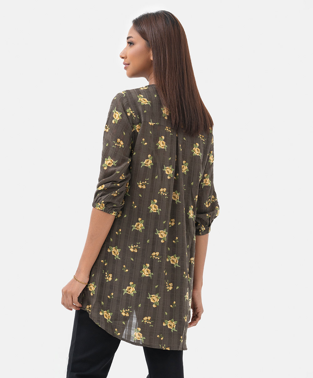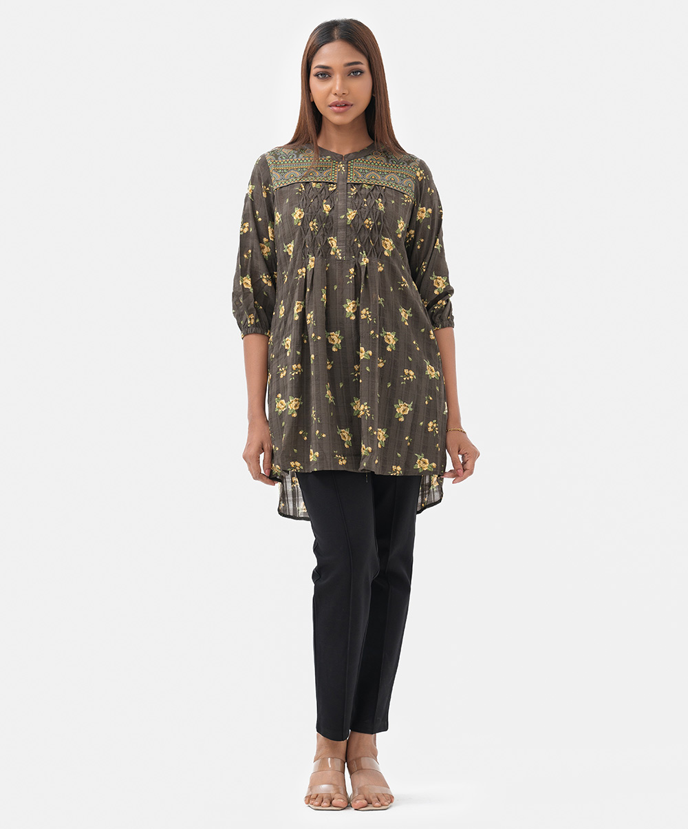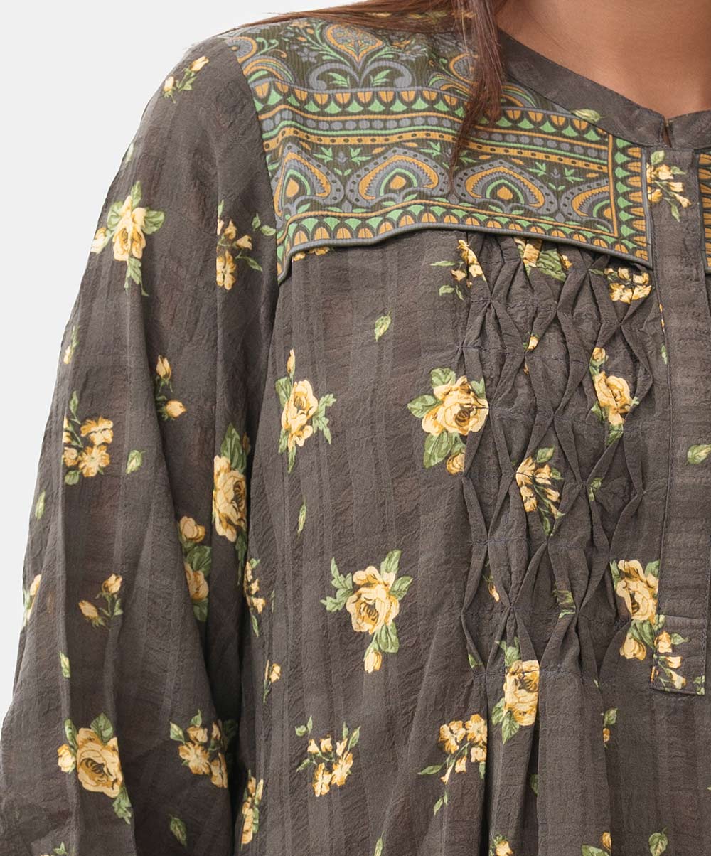 Women’s printed shirt in blended fabric. Stand collar, three-quarter sleeved. Patched and diamond pintuck at the front.