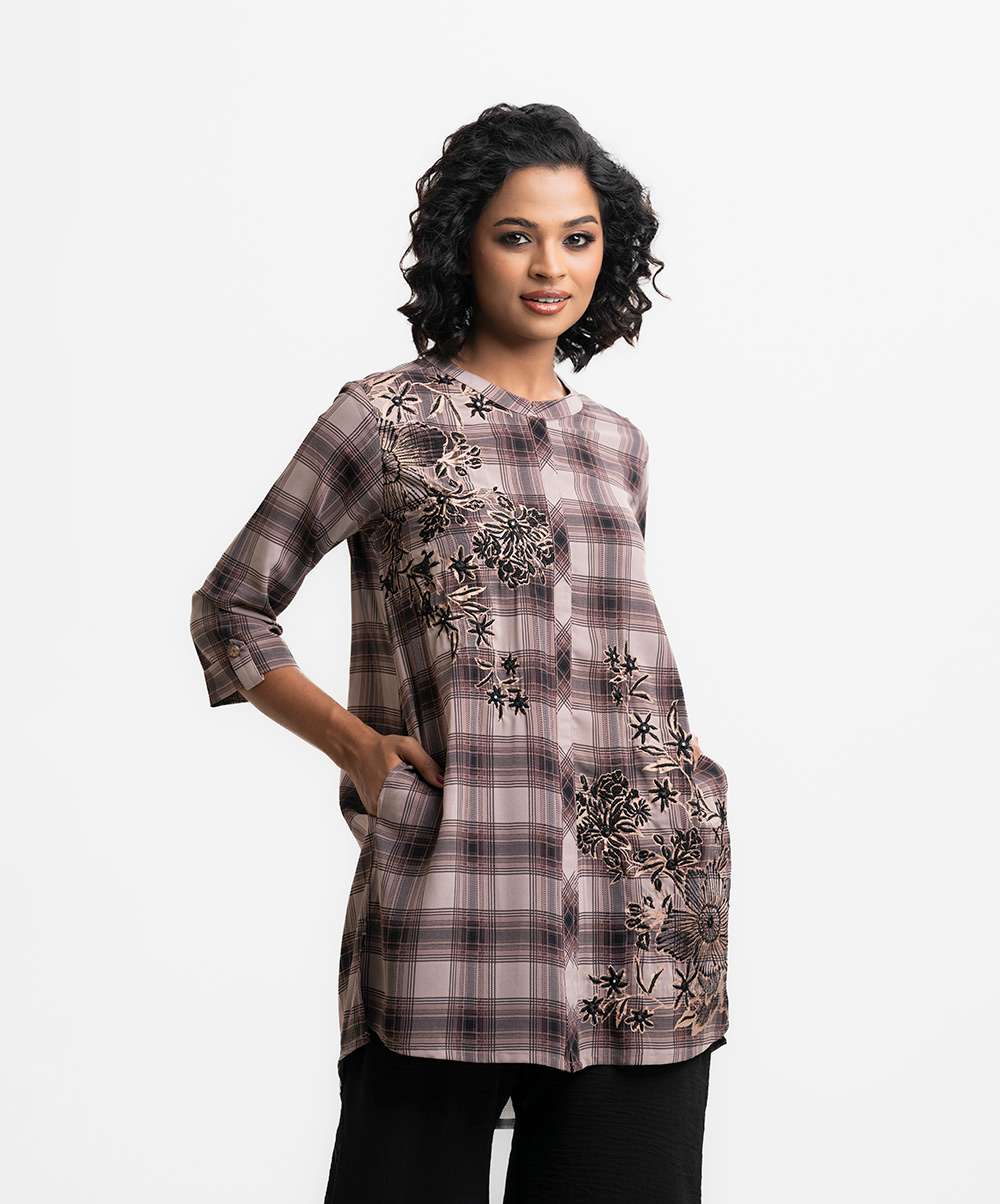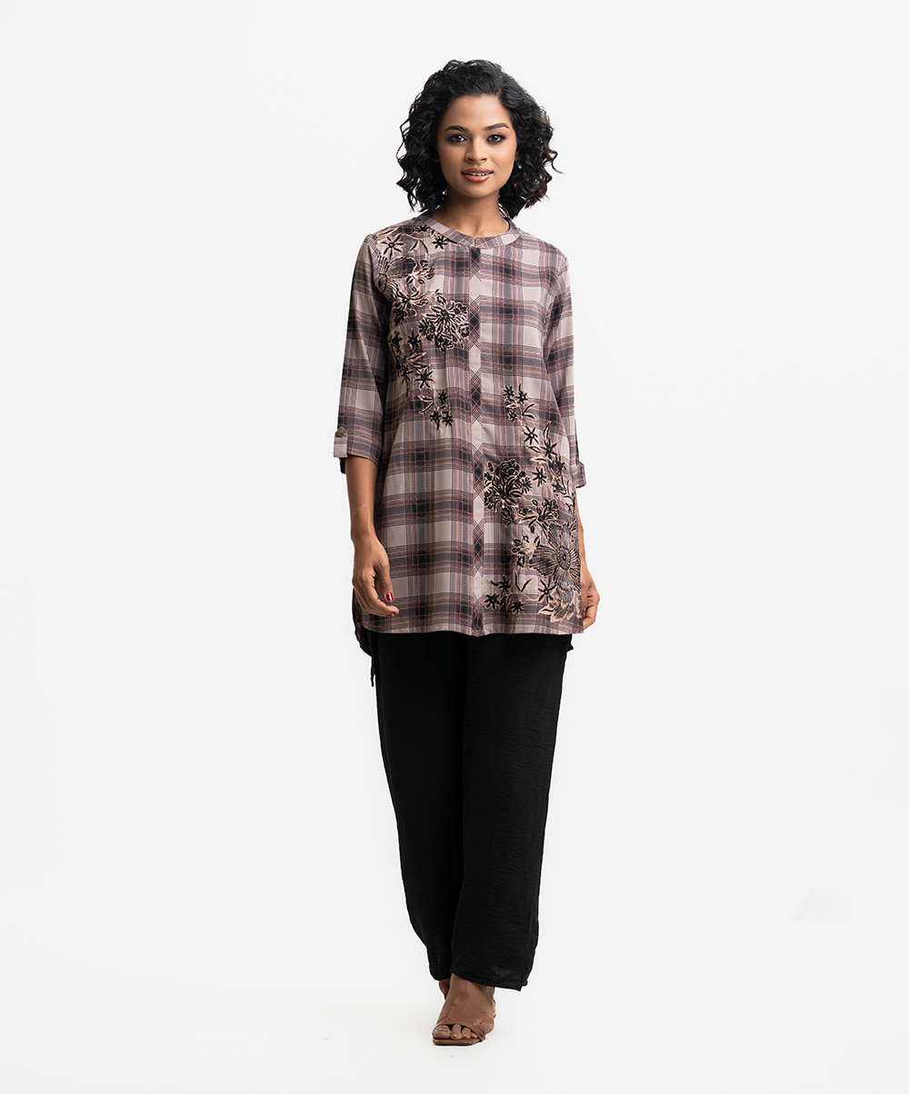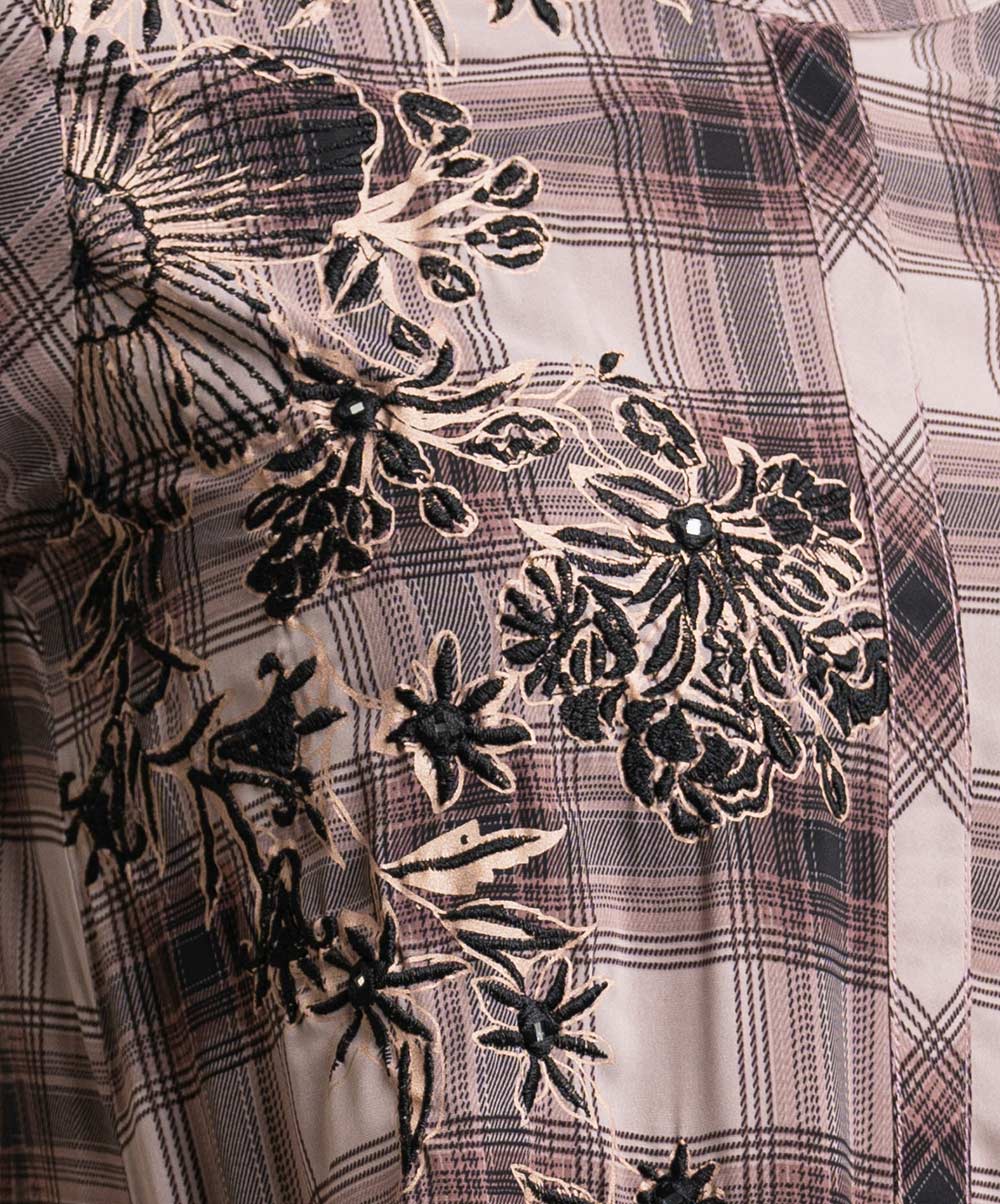Band collar shirt in check georgette fabric. Embroidery at the front. Three-quarter folded cuff sleeves.