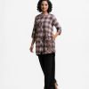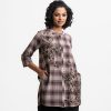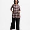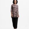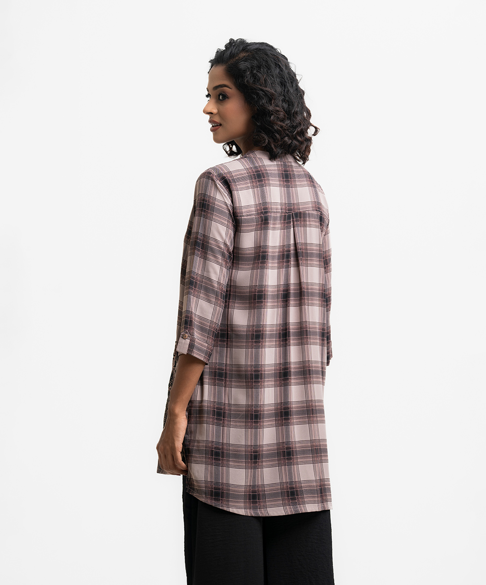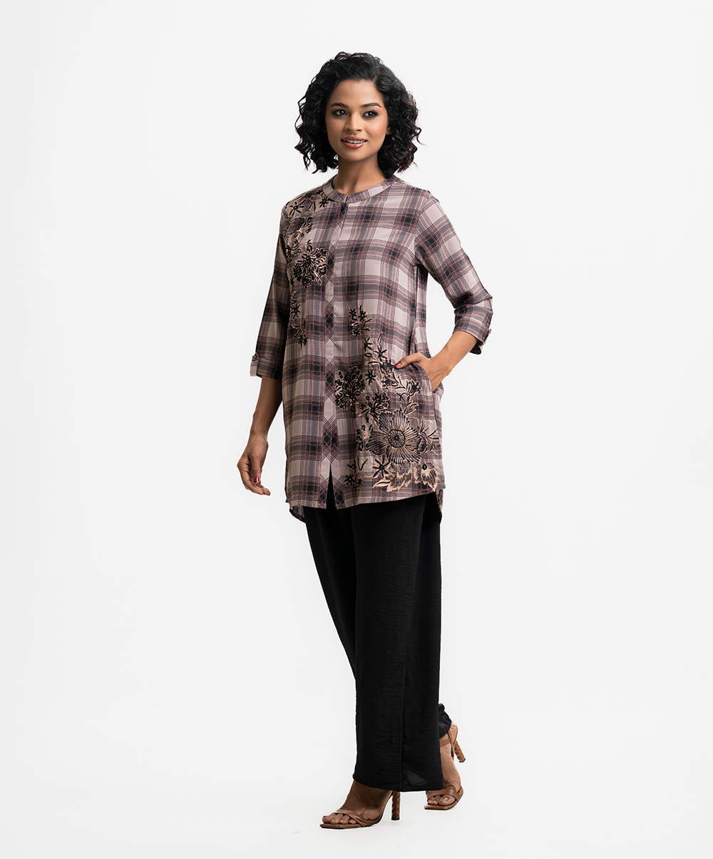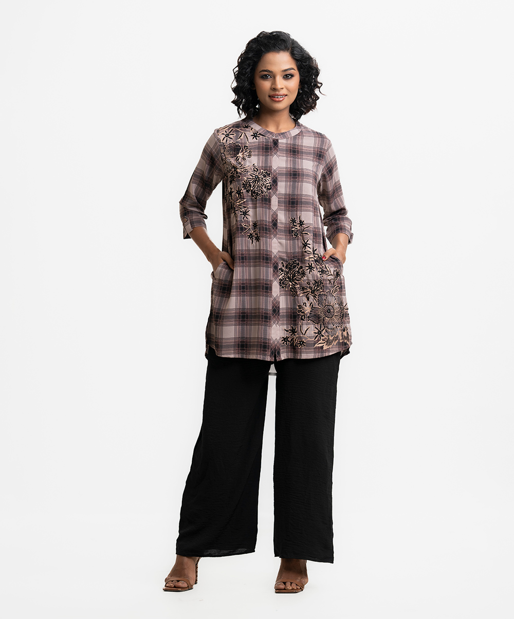Band collar shirt in check georgette fabric. Embroidery at the front. Three-quarter folded cuff sleeves.